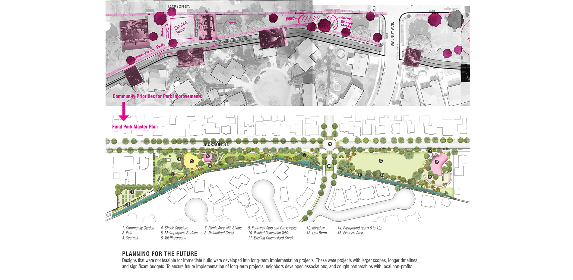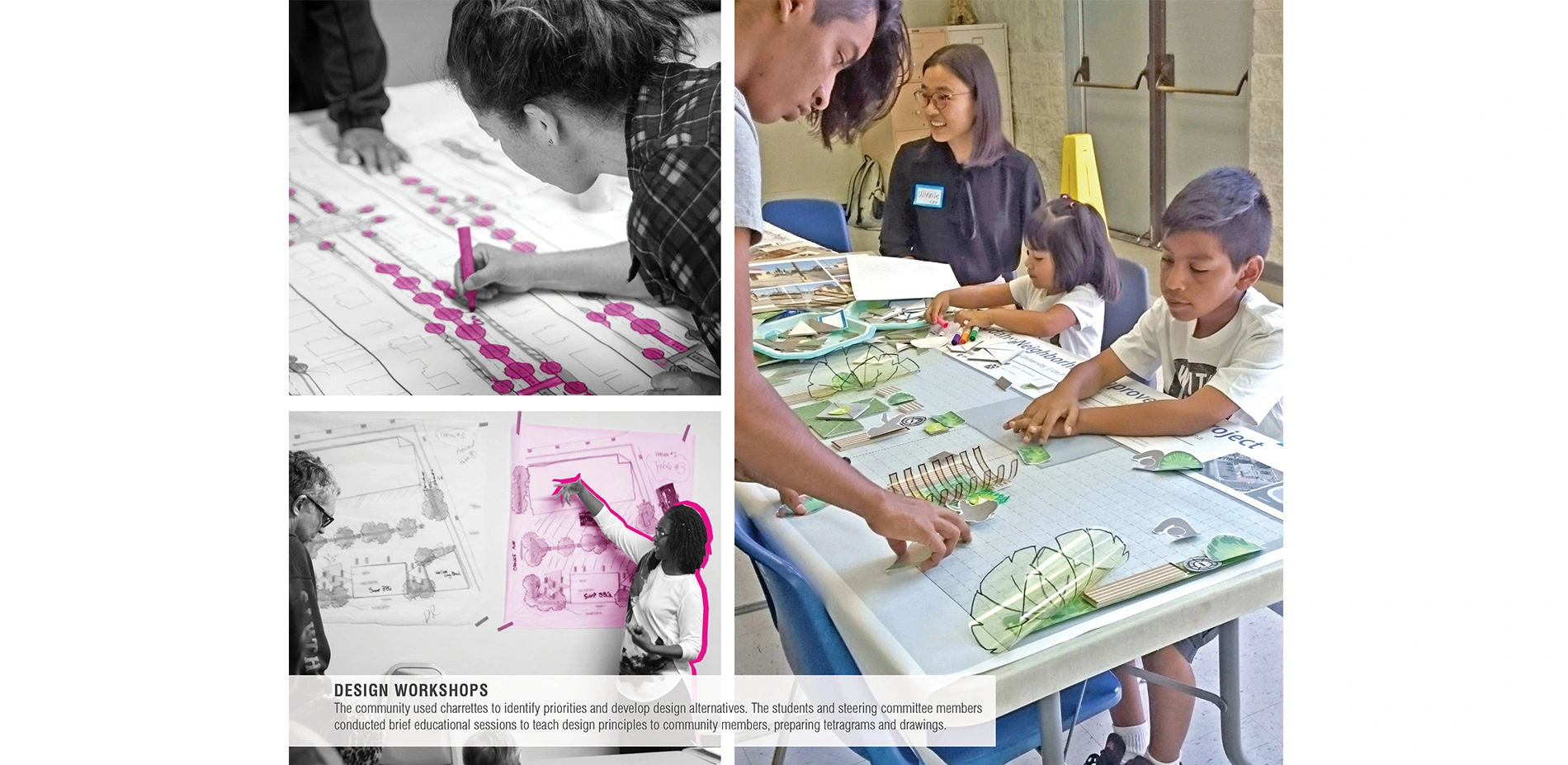 Residents were involved in the brainstorming, prioritization, design and decision-making process for all parts of the project at the neighborhood scale, including site selection, programming, ,spatial organization, furniture selection, materials, colors and plant palettes. Work days were held to implement the community's designs. During these days, community and steering committee members joined students and Conservation Corps members on-site to prepare and build the community-designed projects. The project team was able to reduce costs by acquiring materials and plants through donations from local businesses that were happy to support a community-led project. Additionally, community members were eager to contribute plants from their own yards. These work days had tangible outcomes such as built and painted elements, but also produced intangible outcomes such as new relationships and awareness of shared interests and concerns.