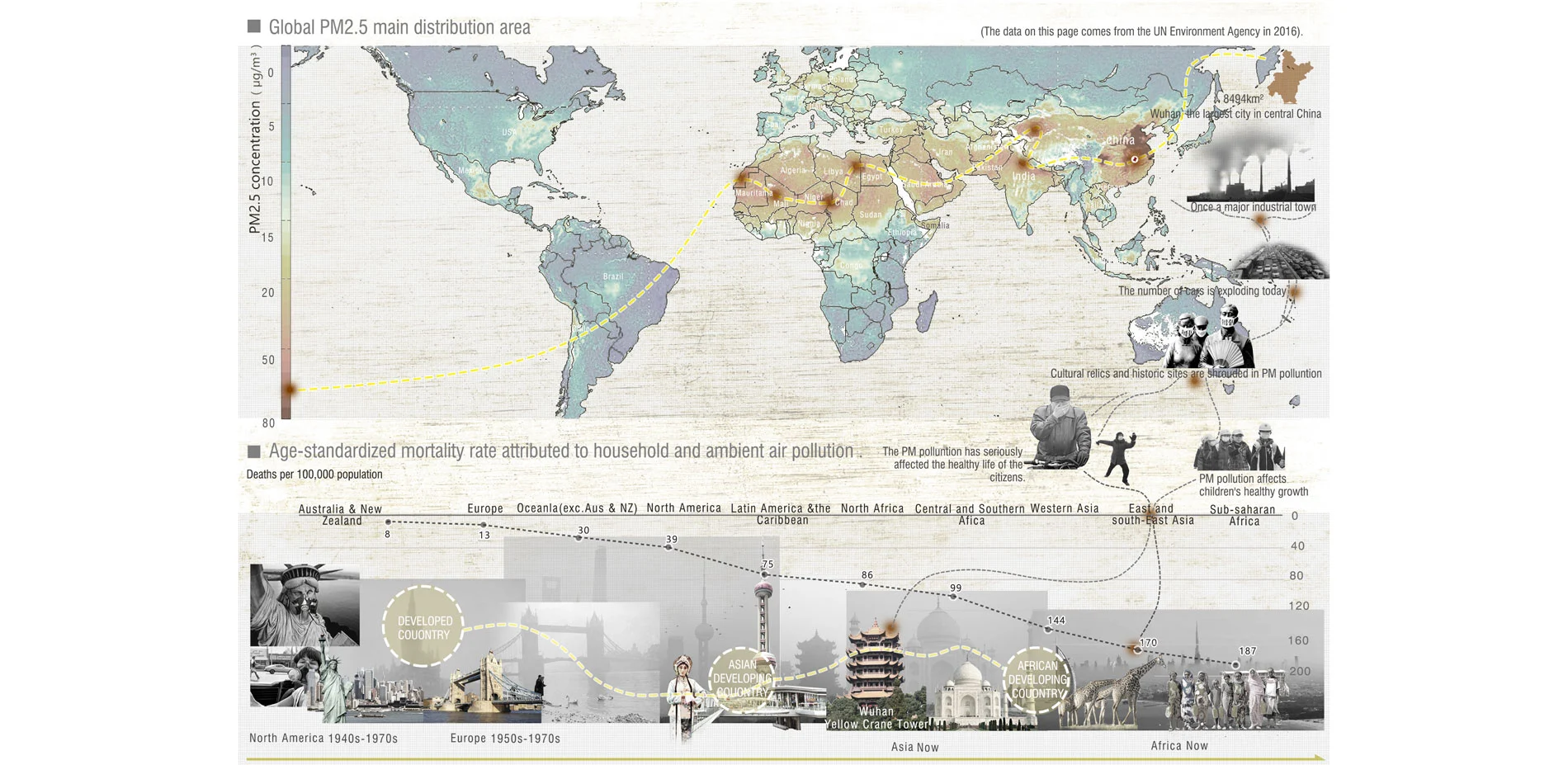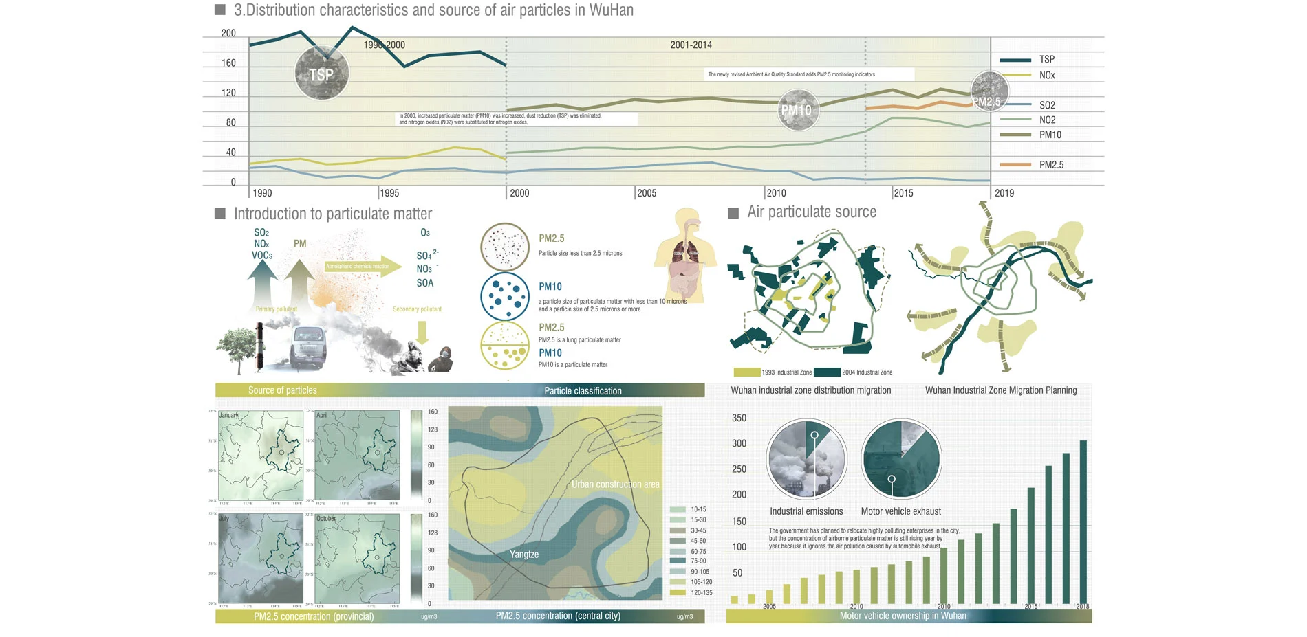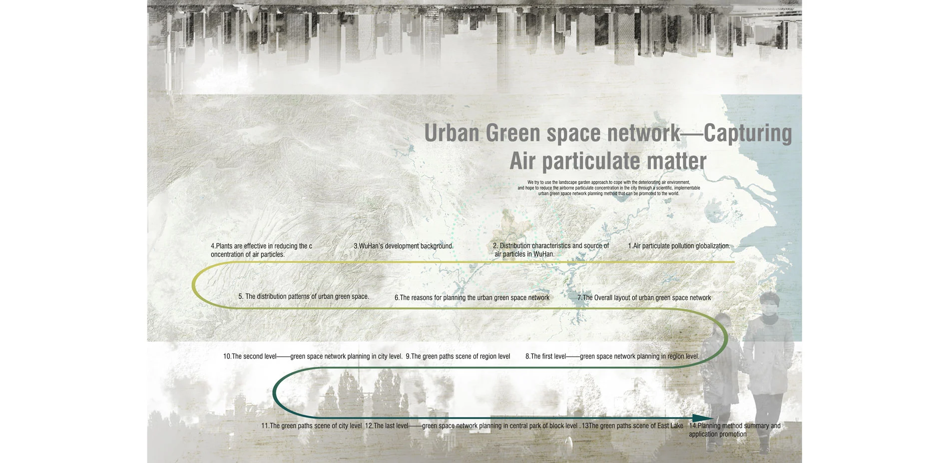 The UN Environment Agency published a survey report in May 2019, which showed that about 7 million people died of air pollution every year, and most of these unfortunate people or areas with serious air pollution are from Asia, Africa, and Latin America. China, but developed countries have also suffered from air pollution during the development process., such as the 1950 London smog incident and the 1943 Los Angeles photochemical smog incident. Air pollution has become a global environmental problem, and the most harmful and direct air pollutant to the human body is the air inhalable particulate matter., referred to as PM10 and PM2.5. It is the invisible killer of the city and is gradually encroaching our healthy life. We try to use the landscape garden approach to cope with the deteriorating air environment, and hope to reduce the airborne particulate concentration in cities through a scientific, implementable urban green space network planning method that can be promoted to the world. This is the vision of our team and the strong desire of countries and cities that are polluted by airborne particulate matter. Fortunately, this seems to be achievable. We chose Wuhan, a city in China as a research and planning site, because it has developed extremely rapidly in the past 30 years. The population of the city has reached 11 million people and the nature of land use and the number of cars have changed drastically, which has caused airborne particulate pollution to be extremely serious.