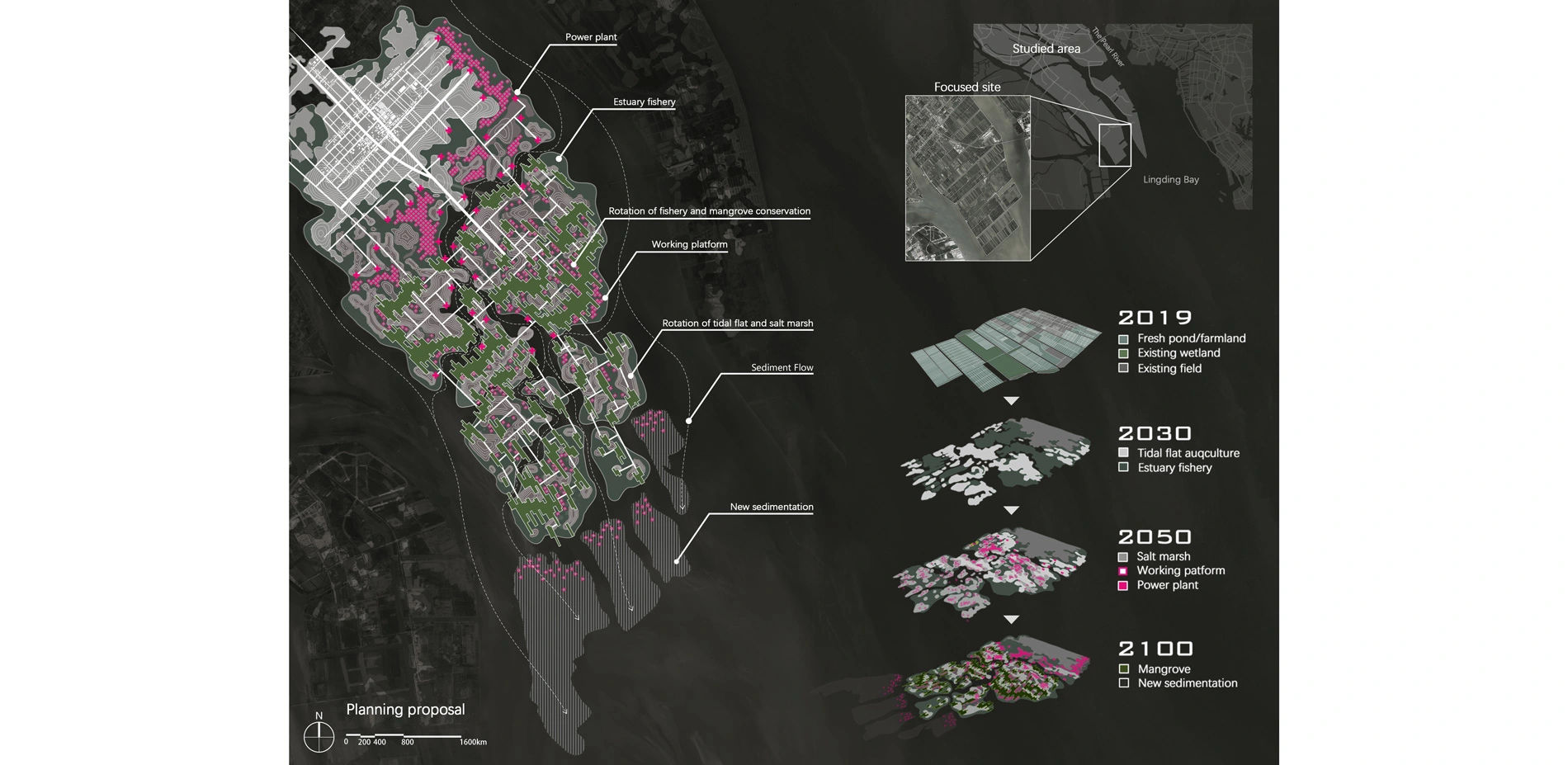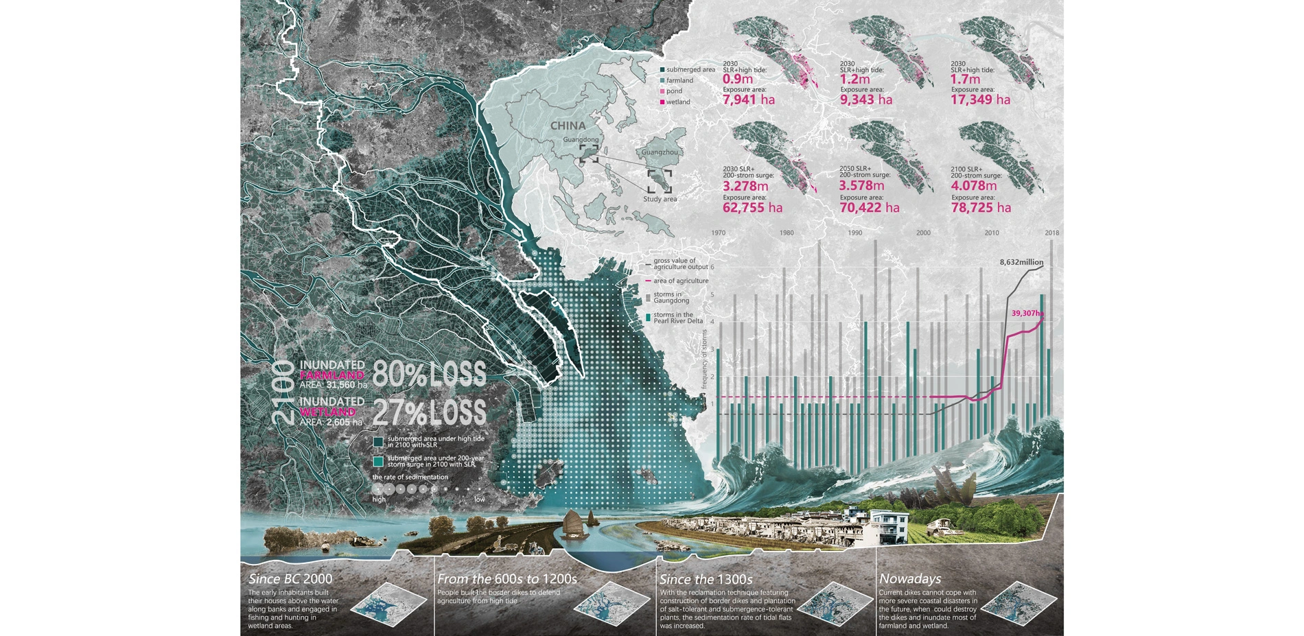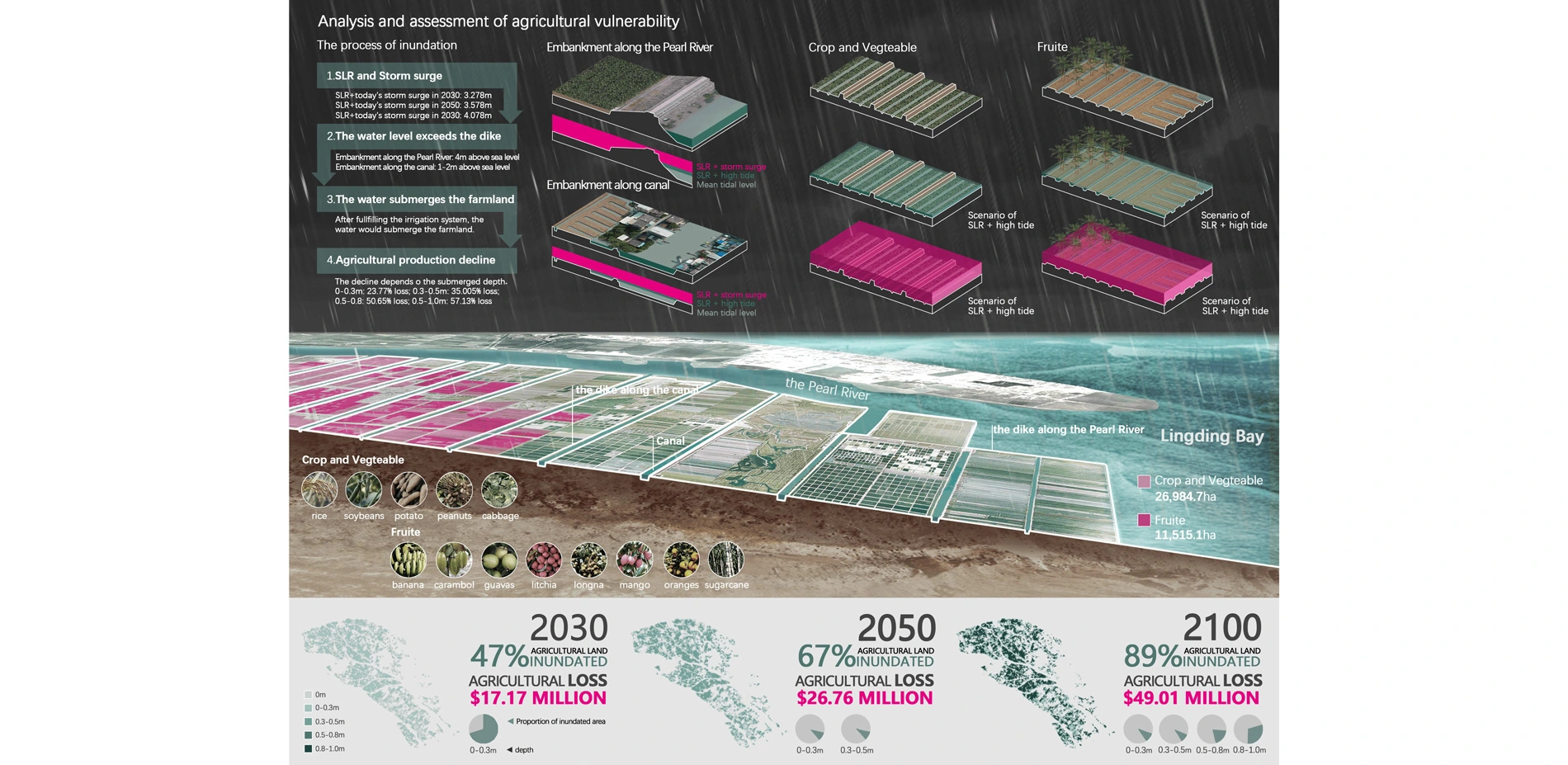 As an artificial landscape, coastal agriculture landscape in Guangzhou spatially overlap within parts of wetland—ponds and tidal flat. Therefore, agriculture and wetland should be regarded as a complex landscape system. Based on multiple indexes of economic value, this design focuses on assessing agricultural vulnerability and wetland adaptivity, and simultaneously taking the dynamic impact of SLR on the landscape system and the succession of wetland into consideration.