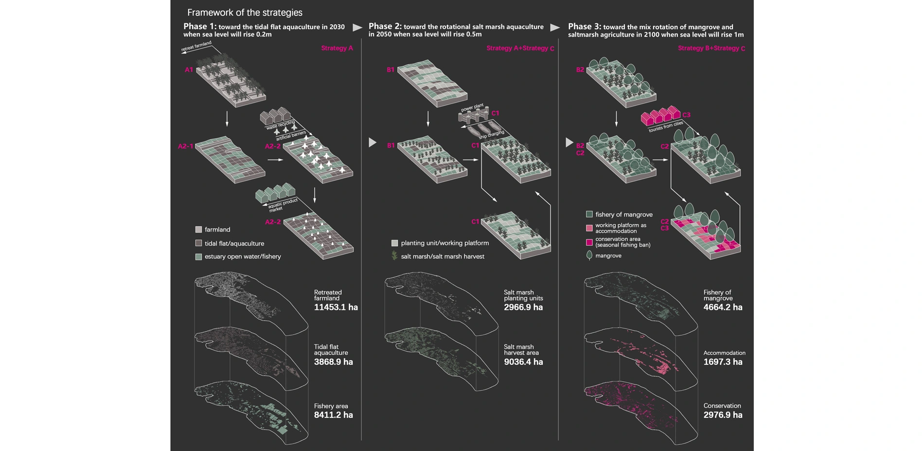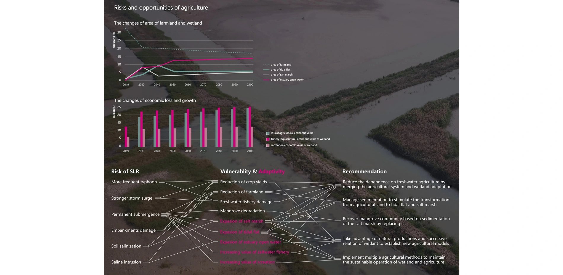 As the impact of SLR on coastal environment is an ever-change process, the fixed agricultural landscape planning is difficult to respond to coastal changes to survive and keep working in the future. The concrete coastal hard engineering infrastructures block the dynamic connection between landscape system and marine environment, and simultaneously with greater risk leading to increasing losses. Inspired by the strong adaptative capacity of wetlands to transform under SLR, the design hence improve the ability of transformation to provide agriculture with a motive force compatible with SLR. This coastal wetland-driven agriculture model would turn the risk of inundation to opportunities for future production. With sea level rising, successional salty agriculture model can create new value of agriculture, ecology and social culture by forming various agricultural systems, each of which has roles to perform and benefits each other within different submerging regions.