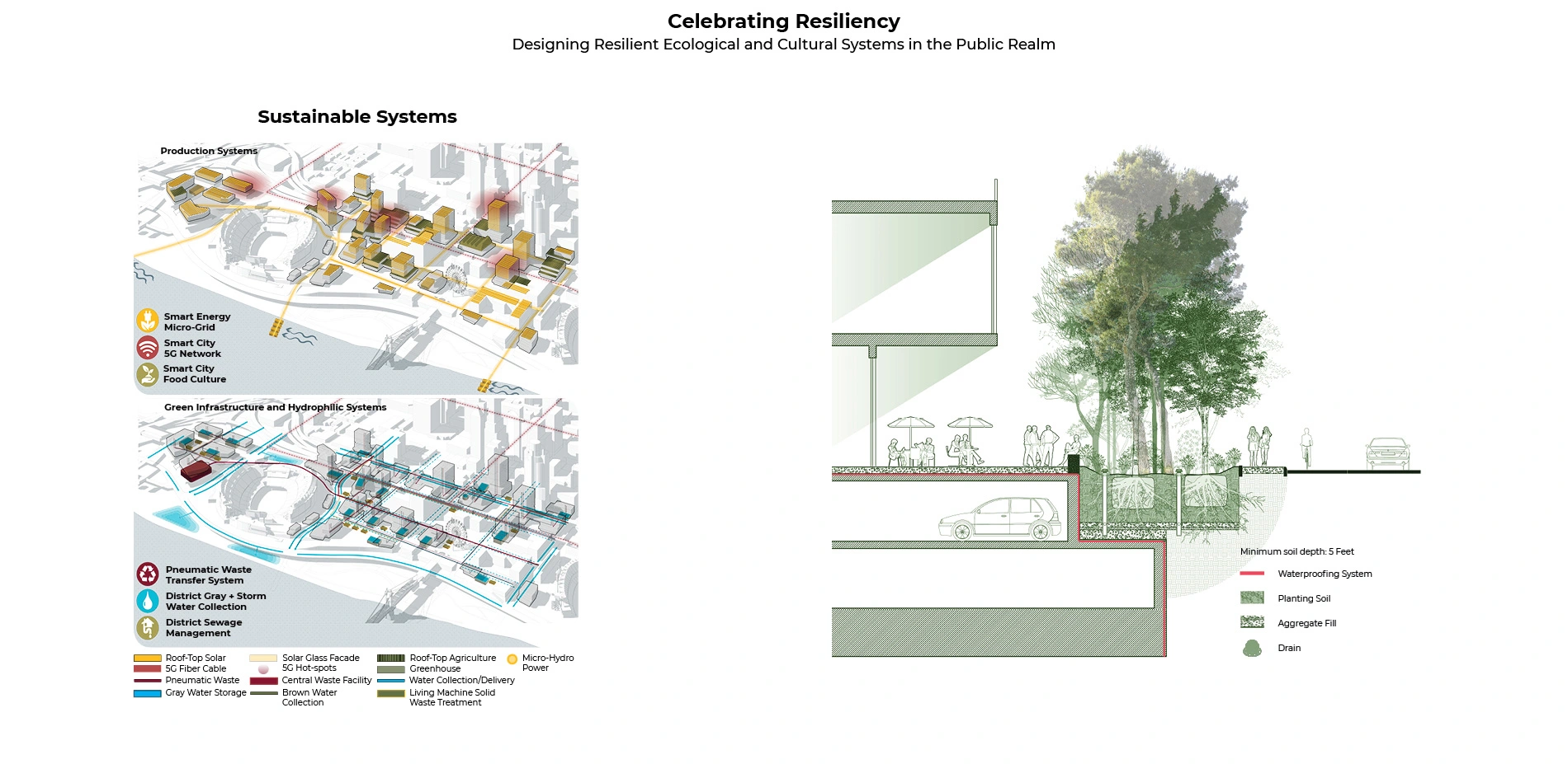 From and planning and design standpoint, the design challenges the traditional developer block-type, reinterpreting a block to provide additional open spaces (through mid-block courtyards, multi-level porches, and private balconies) and a better functioning ecological purpose (through tower setbacks, green roofs and rooftop agriculture, permeable surfacing, and open space). By doing so, the proposal looks at encouraging active ground-level building uses, ultimately creating a more active and vibrant public realm. Furthermore, the streetscape design prioritizes bike, bus, and pedestrian traffic and looks towards future transportation models that are less car dependent. By working in an interdisciplinary fashion, we were able to negotiate, advocate for, and continually rework all components of a block, (the building, public realm, funding and phasing strategies, etc.) so that one element did not dictate the other, but instead, all came together to illustrate the guiding principles we established.