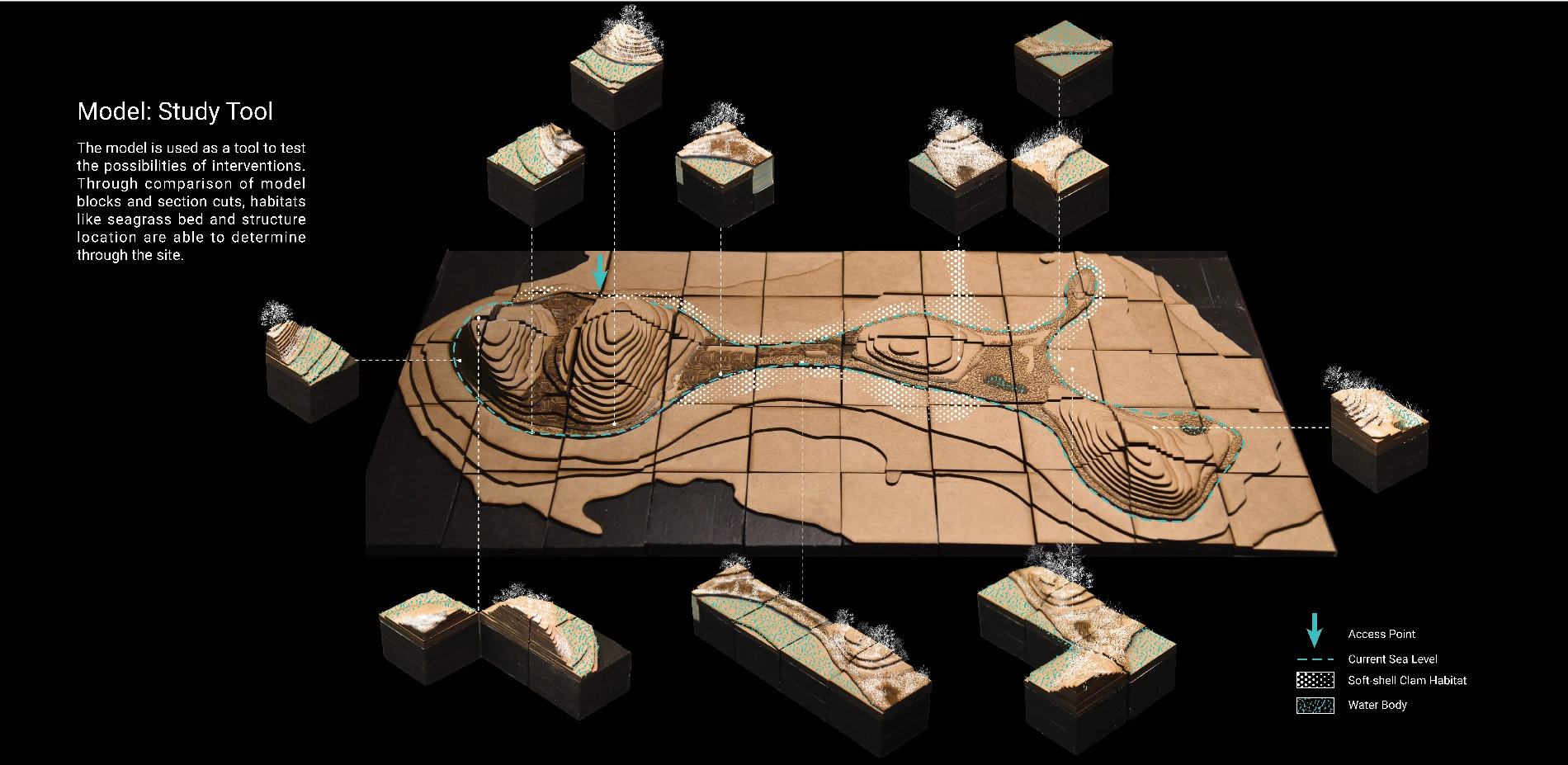 The model is used as a tool to test the possibilities of interventions. Through comparison of model blocks and section cuts, habitats like seagrass bed and structure location are able to determine through the site.