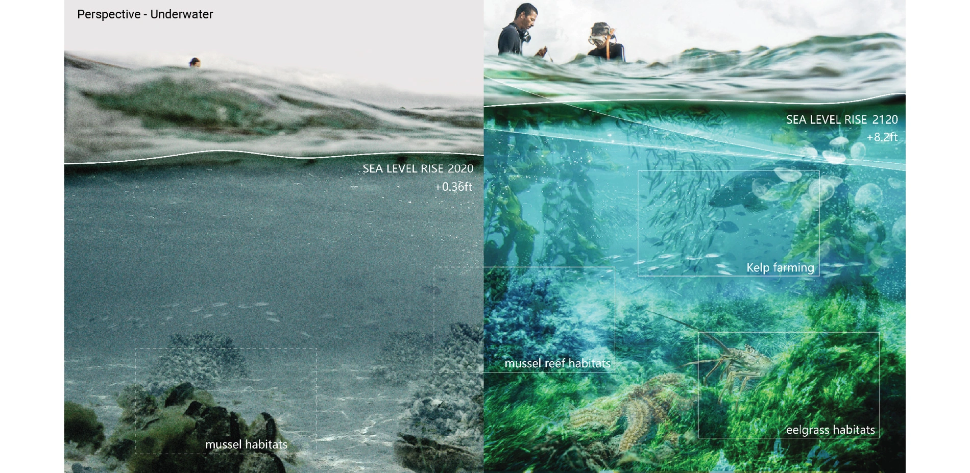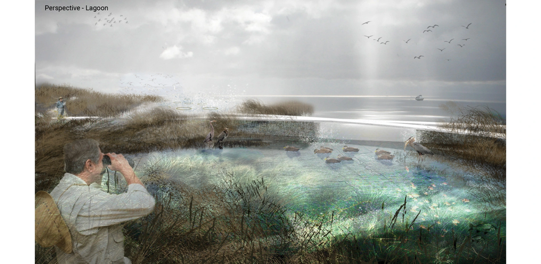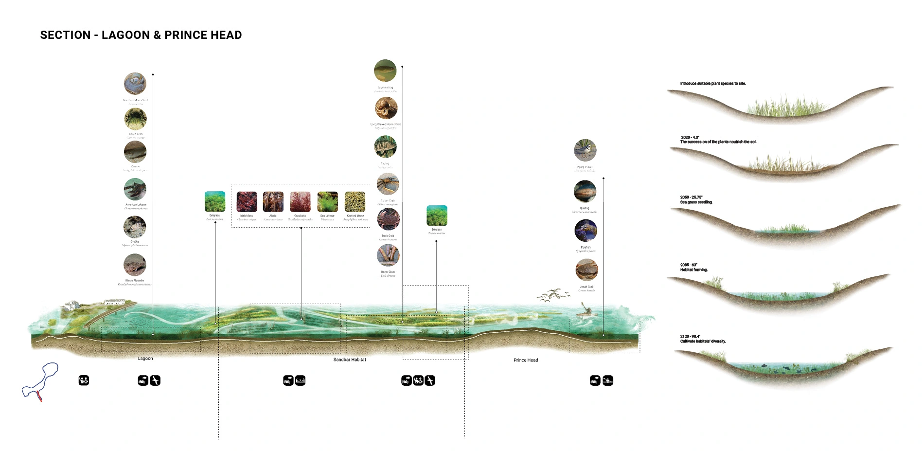 In the future, the salt marsh will directly connect to the sea due to the sea level rise. The water edge is reinforced by beach grasses and seagrasses. As the habitat continued to establish, migratory birds like the Great Blue Heron, Sea duck will come to the area for food and habitat.