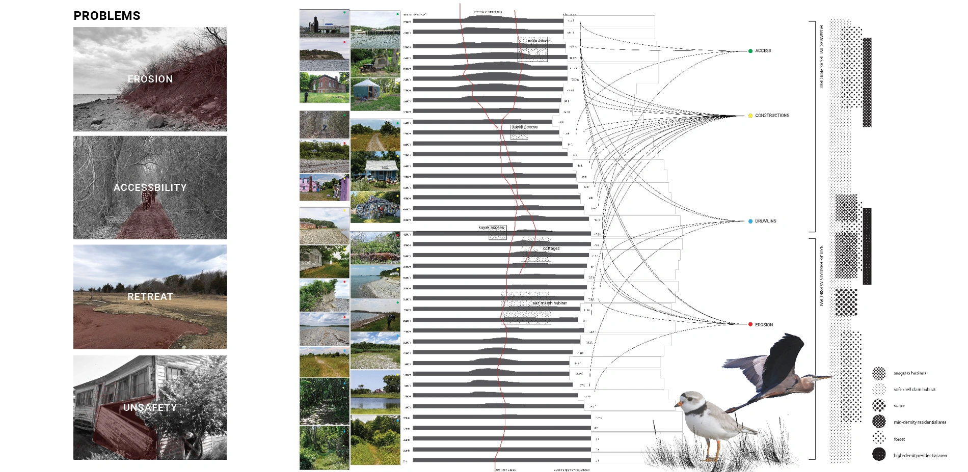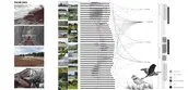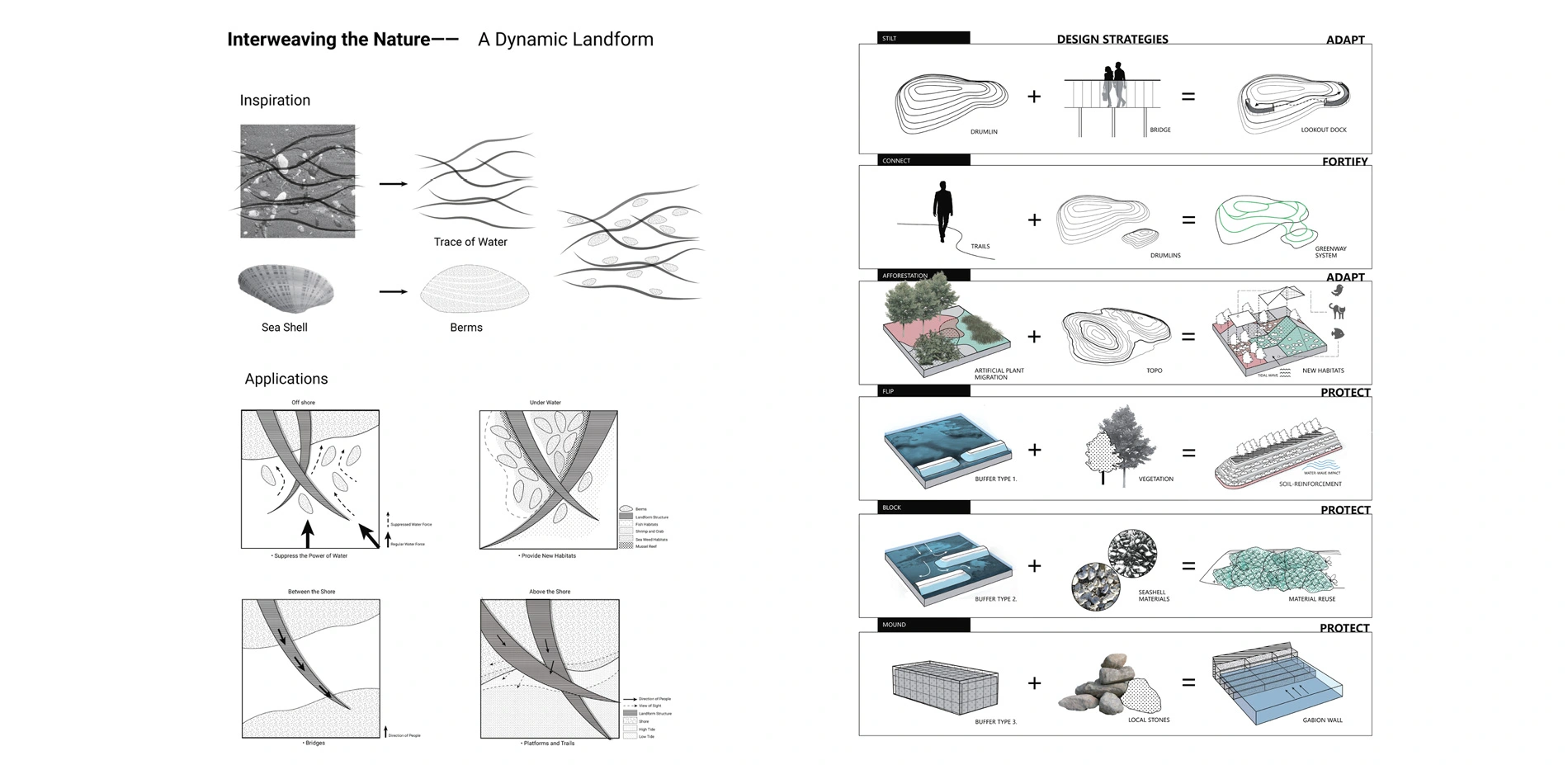 A total of five different actions, which are connected - flip - block - mound - stilt were applied to the site. By remixing materiality, texture, structure, and contour, new forms were generated to achieve the protect and adapt stage of the site. Meanwhile, a novel landform is extracted from the morphology of fragments like seashells and rocks, and their traces from overwash. The typologies of the new landform provide a dynamic service that harnesses the existing potential of the site and enhance its resiliency in different environmental conditions.