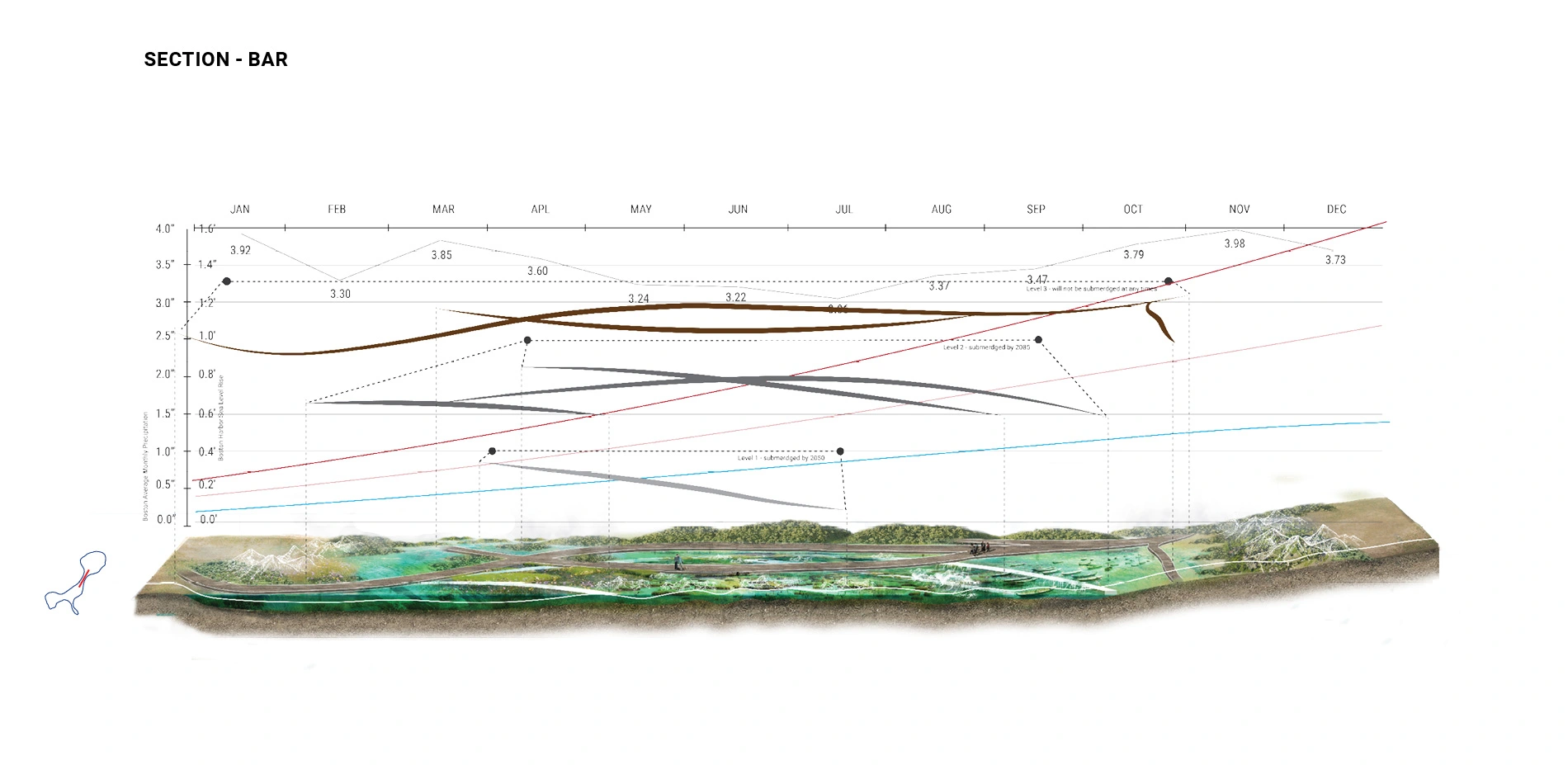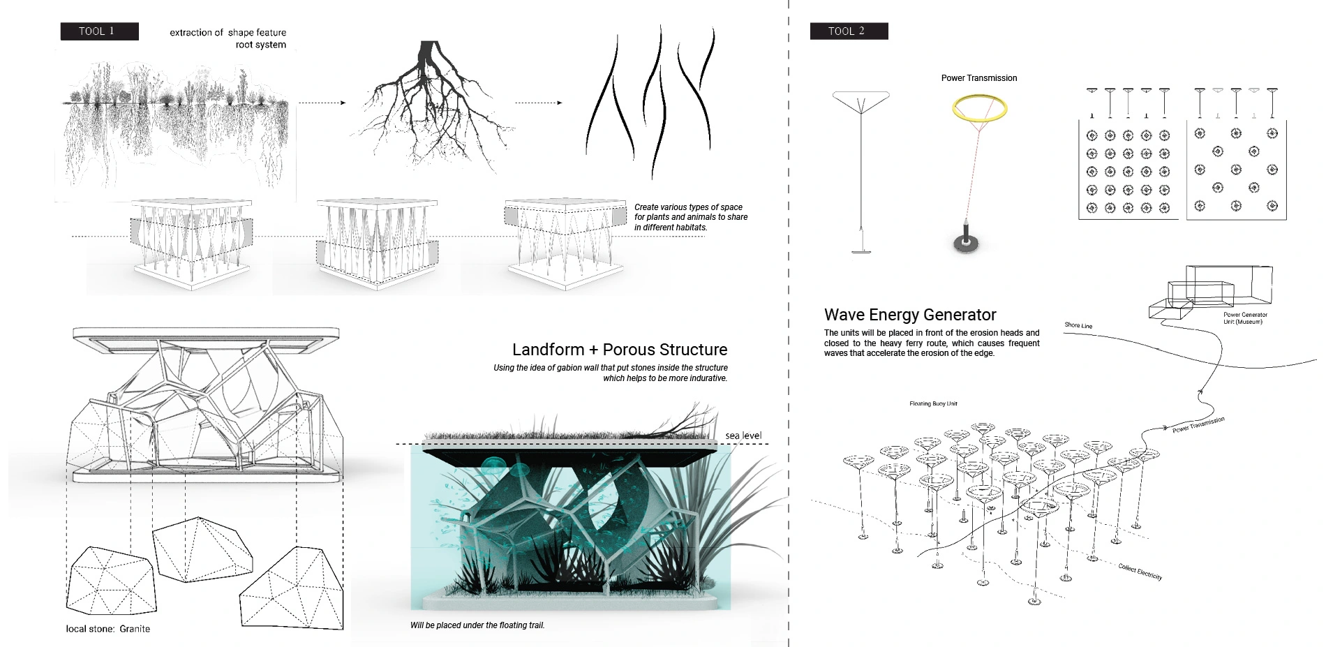 The future scenario was built upon the phasing from previous years. As the shoreline retreat, larger trees near the water edge will disappear. However, with the gradual construction of the berm, new inland plants start to appear. Salt-tolerant grasses are cultivated on the water edge and expand inward and outward to stabilize the eroding edge. On the museum side, floating wave energy collectors are installed in front of the grassy edge in order to absorb the energy caused by the passing ships.