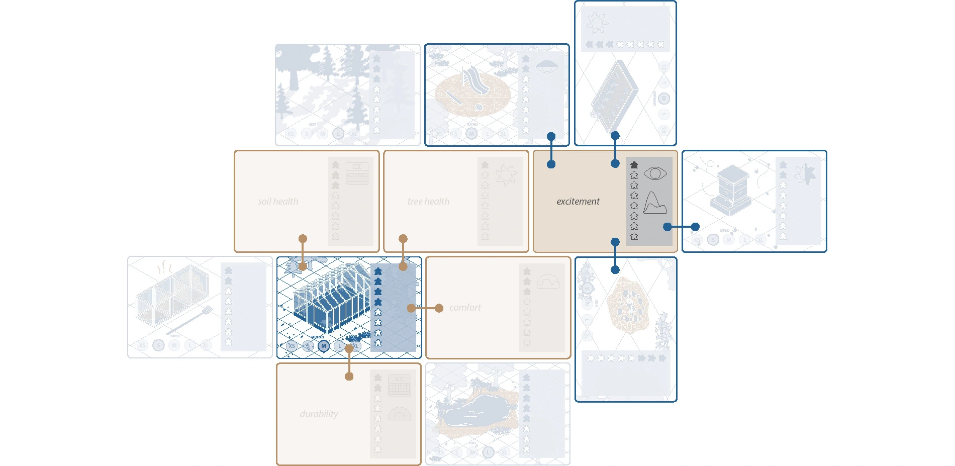 The significance of games as a communication and learning device relative to landscape architecture practices lies in several essential concepts in the game design discourse and leaders in participatory practices. Josh Lerner (2014), the Executive Director of the Participatory Budgeting Project, states that games are unique in that they "require player participation," and it is through this participation that players learn to not only understand the rules of the game, but also "criticize and change it when necessary" (Making Democracy Fun, 17-18). Critique, as we know in the design profession, requires a level of respect and understanding, and is an important form of communication. A landscape game, such as RELATE, builds upon the productiveness of critique and natural, voluntary participation and amicability of playing a face-to-face game, by incorporating landscape elements and mechanics in the game components and gameplay.