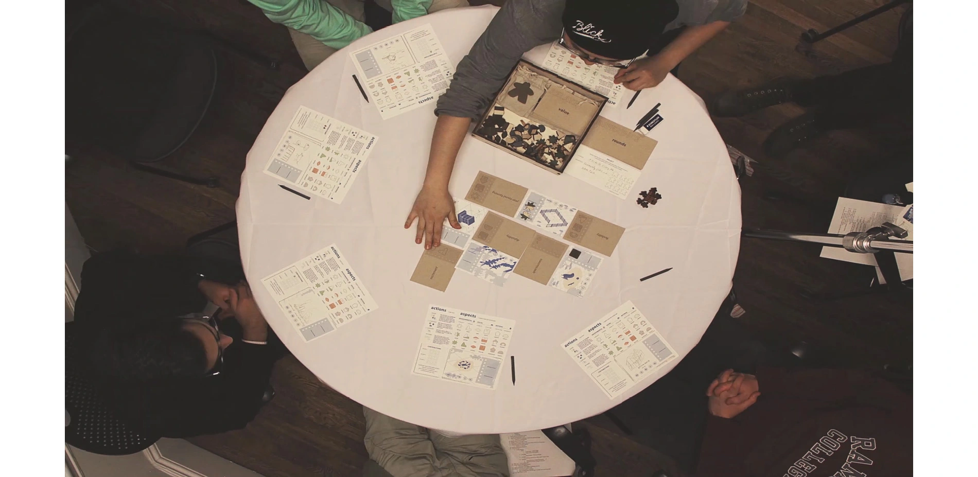 Phase 1: Relate, is silent, and meant as an initial "brainstorming session," in which individual interests and interpretations introduced without coercion. In this process, players start to interpret the landscapes and value cards, as well as the aspects: environmental, social, and material. Players also start to react and pick up on what other players put down, actively thinking about the relationships that are being made as others play out their cards. Phase 2: Reflect is where the scoring and discussion comes. Scoring is collective and is visually indicated by "meeple" tokens placed on your project card for everyone to see. Players start to discuss and understand the different interpretations and expertise each player brings to the table and start to talk about the landscapes, values, and aspects as they relate to one another. The round ends with three collective decisions that emphasize the power of collaborative work.