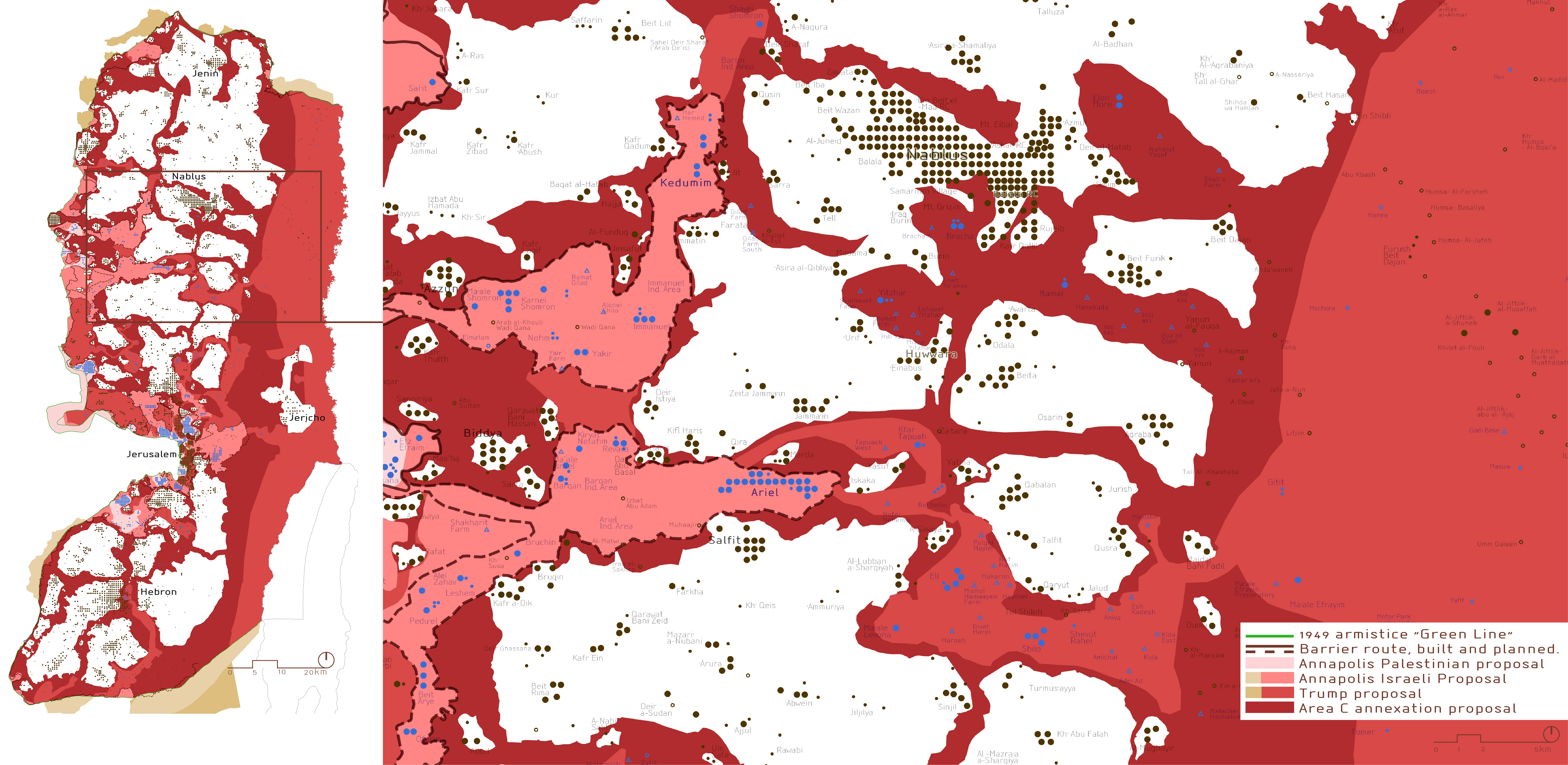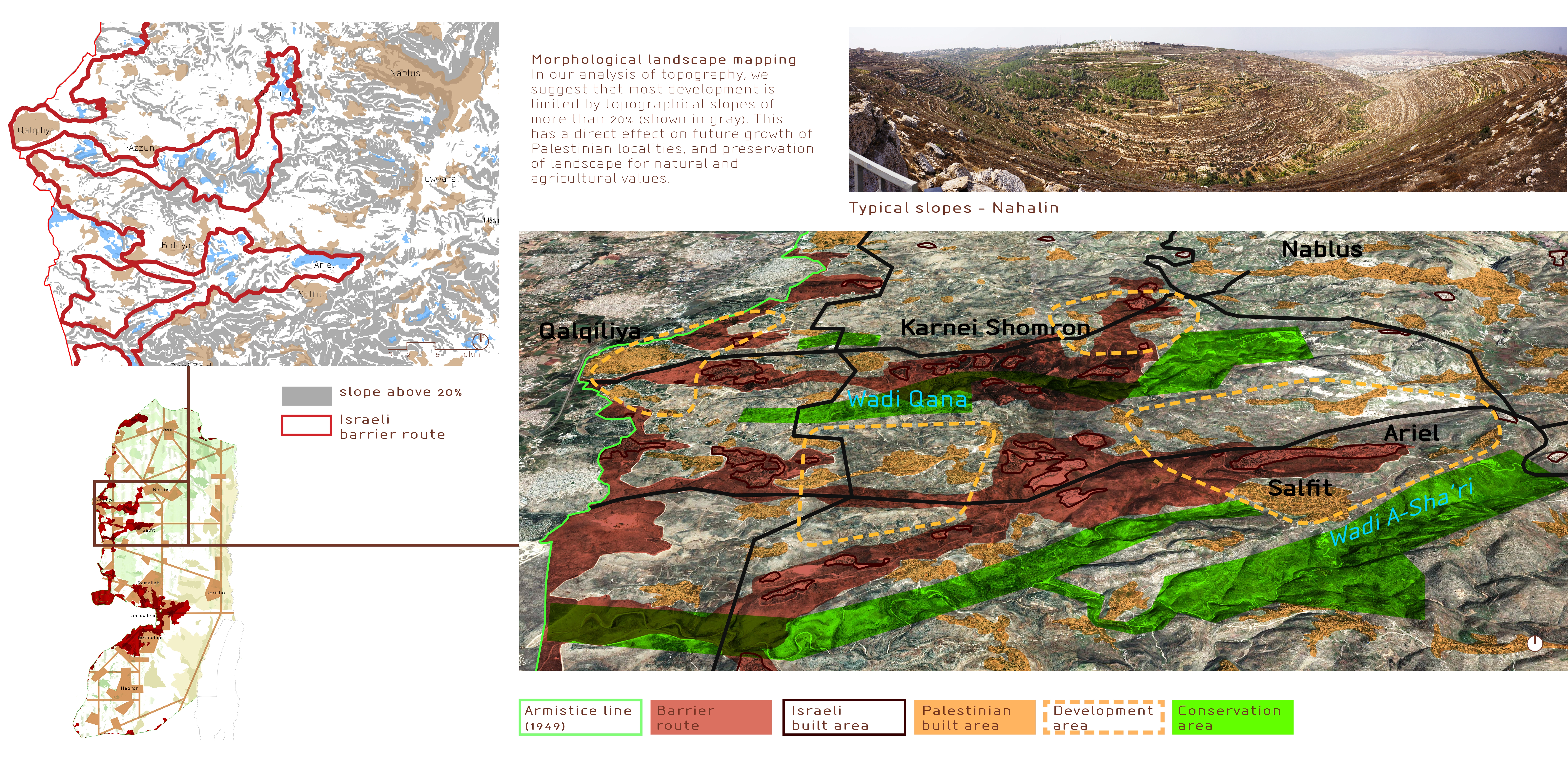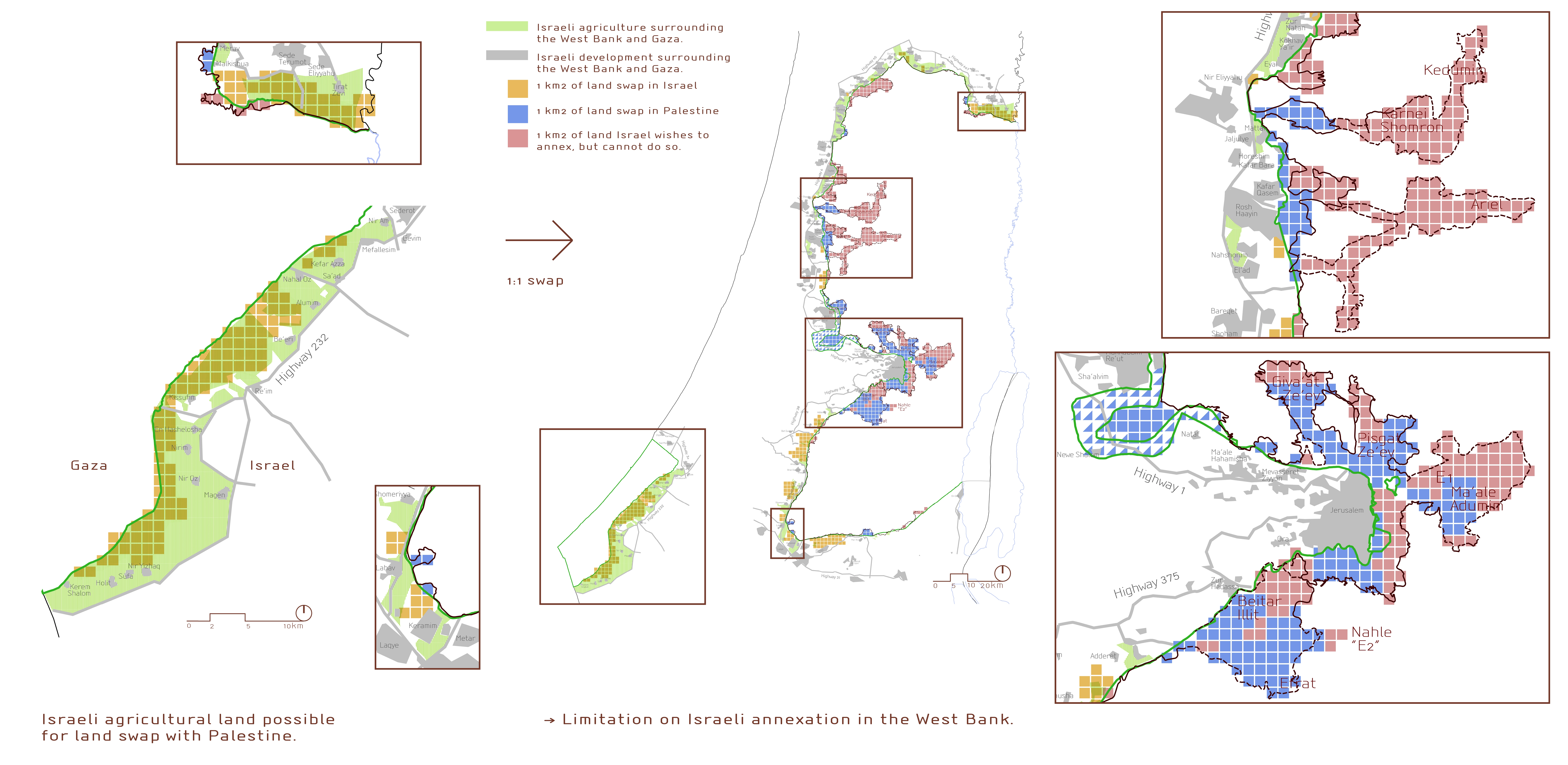 This analysis is complemented by effects of landscape on the possibilities for "land swaps" between Palestine and Israel. The three studies then converge to form territorial scenarios for a possible agreement. We thus see how a research and planning of landscape directly affects geopolitical possibilities, and the character of communities, such as the number of settler population Israel will need to evacuate.
