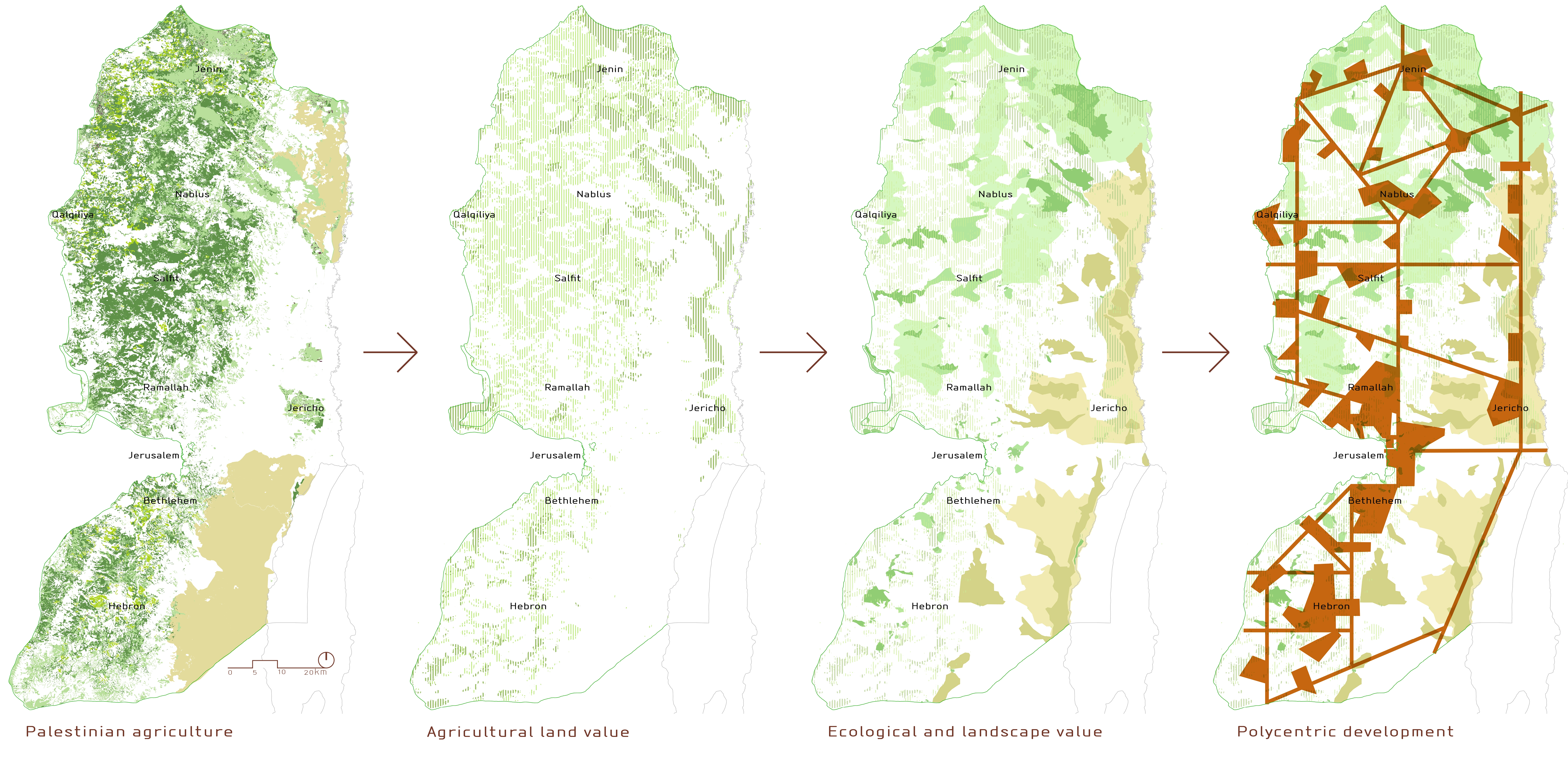 A clear sovereign, sustainable, open space is a requisite and an expression of the Palestinians' right to national self-determination. We study the relationships between Palestinian regional landscape and equitable development on a national level, and on a local level of "rural urbanism" and "integrative urbanism" comprising towns, suburbs, villages, open spaces and infrastructure.