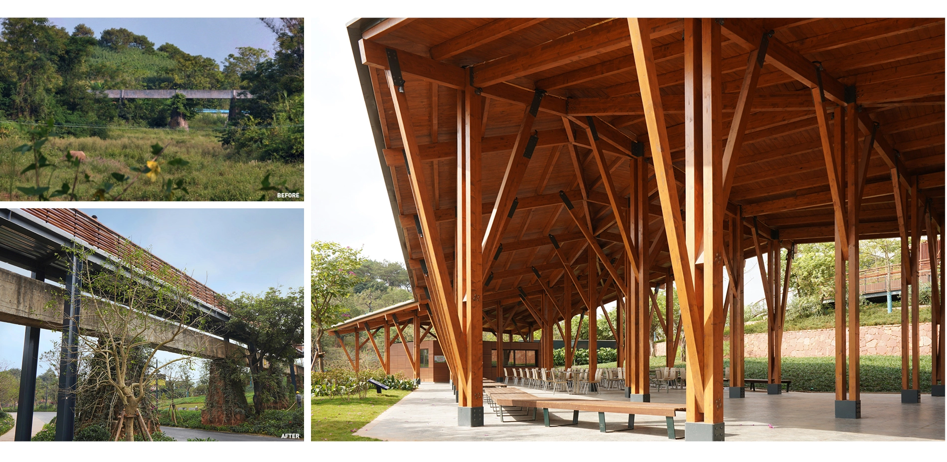 An existing aqueduct runs across the site, transporting water from nearby spring to surrounding villages and farms. As a witness of site’s agricultural history, it is well-preserved for irrigation water supply of the area, retaining its original function. Above the aqueduct is a pedestrian bridge that connects to the paths toward the adjacent quarry gardens, creating a unique three-dimensional tour system in this area. A 600m2 pavilion provides various tourist services such as sales, rest, shuttle bus ticketing, etc., and also showcases the history and eco-restoration processes and methods of the quarry gardens.