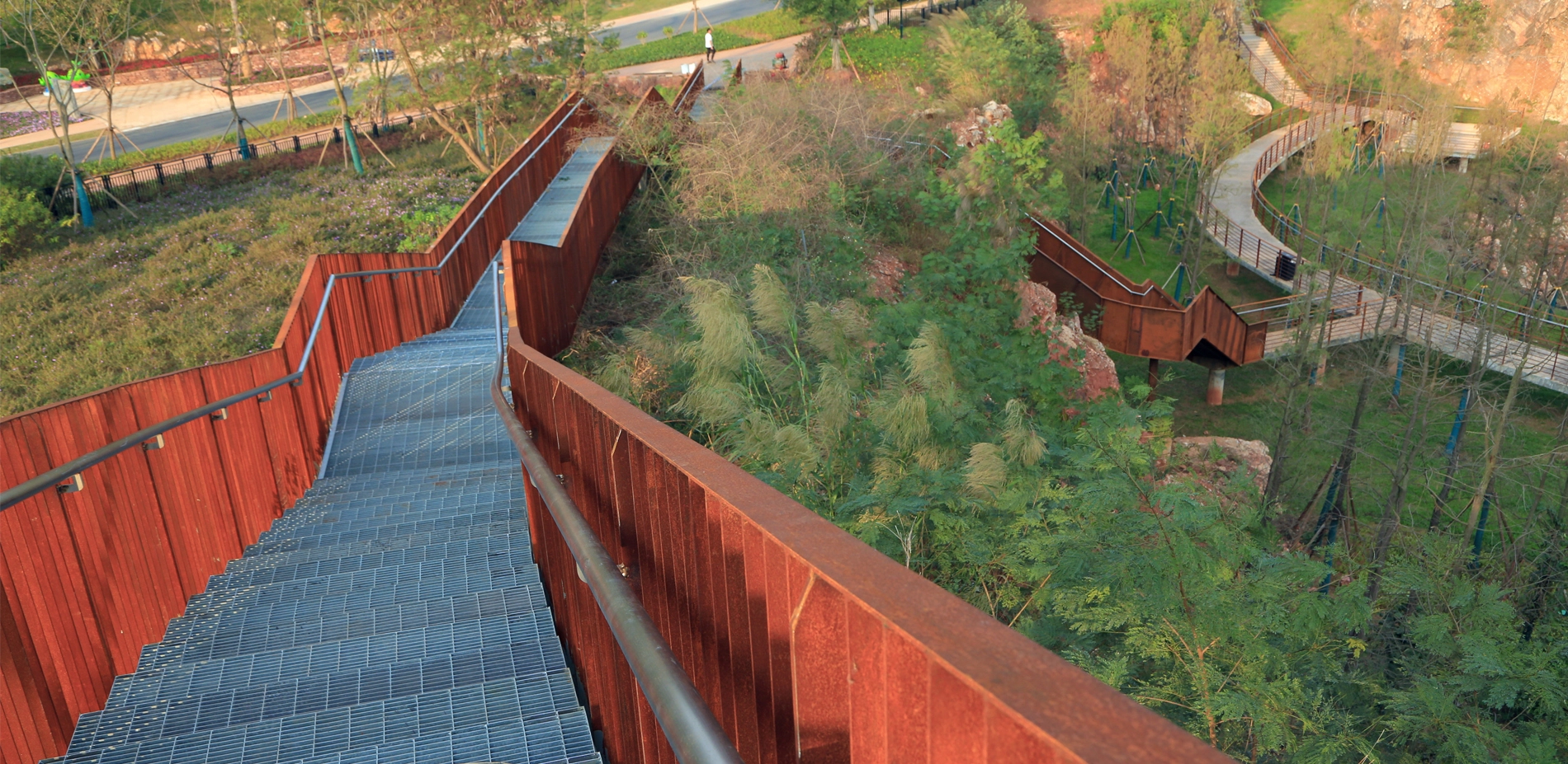 Quarry No. 2 is surrounded by cliffs on all sides. The quarry bottom is relatively flat and accumulates water perennially. The quarry is designed as an aquatic garden. The zigzag steel grating walkway winds through the planting zone and connects to a platform that further extends to a path above the cliff, accessed by several flights of steps. The section with the highest elevation features a closed wooden box, which is also an aerial viewing platform where people can appreciate a captivating view of the cliff and the entire garden expanse.