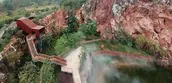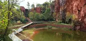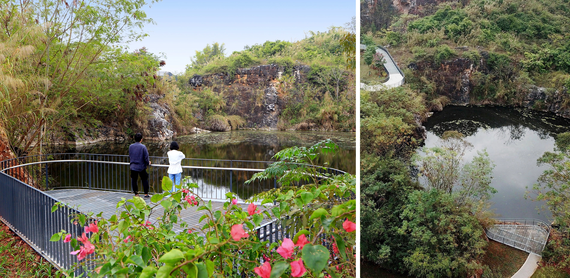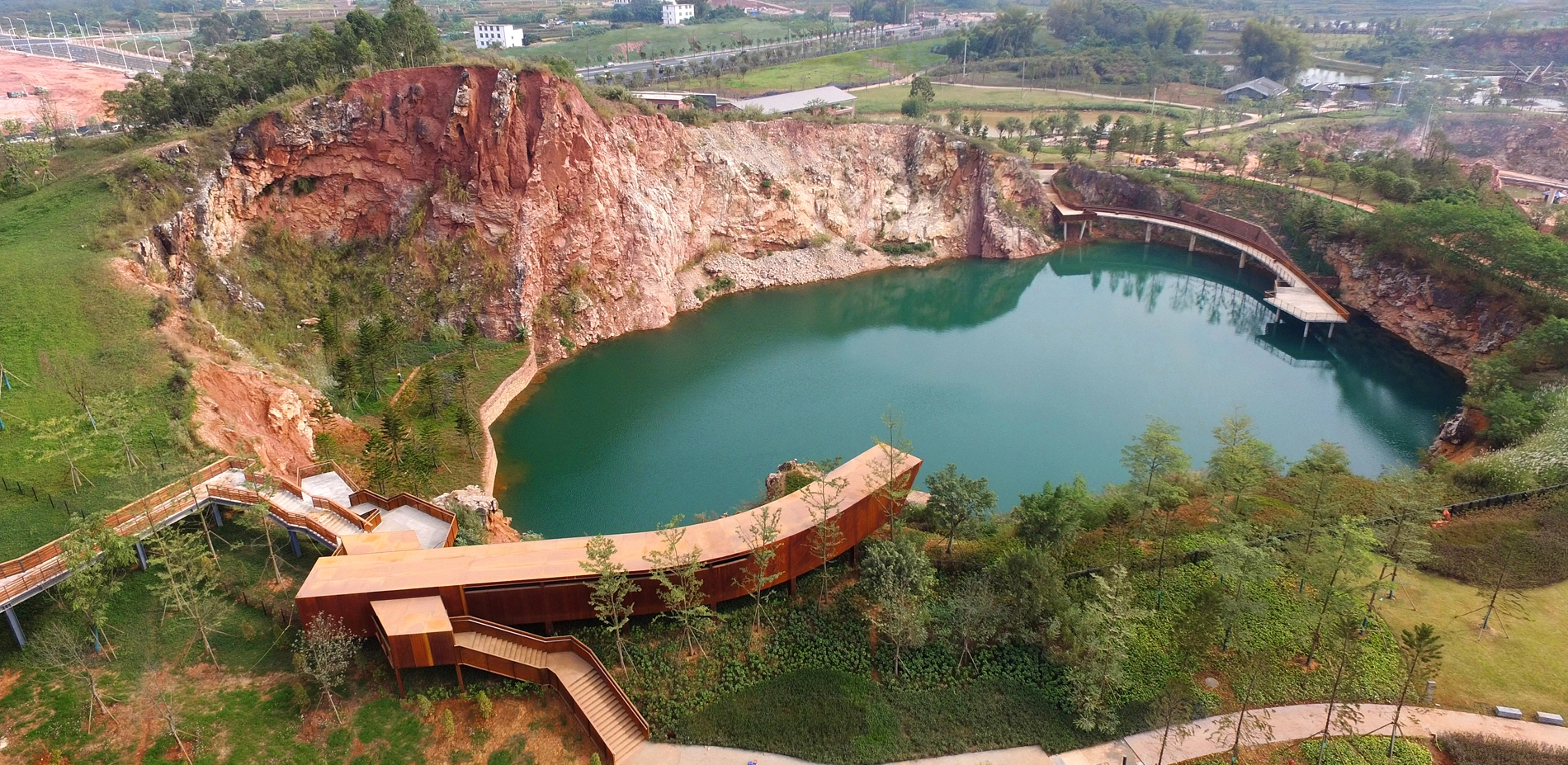 Quarry No. 5 is the largest among the seven quarries, enclosed by dilapidated cliff with terraced rocks sitting at the bottom. The quarry has transformed into a lake, caused by the continuously-rising water level. Two areas with relatively shallow mining depths were earthed up above the water surface, and planted with trees such as pond cypress and Chinese cypress, creating an aquatic woods landscape. Bridges and walkways of varying heights crisscross above the water and through the woods, creating a connection with the hilltop view platform. A waterfall is designed on the opposite of the bridge, forming a scenery spot accordingly.