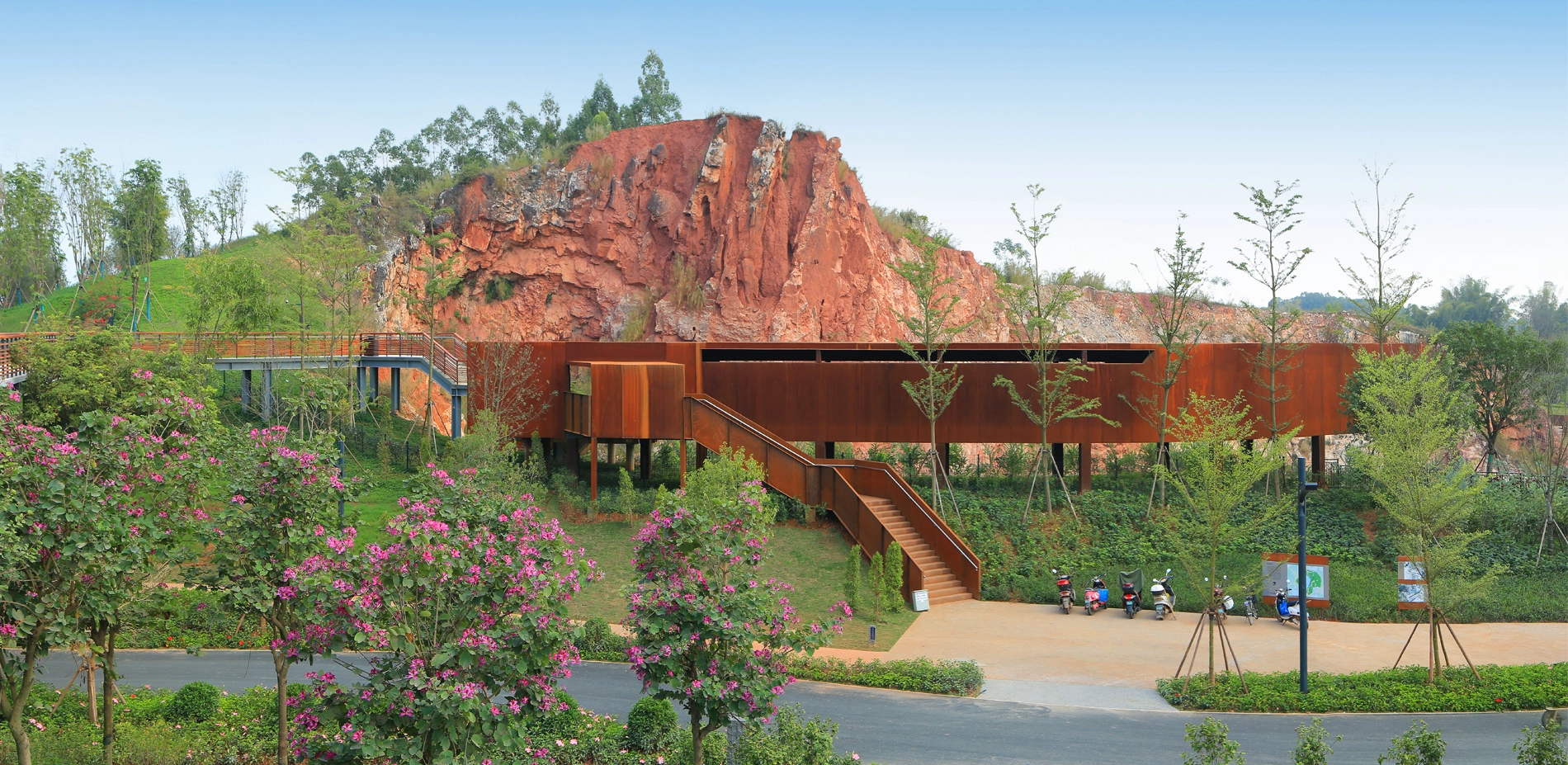 Quarry No. 4 is a large pond embraced by cliffs, with green and clear water. Viewing platforms sit on both northern and southern sides of the quarry. The northern platform is a Corten steel corridor located at the quarry’s edge, unraveling a long strip window towards the quarry, where visitors can feast their eyes on the steep cliff towering over 40 meters above the water surface. At the southern end of the corridor, people can enjoy an overlooking view of the charming pond situated beneath and the waterfront platform on the opposite side, offering a thrilling and exciting experience. On the southern side of the quarry, a wedge-shaped platform stretches out from a gap among the rocks. It hangs above the waters and connects to the lower waterfront platform through a curved bridge. Through an earthing-up process, vegetation was restored around the quarry as well as the gentle slope inside, which revives the quarry garden meanwhile highlights the steepness of cliffs.
