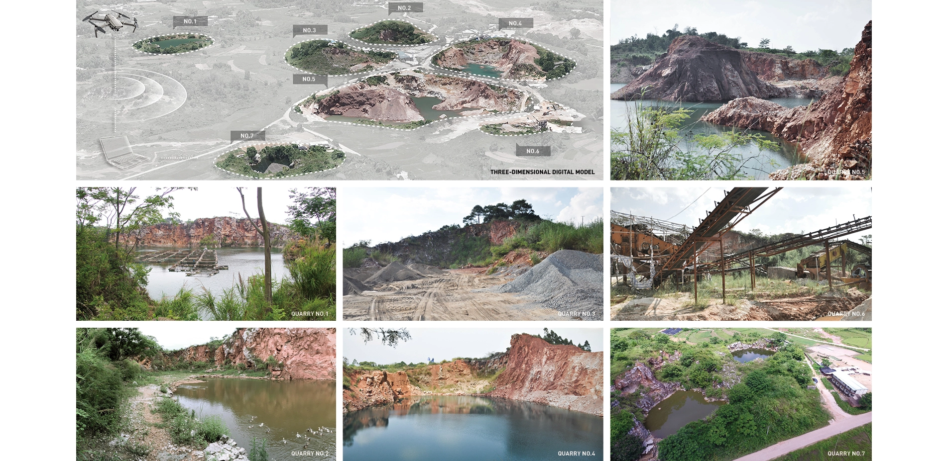 As a part of the international garden Expo, these seven quarries are expected to be transformed into distinctive gardens displaying in the event. To cope with this complex project, UAV aerial scanning is adopted to acquire 3D terrain data of the site, also continually observation and record are executed for hydrological data of stone-pits’ water variations. Distinguishing restoration methods and intervention approaches are adopted according to various scale, space structure, and characteristics of these quarries. The towering cliffs, fragmented rocks, bottomless pools, stacked soil, slag stones, and rusty quarrying machinery are all regarded as landscape resources to be integrated into the design, and on the basis of which, space shaping, vegetation restoration, paths and viewpoints position are conceived. Eventually, the quarry gardens not only preserve the site’s unique history and characteristics, incorporate the theme of horticulture and landscape art, also create a rich sensory experience for visitors, showcase inspiring ways for revitalize a derelict mining site, as well as a forward-looking demonstration of urban ecological restoration and a reference for sustainability practices.
