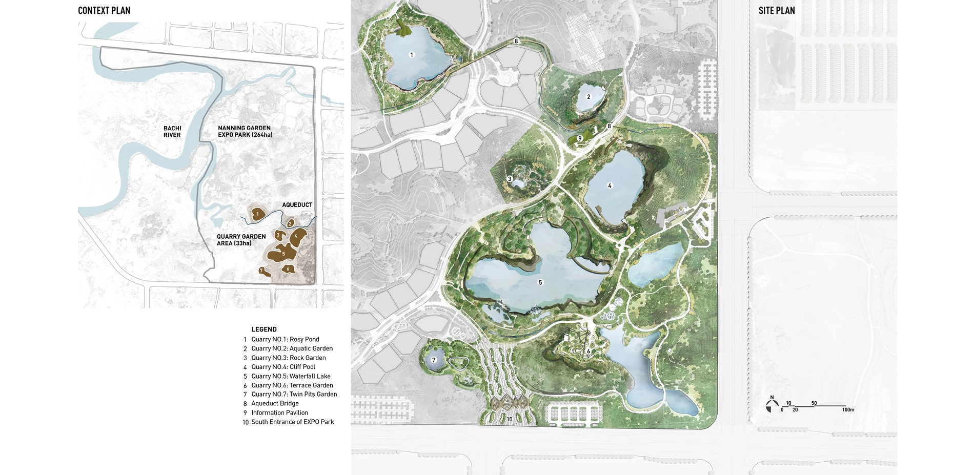 The site covers an area of about 33 hectares. Several years had passed since mining at some of the quarries onsite ceased, yet two of the quarries persisted mining activities until the city won the expo bid. These quarries suffered blasting during the mining that caused fragmented surfaces and rugged landforms at pit bottom. The site was strewn with dilapidated hills, towering cliffs, deserted land surfaces, bottomless ponds, piles of abandoned soil and gravel, rusty quarrying equipment, etc.
