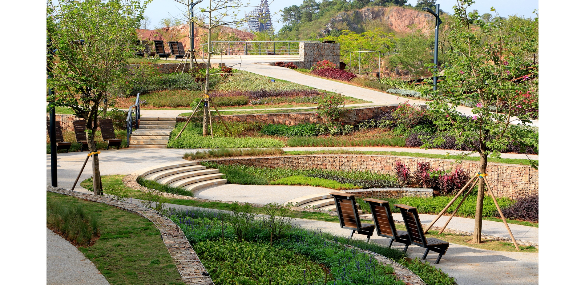 With the design well-fitted with its original landform and landscape features, seven dilapidated and desolate quarries have undergone a fascinating transformation into a series of unique gardens. They demonstrate the promising possibilities and showcase to the public the diversified methods of quarry eco-restoration as well as the multiple dimensions of landscape art. -