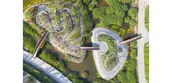 A continuous and integrated path network connects retail, underground commercial areas, and cultural spaces with park features and streetscapes, allowing for smooth transitions between. Main entrances are located within a 5-minute walk from subway stops or public transportation, enhancing accessibility for the Shanghai area. All land bridges and paths are graded to meet ADA standards and special features are designed to ensure universal accessibility for people of all abilities. A nature playground features a series of custom elements constructed from local organic materials, including a unique “Caterpillar Tunnel” made out of bamboo by local craftsmen, alongside a “Bamboo Cocoon” that creates a cozy woven-bamboo space encouraging free play. -