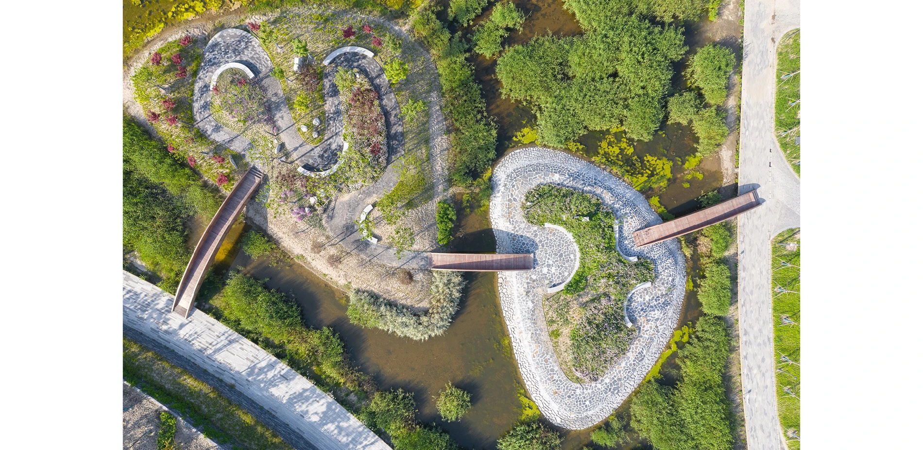 The park provides a sense of expansive nature in the context of a dense urban environment. Trees cover 70% of the site, providing ample shade for the park and contributing to carbon sequestration in the region. Trees and landforms also define the park edges and shape the interior. A palette of native and adaptive species were selected for Shanghai’s climate, including dawn redwood, gingko, willow, cypress, and peach trees that flank the central waterway. The species selection recalls the site’s history as an agricultural village with a small creek edged by peach trees on both sides, evoking Taopu’s namesake (literally “peach river”). A series of interconnected islands—Willow Islands, Maple Islands, and Peach Blossom Island—offer quiet spaces within the larger, more active park, contributing to a variety of experiences and biodiversity throughout. A robust palette of street trees creates continuity between the park and its urban surroundings, and adds character and identity to the larger ecological district.