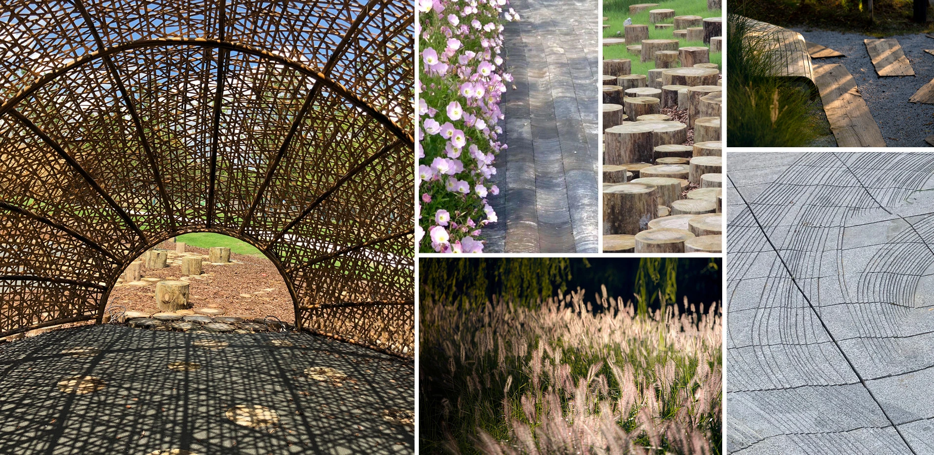 - `- Custom play feature – mixture of wood logs (in variable heights) for field and climbing poles, handmade bamboo shells (Cocoon and Caterpillar Tunnel), and handwoven rope for climbing net, designed by Field Operations with local manufacturing in collaboration with SLADI, local contractor Qinsen Gardens Co., Ltd.