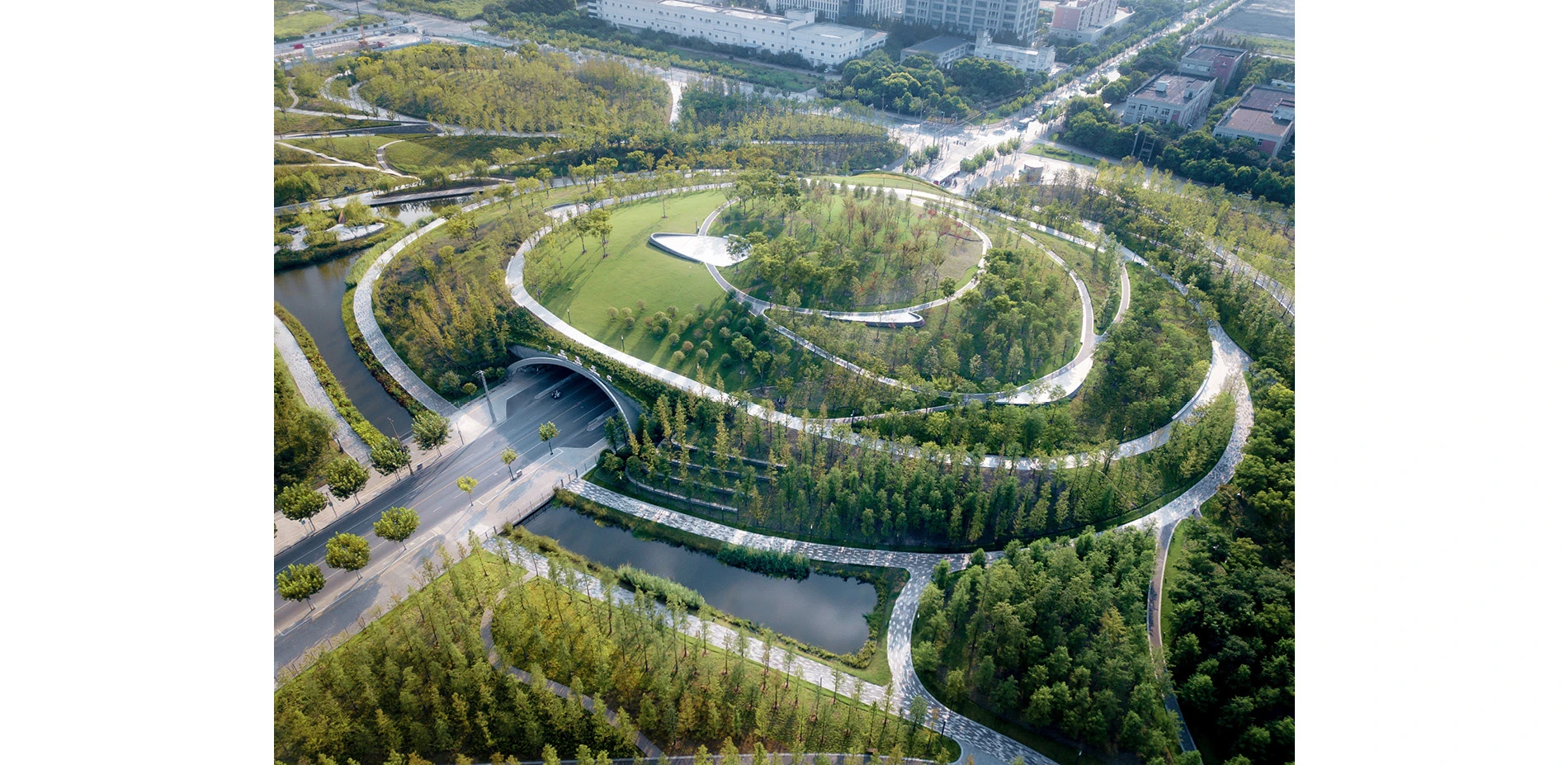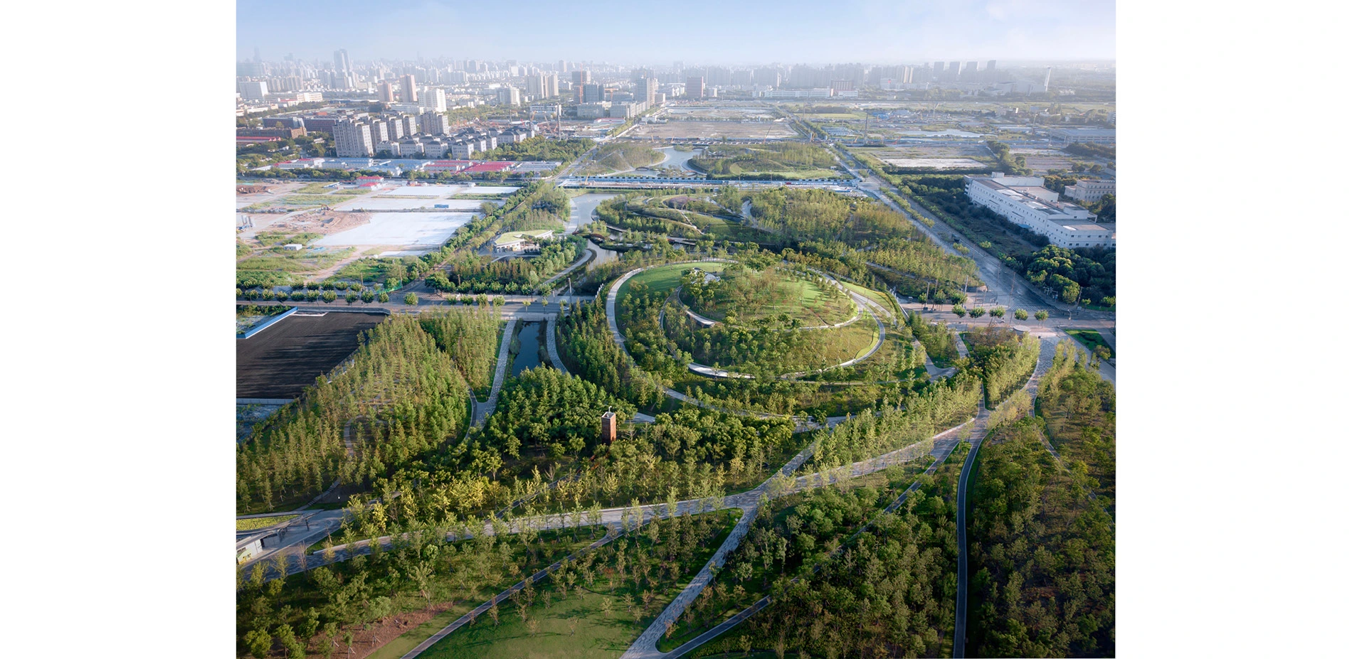 Once a home to industry and its contaminated soils, a new central park for a northwest Shanghai district becomes a lush multi-ecosystem environment that brings biodiversity into the dense city. Achieving 70 percent tree coverage within the site, Taopu Central Park becomes a healing lung for the city while providing ample space for universally accessible recreation and pedestrian activity spread across 237 acres, with multiple transit-proximate entrances. Flood mitigating strategies built into the park around its wetlands—including permeable pavement at roadways—lead to a massive underground pool capable of storing nearly 8 million gallons of water per day. Islands, bridges, and pavilions provide a variety of experiences for visitors to the park to re-engage with sculpted aquatic habitats