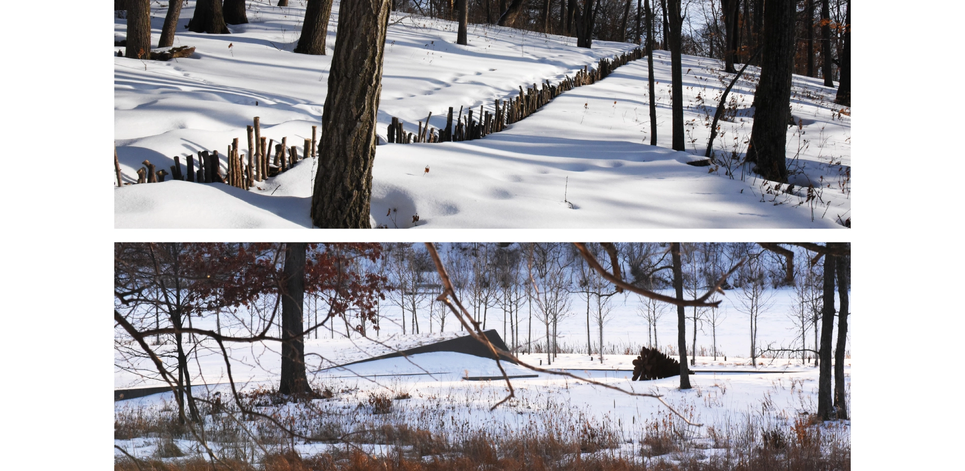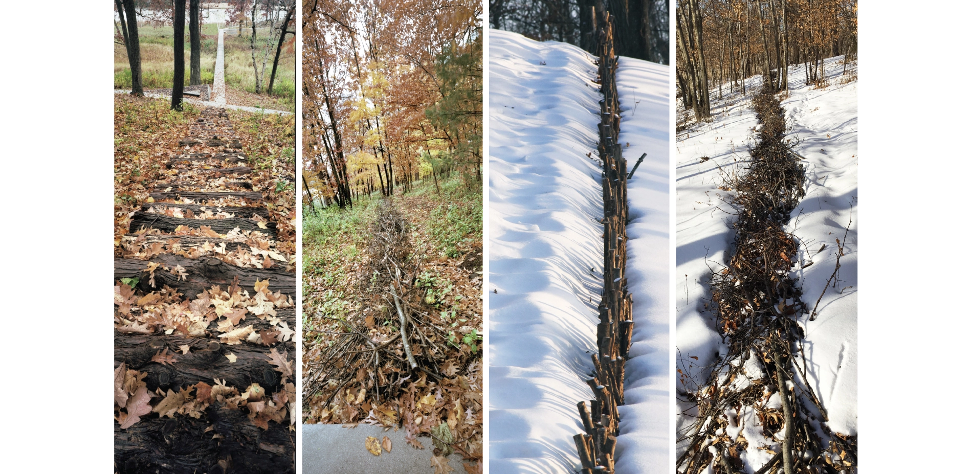 To acknowledge the material-impact of ecological restoration and the human impact on the land, the landscape architect designed art installations that utilize material harvested from the removed invasive species, primarily buckthorn and cedar. Working with Wetland Habitat Restorations they hand-picked various materials, including 42” long sticks, logs, and thinner branches of varying length, and arranged them throughout the site. The art installations respond to their context to enhance the experiential nature of the pathways. In some places they guide a walker’s view through the forest toward infinity in others they skew across the path, drawing one’s eye across a wide spectrum of biomes and restored ecologies.