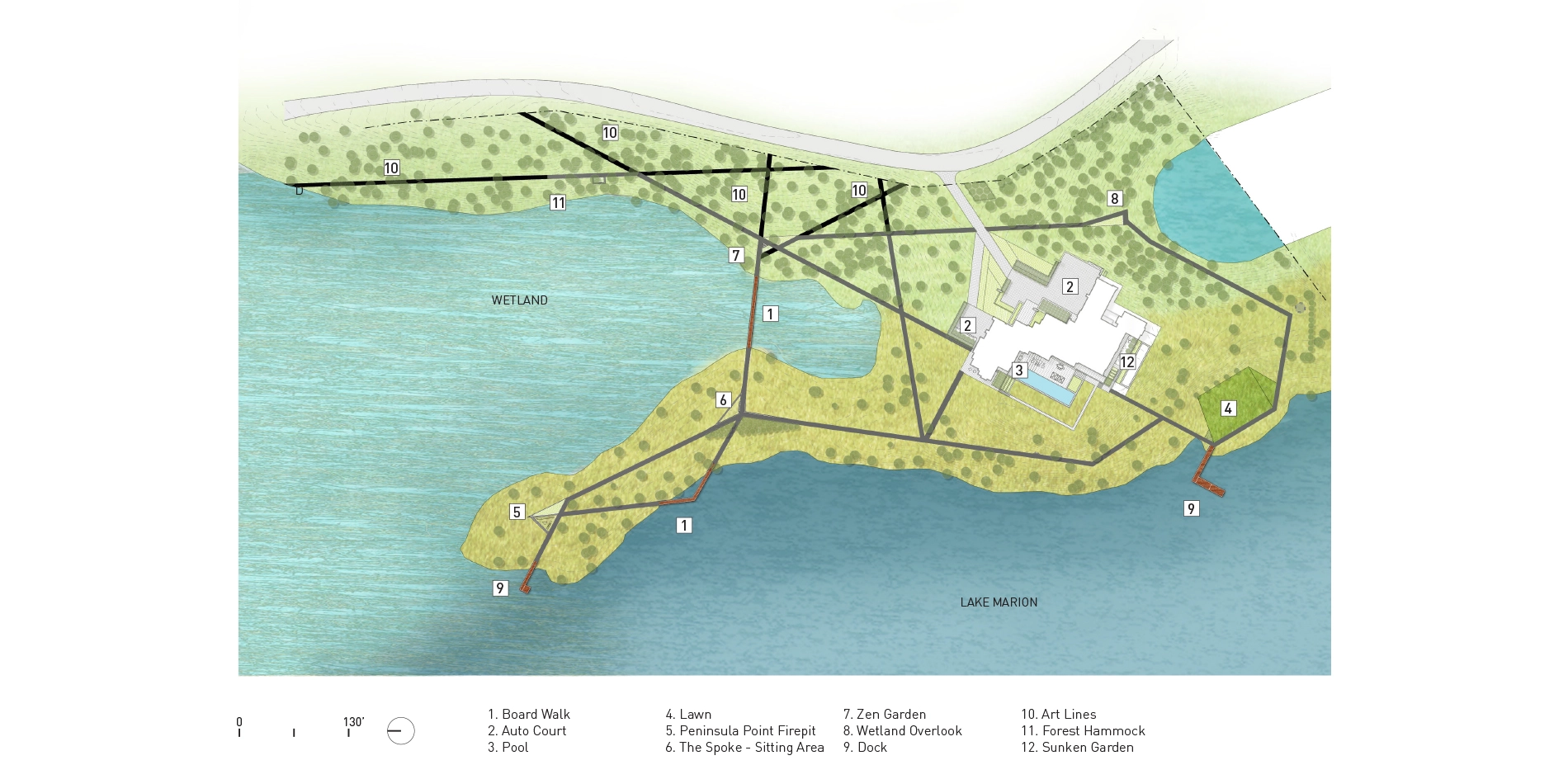 The design concept began with a modest idea: to create a network of linked paths with straight lines that extend from the house with minimal interruption. The goal was a circulation network that would provide accessibility to, and enjoyment of, the restored ecological diversity around Lake Marion. Simplicity of material and form accentuate the dynamism of the surrounding landscapes while ephemeral artworks amplify the circulation network at key ecological transitions and gathering nodes. Because the restoration and circulation networks were of primary importance to the client, the immediate environs of the house were designed to complement and amplify the surrounding environment and expansive circulation network.