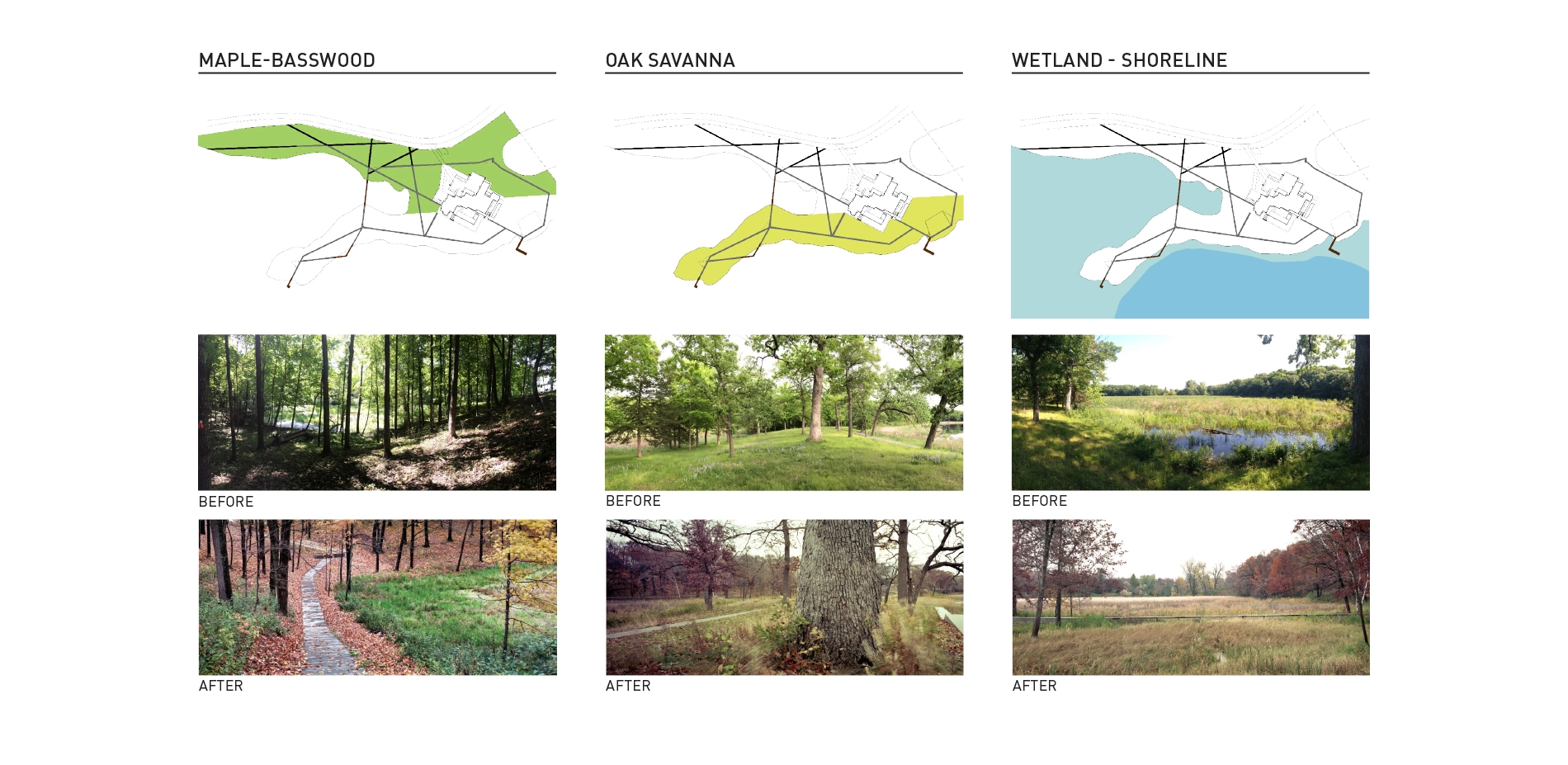In order to restore and improve the diversity of three distinct biomes, numerous management and design strategies were explored and implemented in collaboration with Wetland Habitat Restorations over a three-year period. To enhance the oak canopy and improve views to the surrounding wetlands and lake, cedars and lesser quality trees were removed from the oak savanna that covers most of the peninsula. Within the same biome, a custom shortgrass prairie seed mix was designed to restore the short, compact and showy understory and forbs. In the upland maple-basswood forest adjacent to this, buckthorn and honeysuckle shrubs were removed, and shade-loving groundcovers of native sedges, wild ginger, and fern species were planted. To restore uniform textures of the shoreline and allow the native wetland to shine, hybrid cattails, reed canary grass, and other invasive species were removed along the water.