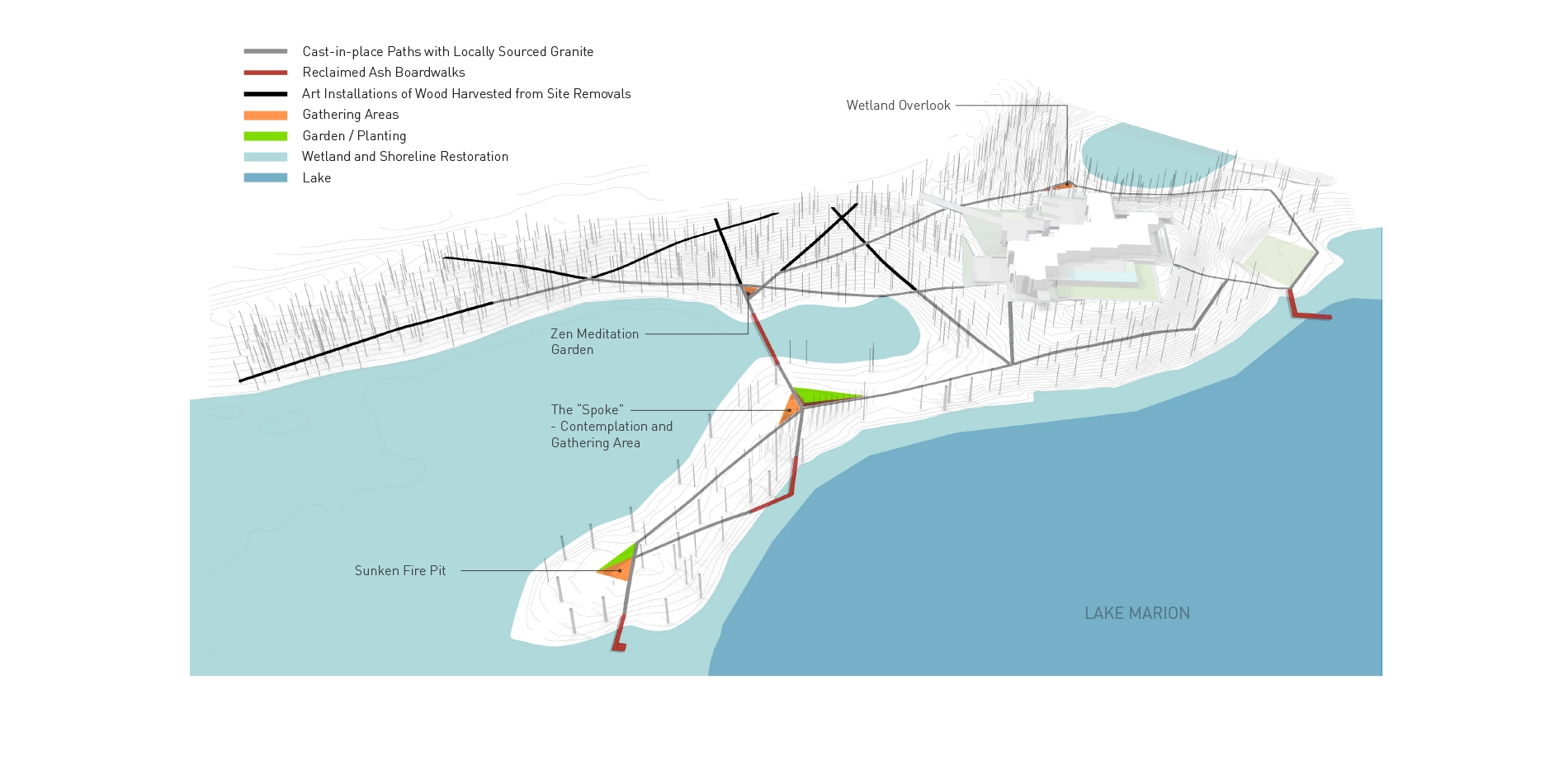 Art, ecology, and restoration merge in a dynamic circulation network of exploration and reflection surrounding a residence on Lake Marion in Minnesota. Twenty-two acres of ecologically degraded landscape were delicately restored around the residence, and an interdependent network of art and accessible pathways was designed to immerse users in their surrounding environment. Linear paths extend in dramatic contrast to the undulating landscape and exaggerate the characteristic topography of the area. Removed invasive species provide the raw material for five distinct art installations that vary dramatically with seasonal cycles. Intersections form striking nodes for contemplation and relaxation amidst the rare diversity of the restored landscape.