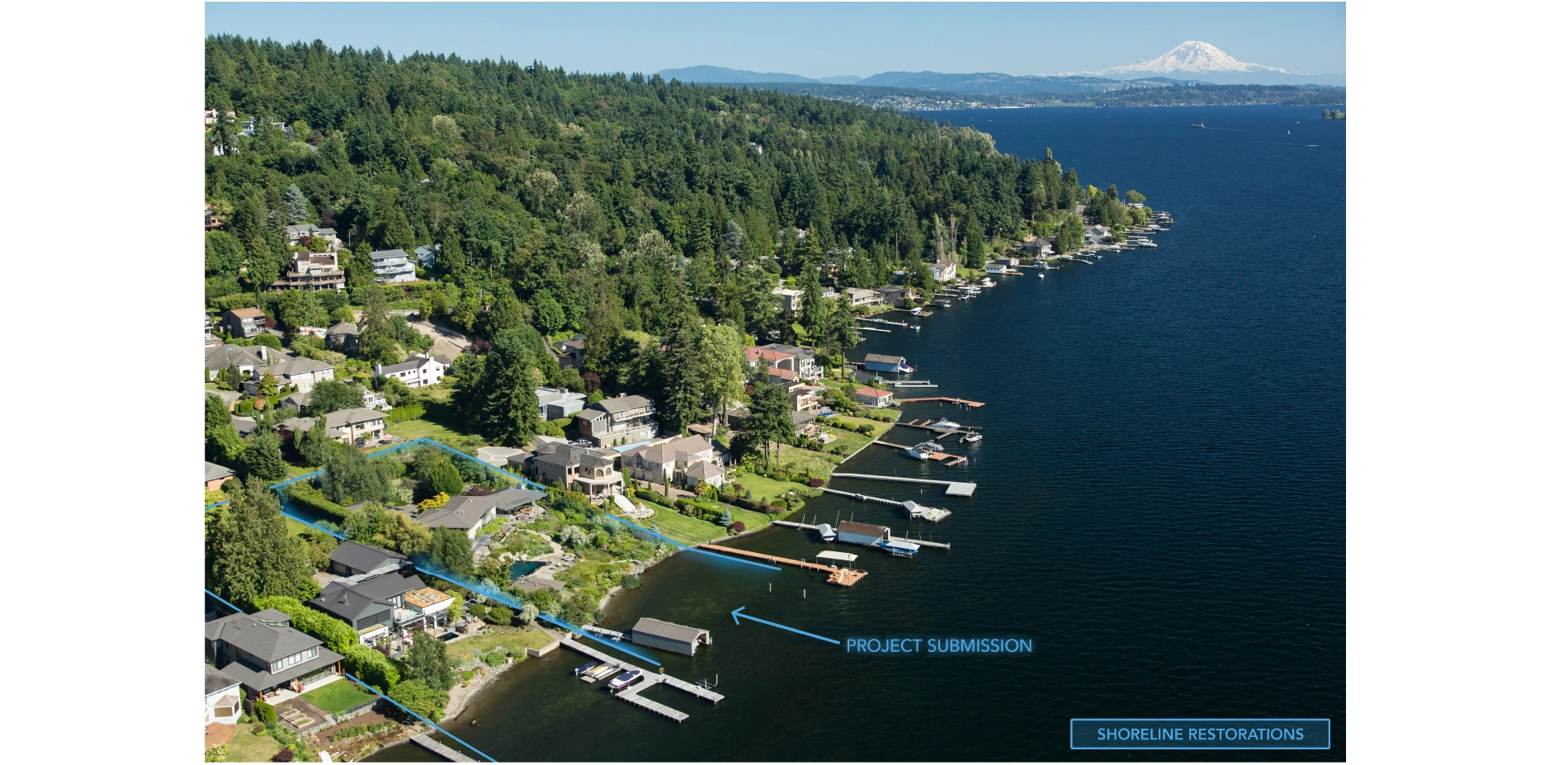 The south-west facing property occupies one acre on the suburban shores of Seattle's Lake Washington. Eighty percent of this lake is ringed by some form of built barrier, frequently backed by intensively managed lawns - both of which threaten the lake's ecology and riparian habitat. With 150 feet of shoreline, the property's potential benefit to local wildlife was choked off by a large concrete bulkhead, installed in the 60's in a misguided attempt to ameliorate boat-wave impact on the lakeshore.