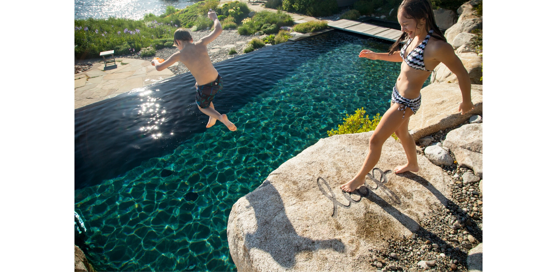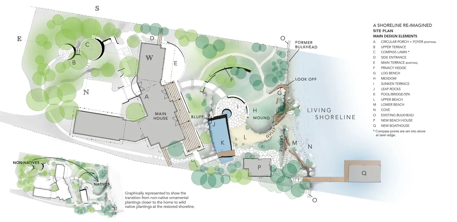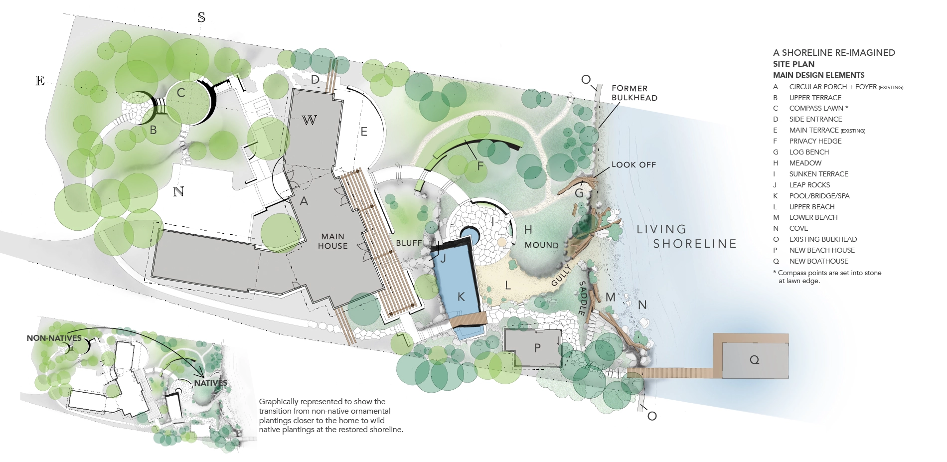 The energy of the land is now changed. No longer limited to a single-shot view of lawn/bulkhead/water, the house now overlooks a dynamic scene with an interlinked foreground, middle-ground and background. No longer severed by a bulkhead, the main terrace and new living shoreline are seamlessly connected. Indeed, the new beach now extends some 70 feet inland to terminate at the Pool.