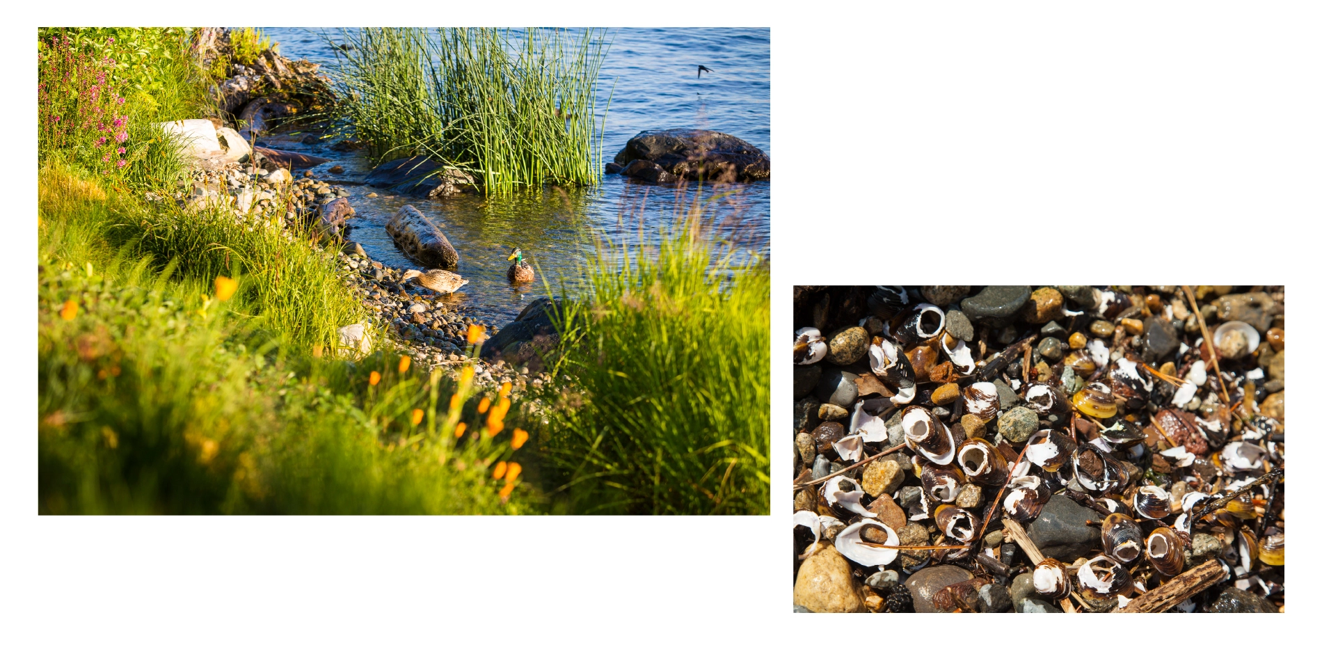 The project was in two parts. Waterside, the restoration required reproducing a "living" shoreline's gradual shelving of size-specific pebbles (rounded, to encourage salmon spawning) to naturally attenuate wave action. Large woody debris anchored to the substrate provided additional protection and allowed materials and sediment to gather, creating conditions for life. With underwater plant-life established, fish now swim in these calmer shallows and ducks and otters can come ashore. The 'upland' side of the landscape uses native plants extensively, providing food and dense cover, which promotes the population of invertebrates (1). Abundant insects are an important food source attracting local birds, which in turn attracts a Cooper's Sparrowhawk - now a frequent visitor. These ecological relationships have significant amenity value to the client.