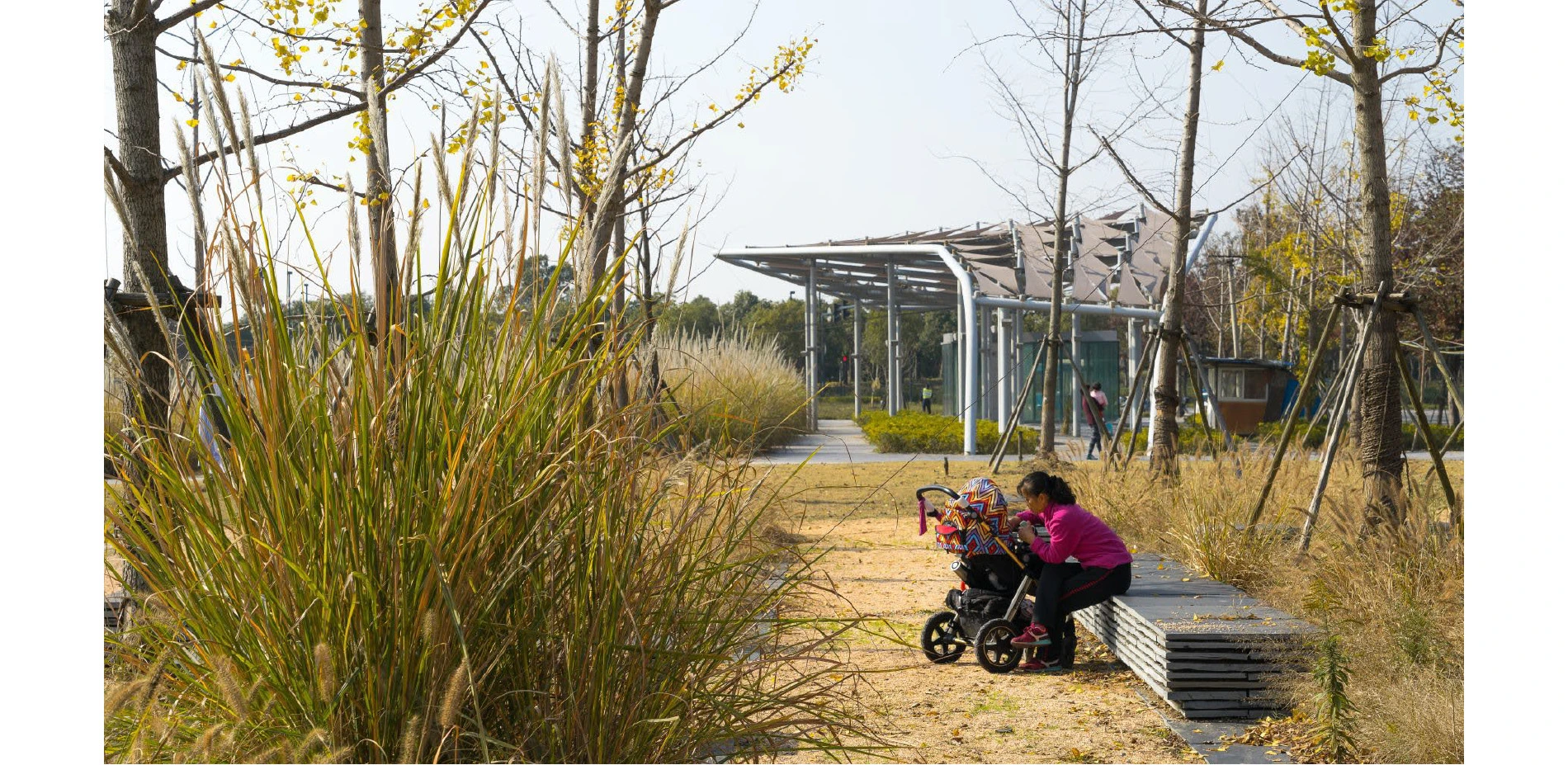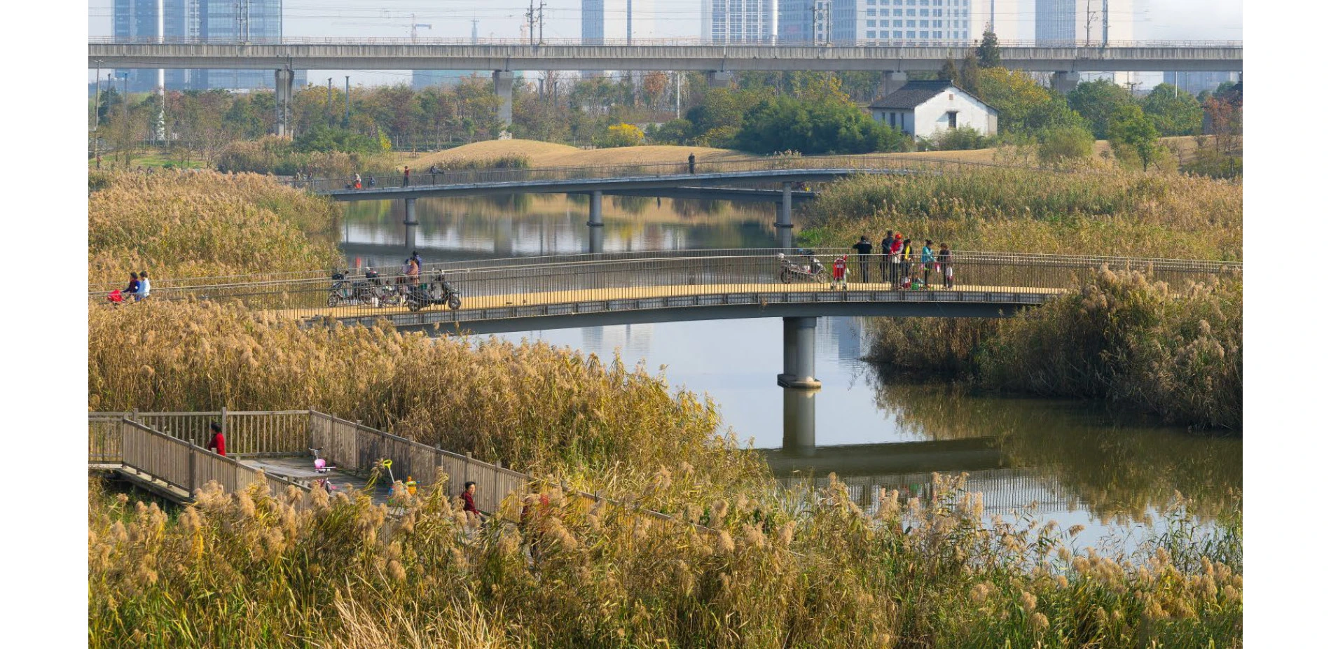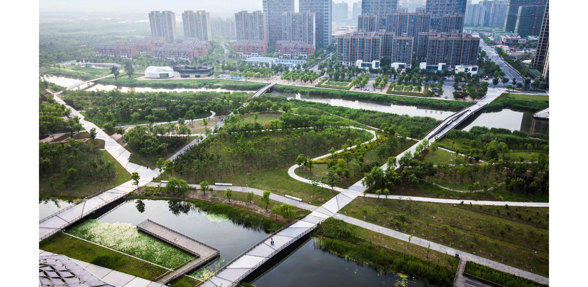 Jiading Park is the social and recreational hub of the burgeoning district, and is connected to a wider network of pedestrian pathways. In total, about 18 hectares of the park are dedicated to recreational uses. About 6,500 square meters of development area features restaurants, art galleries, and civic program. There are also 17 kilometers of paths and boardwalks throughout the park, with links from adjacent residential neighborhoods at multiple points to facilitate accessibility. As a catalyst for the new development, it is now framed by government, cultural, and civic buildings, mixed-use developments, and residential high-rises. It is also highly connected to the regional public transit network, with the Baiyun Road station of the Shanghai metro linking the park to downtown Shanghai in approximately 45 minutes via subway Line 11.