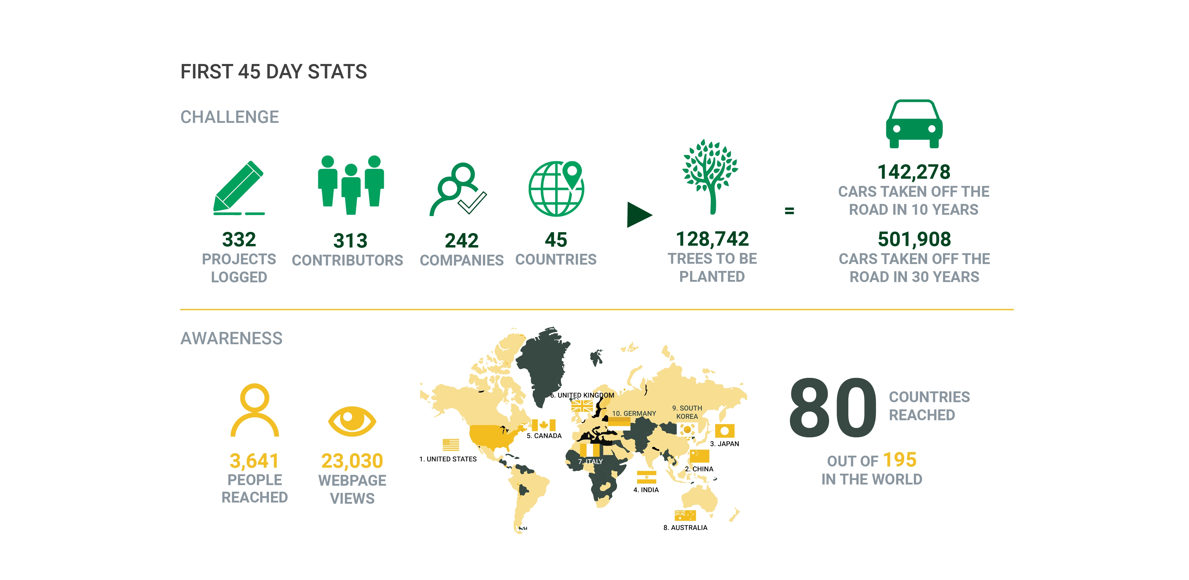 Within the first forty-five days of the launch, initiative awareness reached at least 80 countries and thousands of people. Over 330 projects were logged by 313 contributors - reduction impacts equivalent of taking over 500,000 cars off the road in 30 years by planting close to 130,000 trees. Although initial participation shows a clear increase in awareness, research must be advanced to continue to improve the efficacy of these results – specifically advancements to better understand soil disturbance and more detailed sequestration rates for plant communities beyond tree species.