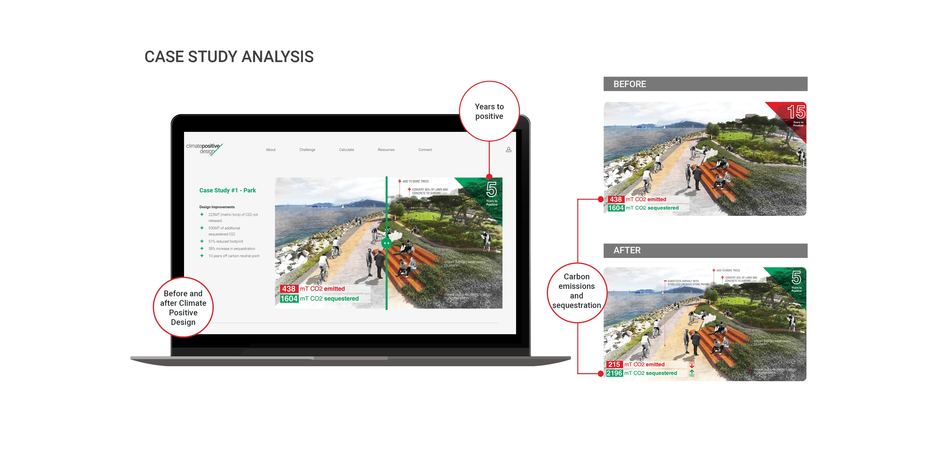 Several Design Challenge options were reviewed by Advisory Partner organizations and the agreed upon methodology was to focus on “years to positive” (YTP) as this metric requires both reducing emissions and increasing sequestration. To determine targets for the Climate Positive Design Challenge, an average of the case study projects YTP was selected. For parks, gardens, campuses the YTP target is five years and for streets and plazas the target is set at 20 years.