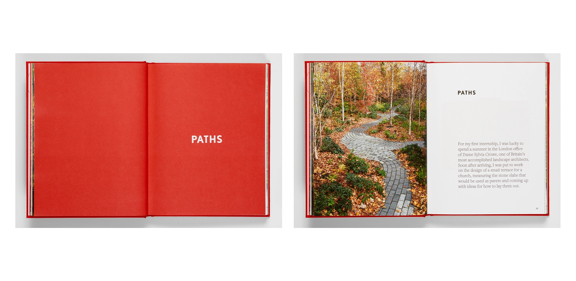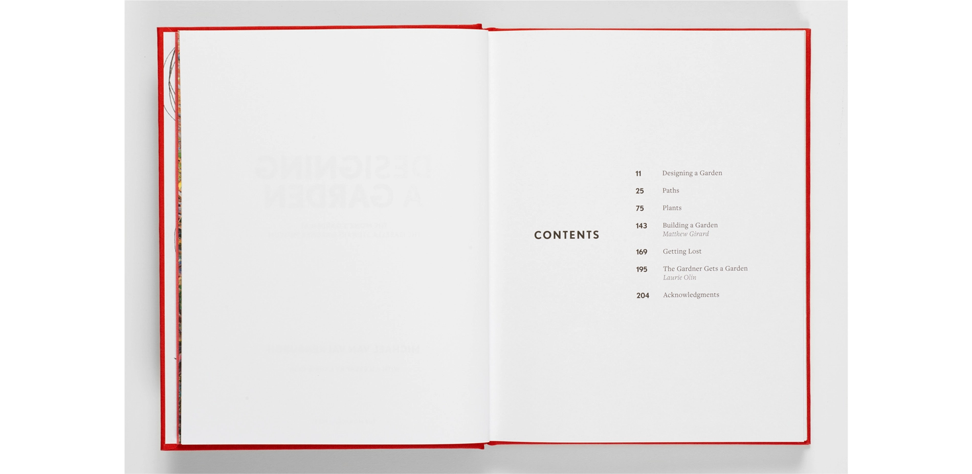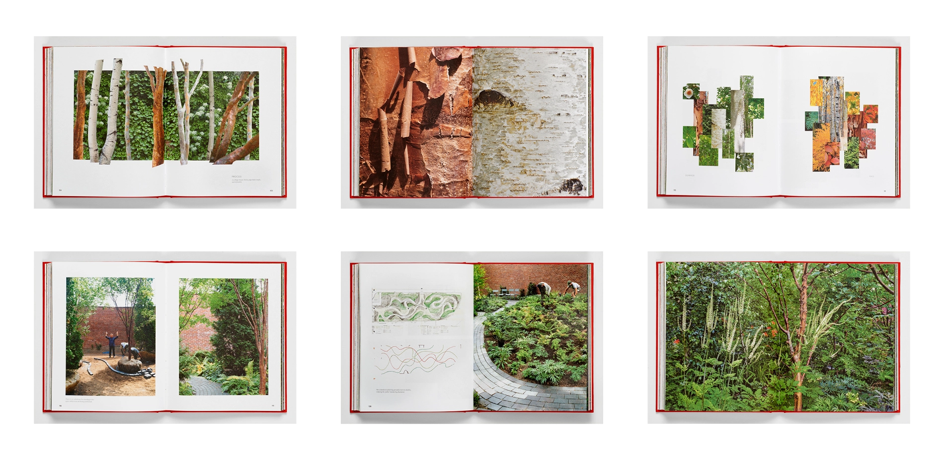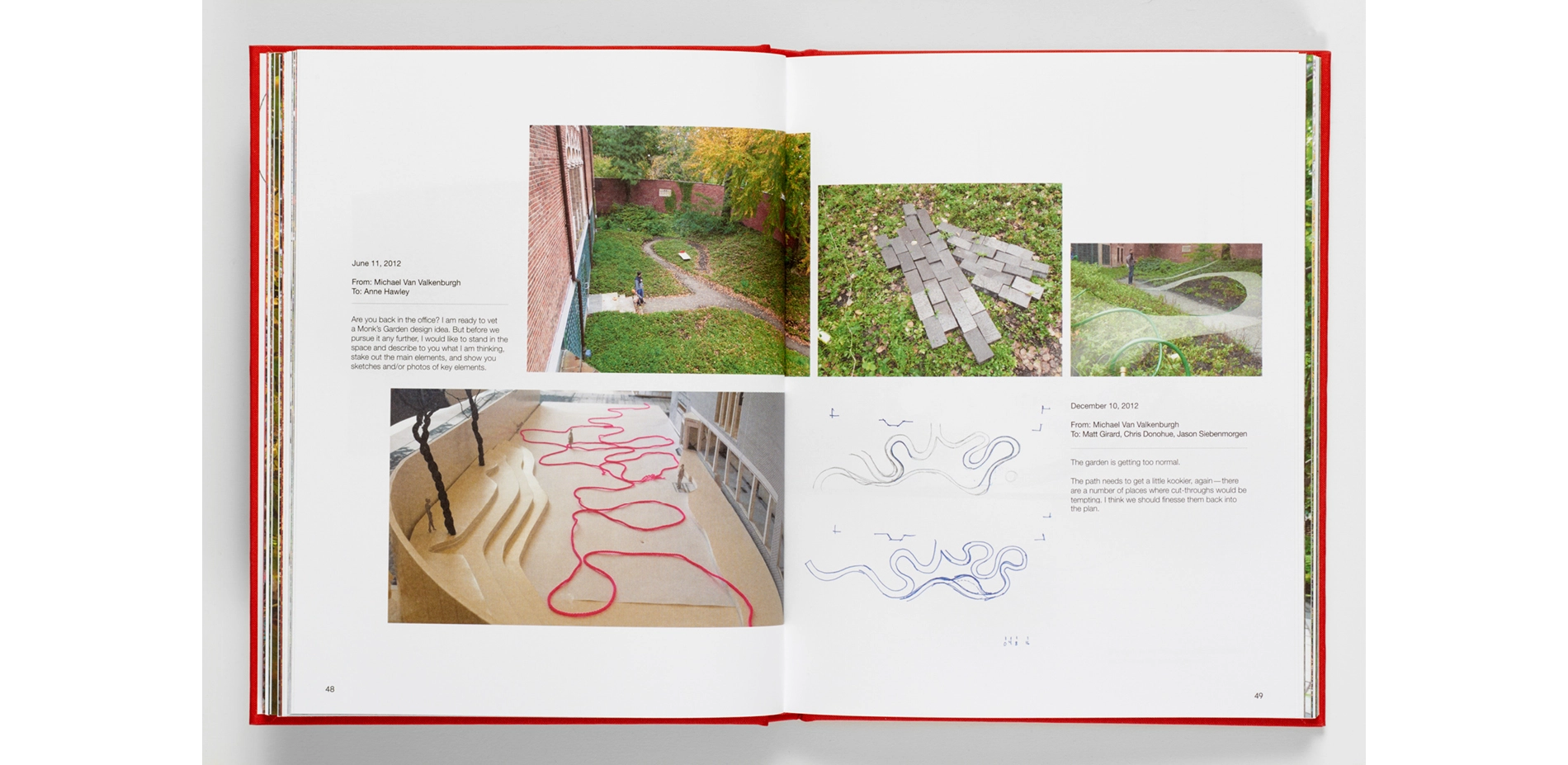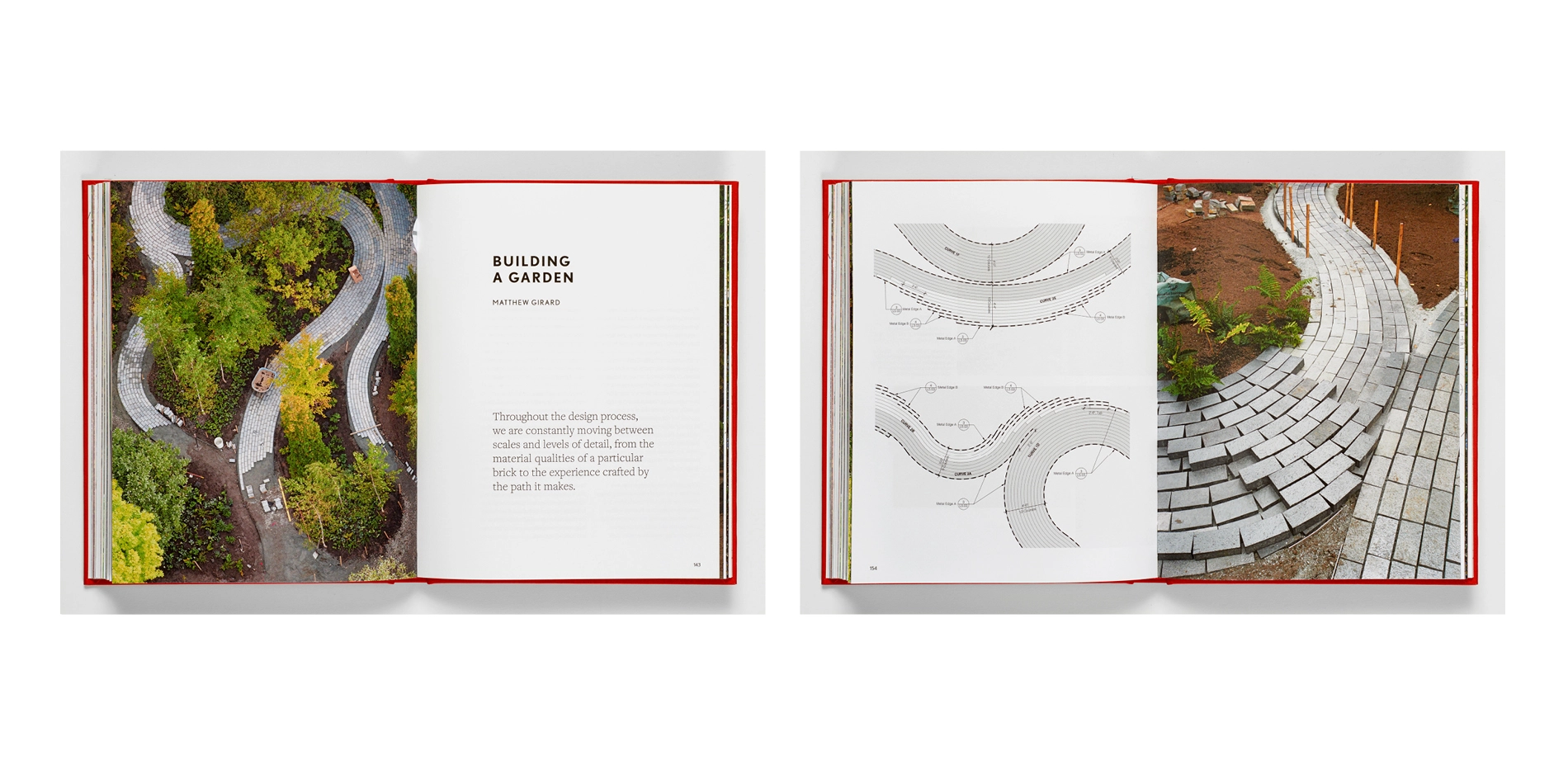 Cara Walsh, a book and landscape designer, designed the book to present the messy process of making a garden in a format that is accessible to experienced landscape architects and novice designers alike. The goal of the book design was to support and enhance the written text with rich images that reveal the design process, not just as a repository for everything that took place, but as a thoroughly considered step-by-step example of how a garden is made. Full-bleed images immerse the reader in the garden’s lushness, while cleverly formatted spreads pair process images with text from emails exchanged throughout the building of the garden to pull back the curtain on how the project took shape. The structure of Designing a Garden illustrates the nuts and bolts of making the Monk’s Garden and weaves in information about the thinking behind the design decisions and the creative process. The book is paced to achieve a rhythm that allows readers to contemplate the written words and delight in the powerful images. It seeks to illuminate how and why gardens are made, in addition to celebrating the finished product. In the process, the book mounts a case for the ongoing relevance of garden-making—not just as objects of admiration or status, but as places to be enjoyed and as human creations that have inspired a continuous process of learning, testing, retrying, and caretaking.
