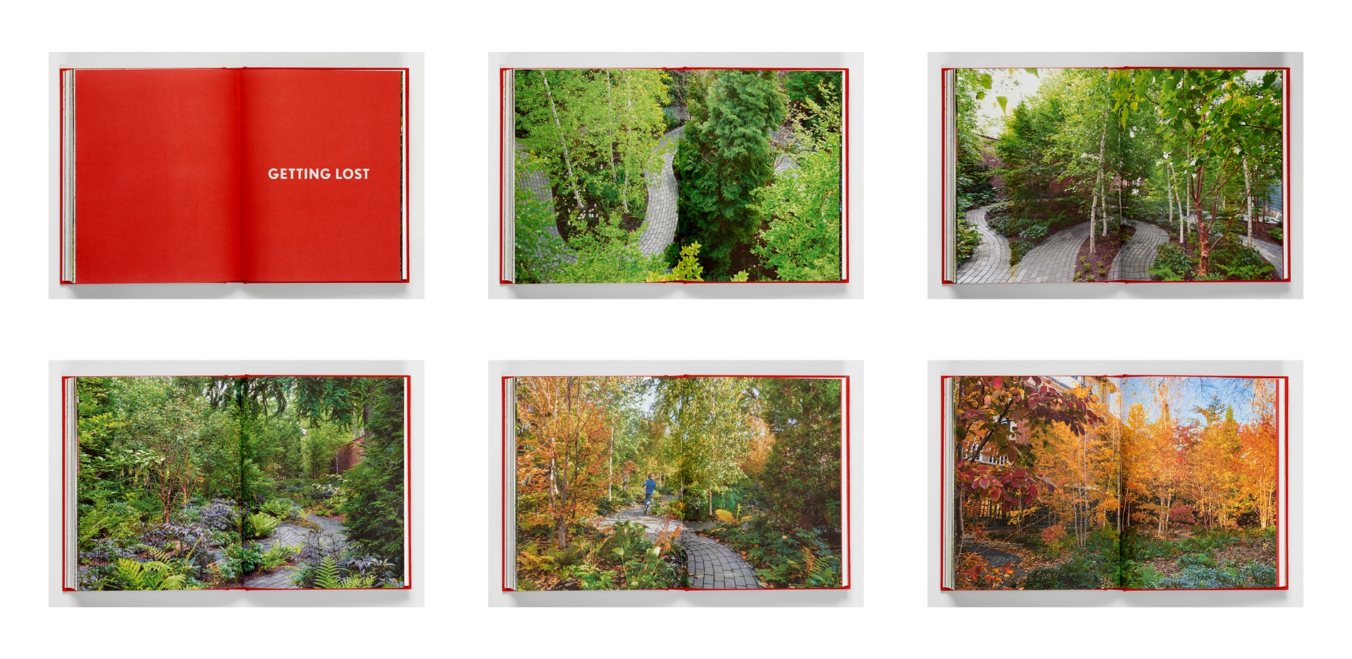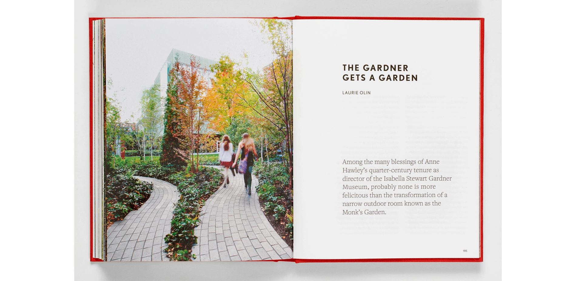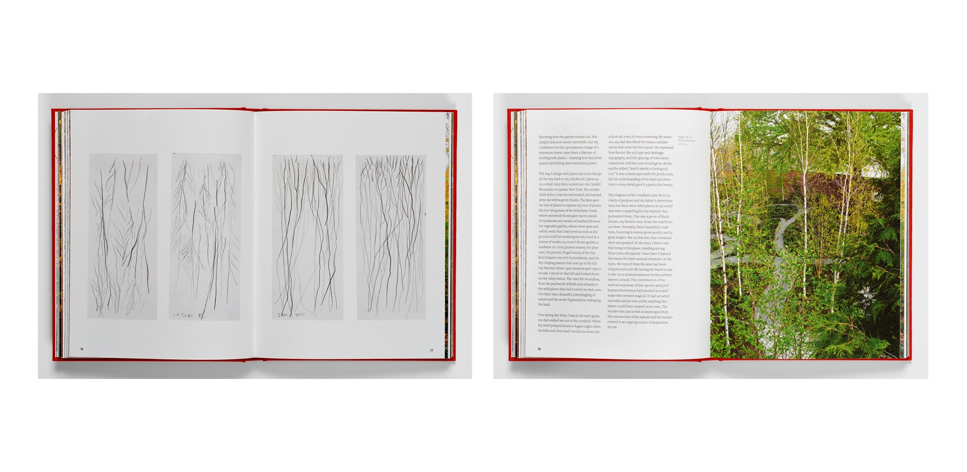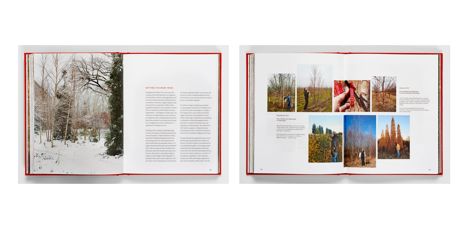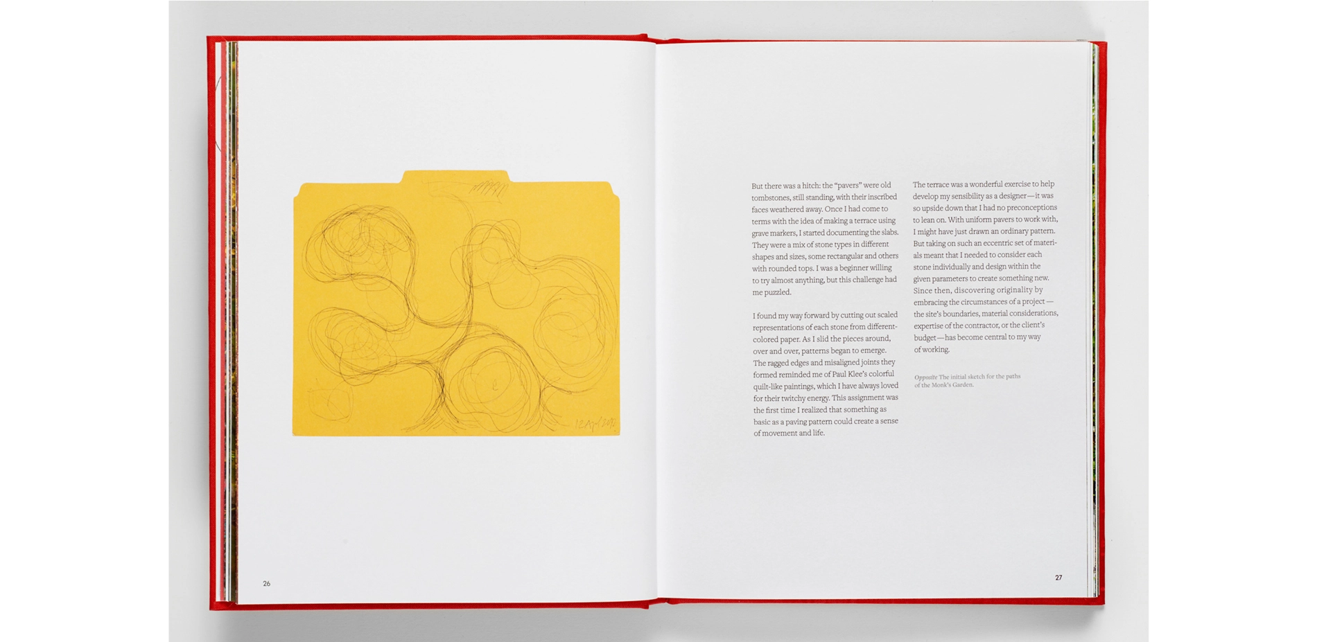 Cara Walsh, a book and landscape designer, designed the book to present the messy process of making a garden in a format that is accessible to experienced landscape architects and novice designers alike. The goal of the book design was to support and enhance the written text with rich images that reveal the design process, not just as a repository for everything that took place, but as a thoroughly considered step-by-step example of how a garden is made. Full-bleed images immerse the reader in the garden’s lushness, while cleverly formatted spreads pair process images with text from emails exchanged throughout the building of the garden to pull back the curtain on how the project took shape. The structure of Designing a Garden illustrates the nuts and bolts of making the Monk’s Garden and weaves in information about the thinking behind the design decisions and the creative process. The book is paced to achieve a rhythm that allows readers to contemplate the written words and delight in the powerful images. It seeks to illuminate how and why gardens are made, in addition to celebrating the finished product. In the process, the book mounts a case for the ongoing relevance of garden-making—not just as objects of admiration or status, but as places to be enjoyed and as human creations that have inspired a continuous process of learning, testing, retrying, and caretaking.