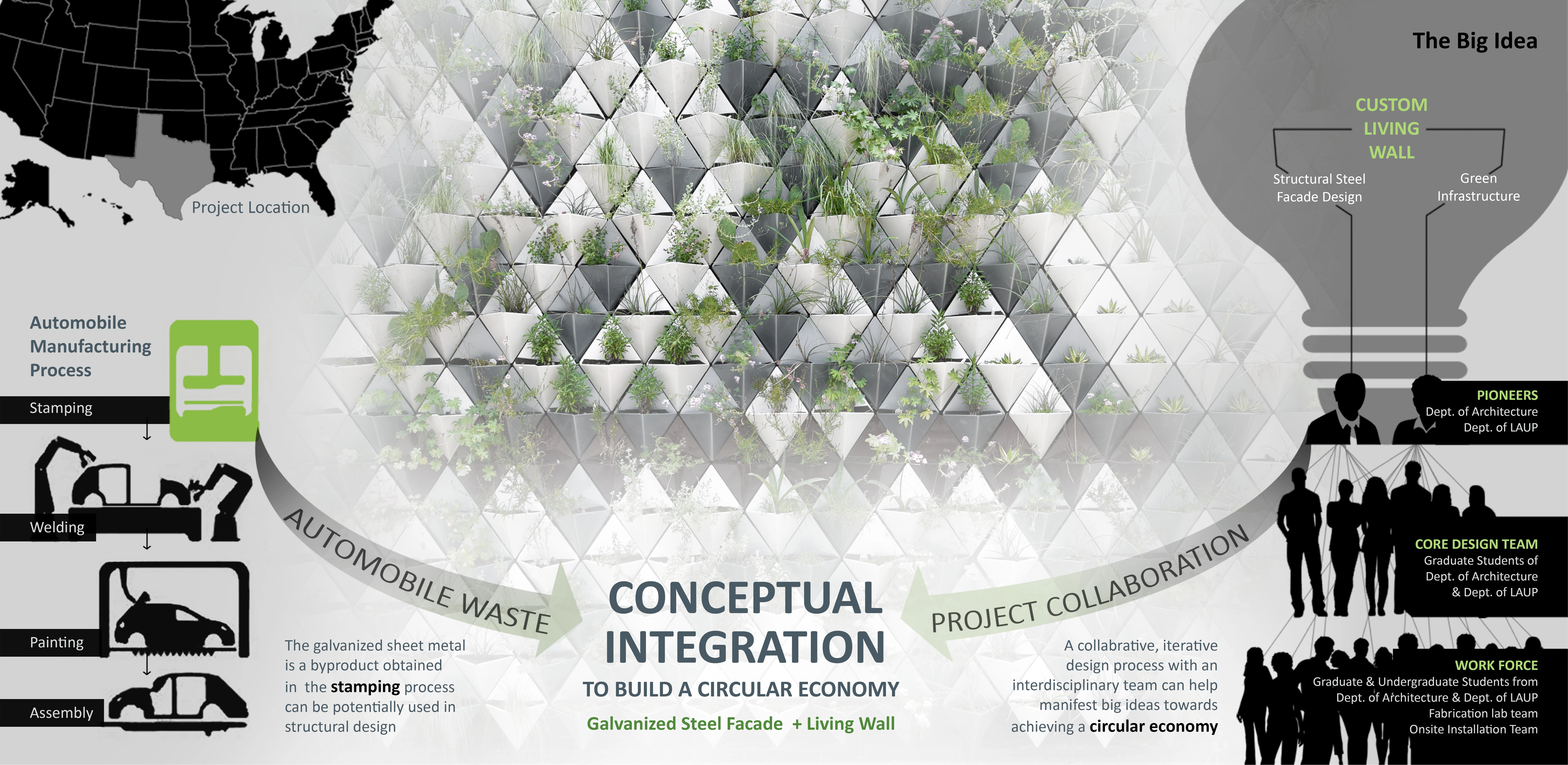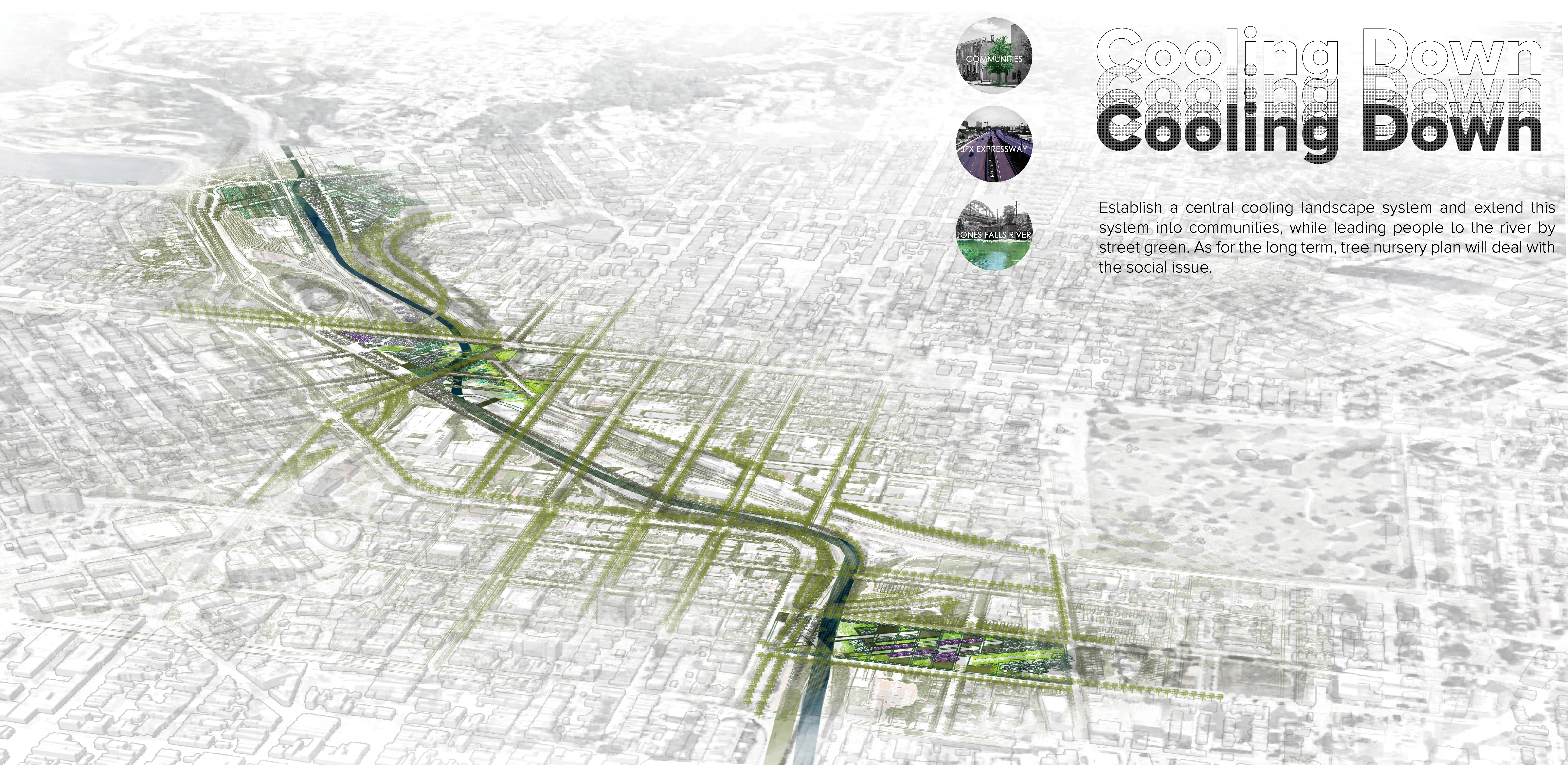 Detroit, a post-industrial city, is experiencing the aftershocks of intensive industrial development, industrial collapse, and sudden depopulation. After rapid decentralization of the auto industry, the one-time “motor city” powerhouse is now dealing with wide-scale blight and an under-funded, underused urban infrastructure originally built around cars and manufacturing. The Delray neighborhood represents the most extreme of these post-industrial challenges. Remaining inhabitants suffer from respiratory illnesses and cancer as neighborhood lots continue to be zoned for heavy industry. This project finds opportunity in these conflicts to develop an urban template for health, resiliency, and sustainable land use. The green infrastructure proposed here symbiotically knits incompatible land uses together, providing spaces to inhabit that simultaneously fortify its inhabitants, cleaning the air they breathe. A series of windbreak hedgerow typologies target specific “ailments” in Delray’s infrastructure, providing an economically self-sustaining foundation that judiciously connects to the city’s existing healthy assets. In giving back to its underserved inhabitants, the Delray Carbon Forest reveals a new type of productivity that is possible for the post-industrial city.