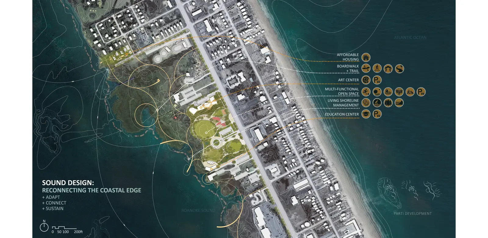 The Sound Design project proposes a new civic space for the Town of Nags Head, North Carolina. Nags Head is a coastal community located on the Outer Banks, which situates it as a premier location replete with beautiful and rich natural resources. These characteristics make it an attractive place to live, work and visit. The project is organized around three main issues: ENVIRONMENT, ECONOMY, and WELL-BEING. Using these foci, the project aims to promote a coastal lifestyle that preserves coastal heritage while reducing the impacts of climate change through the use of adaptive, sustainable and connective strategies. The primary design elements include: shoreline management, multi-functional open spaces, and a publicly accessible sound-side circulation system that fulfills the needs of the community while reconnecting the critical ecologies along the coastal edge. The goal of this proposal is to create a model landscape for future soundside planning.