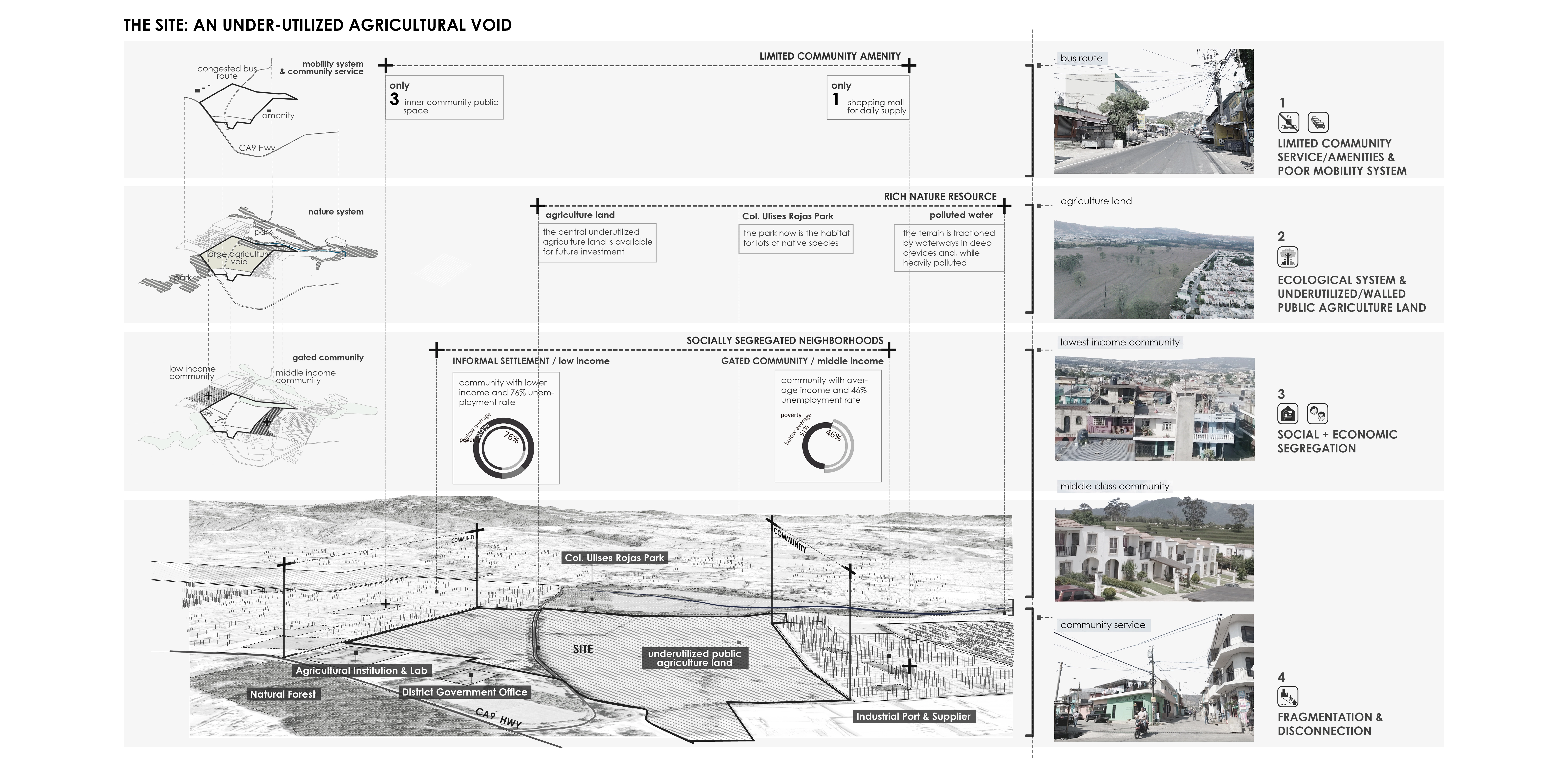 Close to 50% of the terrain is idle, and the other half is subject to monocultural agricultural practices. To the north of the void, the terrain is fractioned by waterways in deep crevices and, while heavily polluted, they nourish densely vegetated areas. The agricultural property segregates low-income informal settlements located to the west of the void from middle-income gated communities to the west. The area lacks jobs, schools, medical facilities, sport, and recreational facilities. Accessibility is only provided by two-lane congested roads (which were the means of access to this previously rural precinct), thus accessibility is difficult, and public transportation is poor.