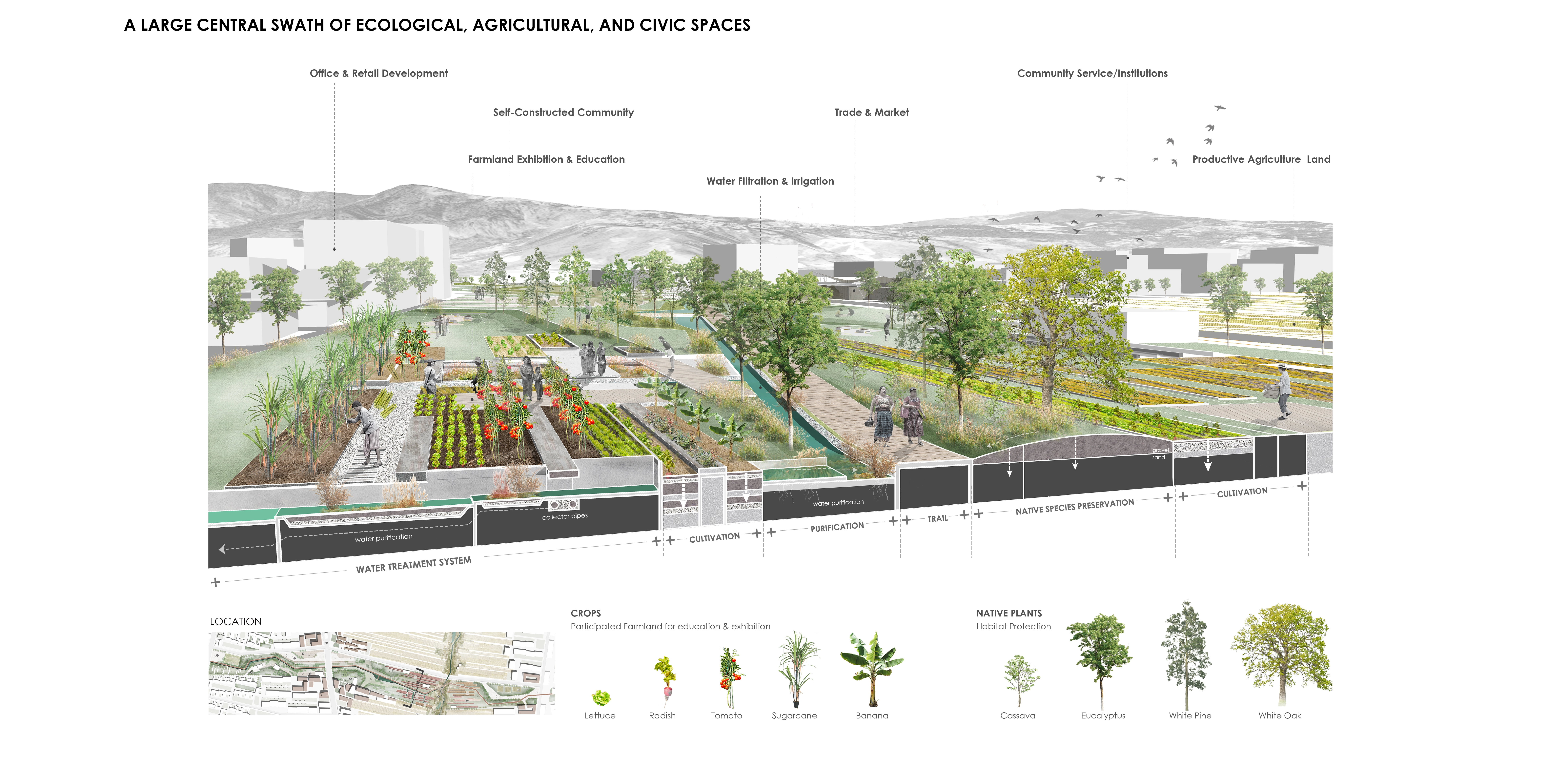 We envision this urban void and the special opportunity to create an ecological and agricultural friendly district, stitching the spatially and socially segregated neighborhoods, reversing the dormitory city conditions and creating new opportunities for economic growth and urban amenities. -