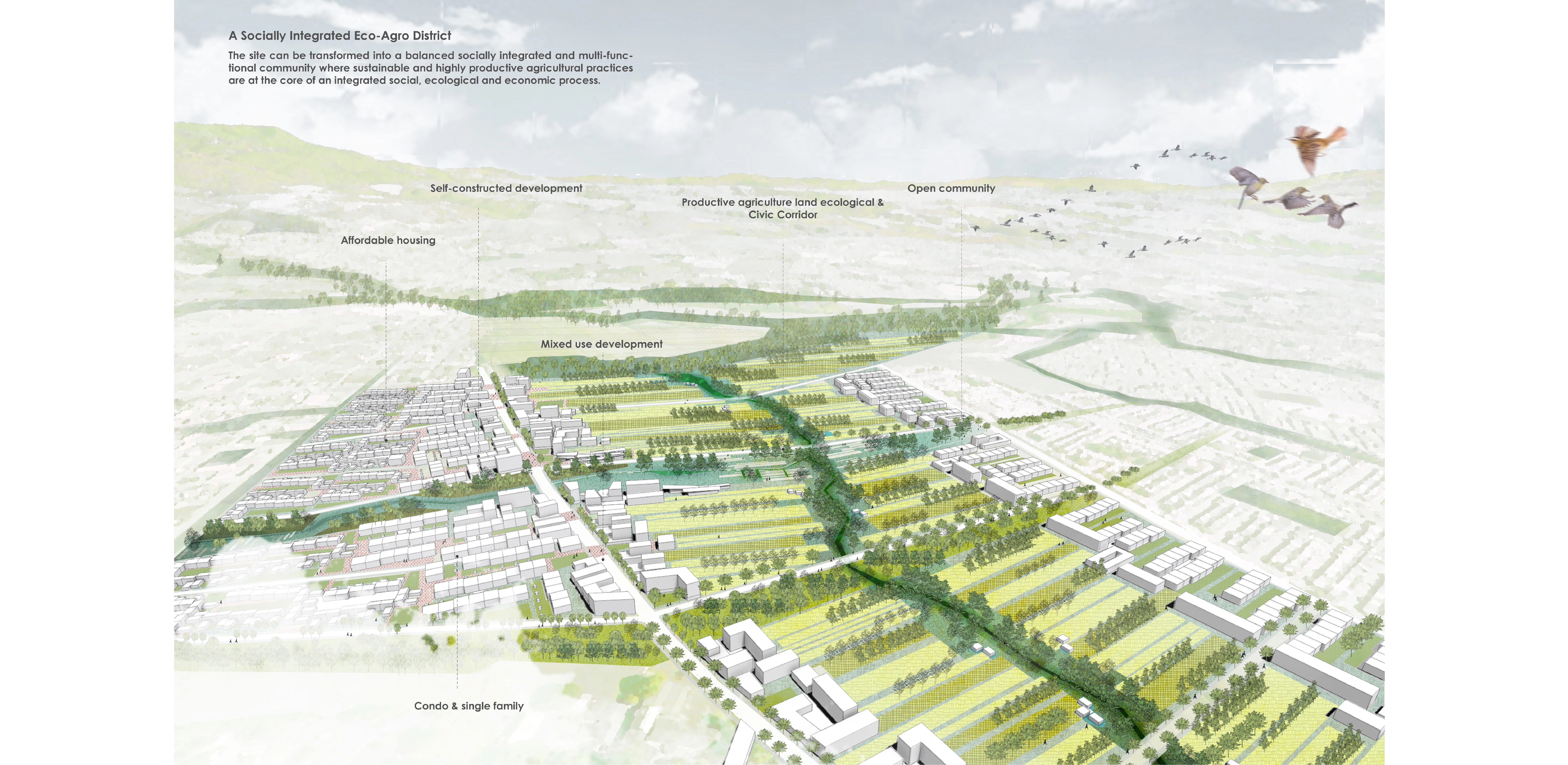 This currently under-utilized and homogeneous agricultural site, which separates informal from formal neighborhoods, can transform the area into a balanced socially integrated and multi-functional community where sustainable and highly productive agricultural practices are at the core of an integrated social, ecological and economic process.