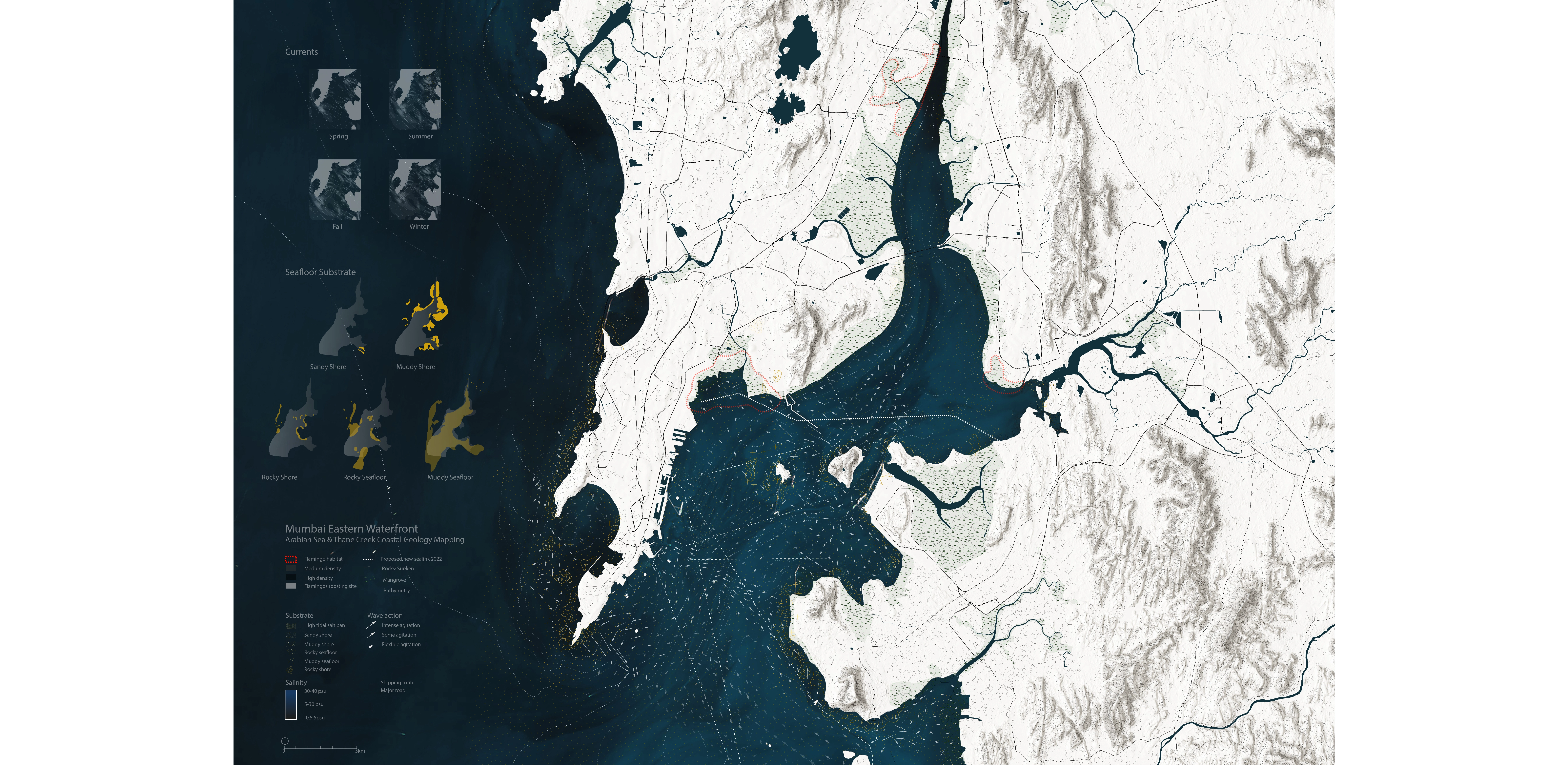 The Mumbai Eastern Waterfront is one of the largest ports in the city; it is approximately 1800 acres in area and is the site of industrial activities, port activities, and formal and informal housing. All these activities are causing pollution outflow into the water, damaging the ecological habitat.