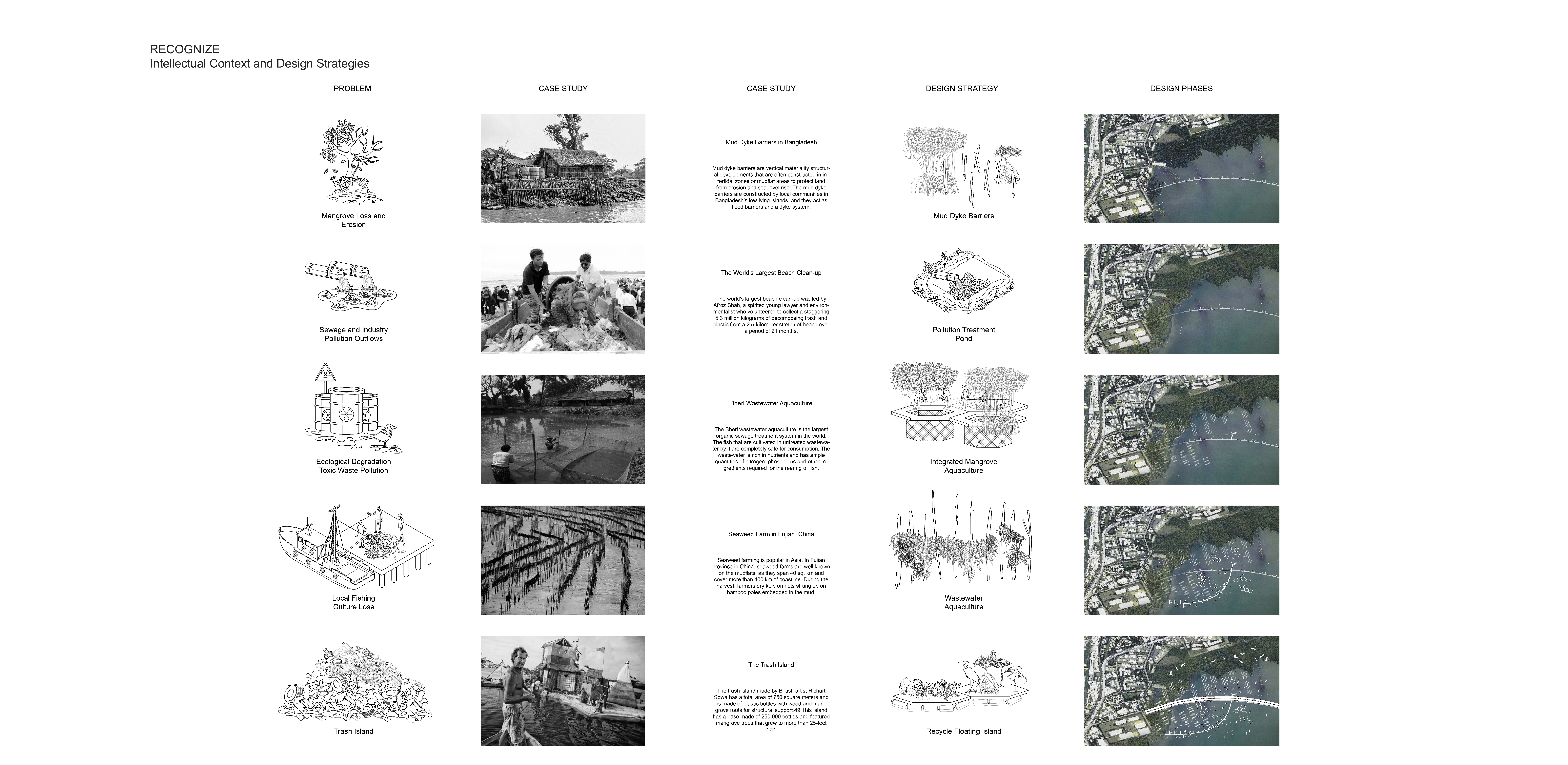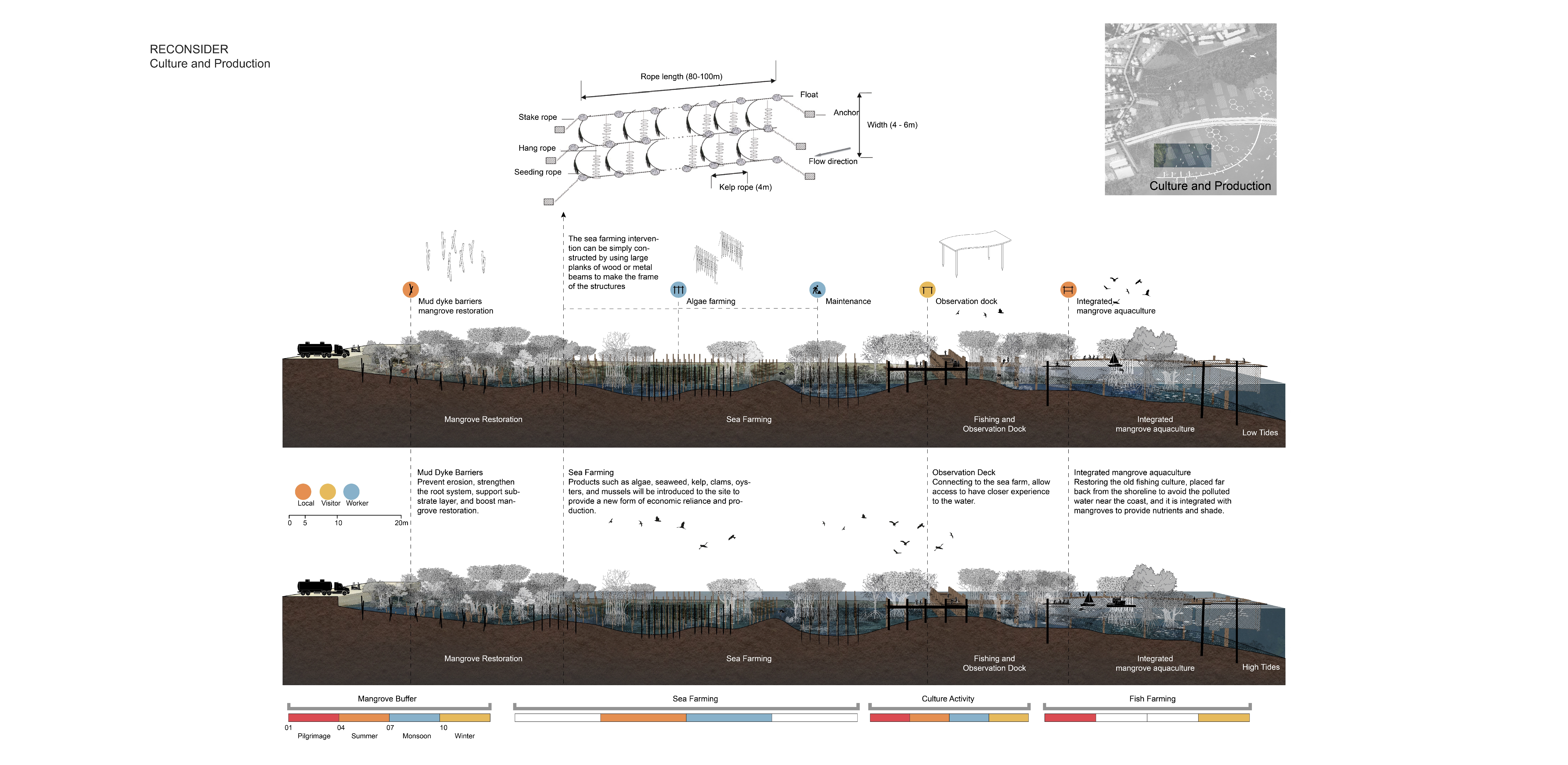 In response to the current issues, the design explores a series of lo-tech interventions used to rethink the shoreline through pollution and treatment, culture and production, and recreation and ecology. The first phase is to create a buffer along the shoreline by inserting a mud dyke barrier to prevent erosion as well as to restore the mangroves. The second phase involves providing wastewater treatment at the outflow area through aquaculture and algae farming while taking advantage of pollutants to introduce a new form of economic reliance and to use wastewater as a resource for aquaculture production. The integrated mangrove aquaculture provides opportunities to create a network of fish farms within the mangrove to provide nutrients for the fish and shelter for fishing. Further, a new place for gathering should be built by extending the existing dock, and a series of floating islands made of recycled materials that are adaptable and flexible to the monsoon season should be created.