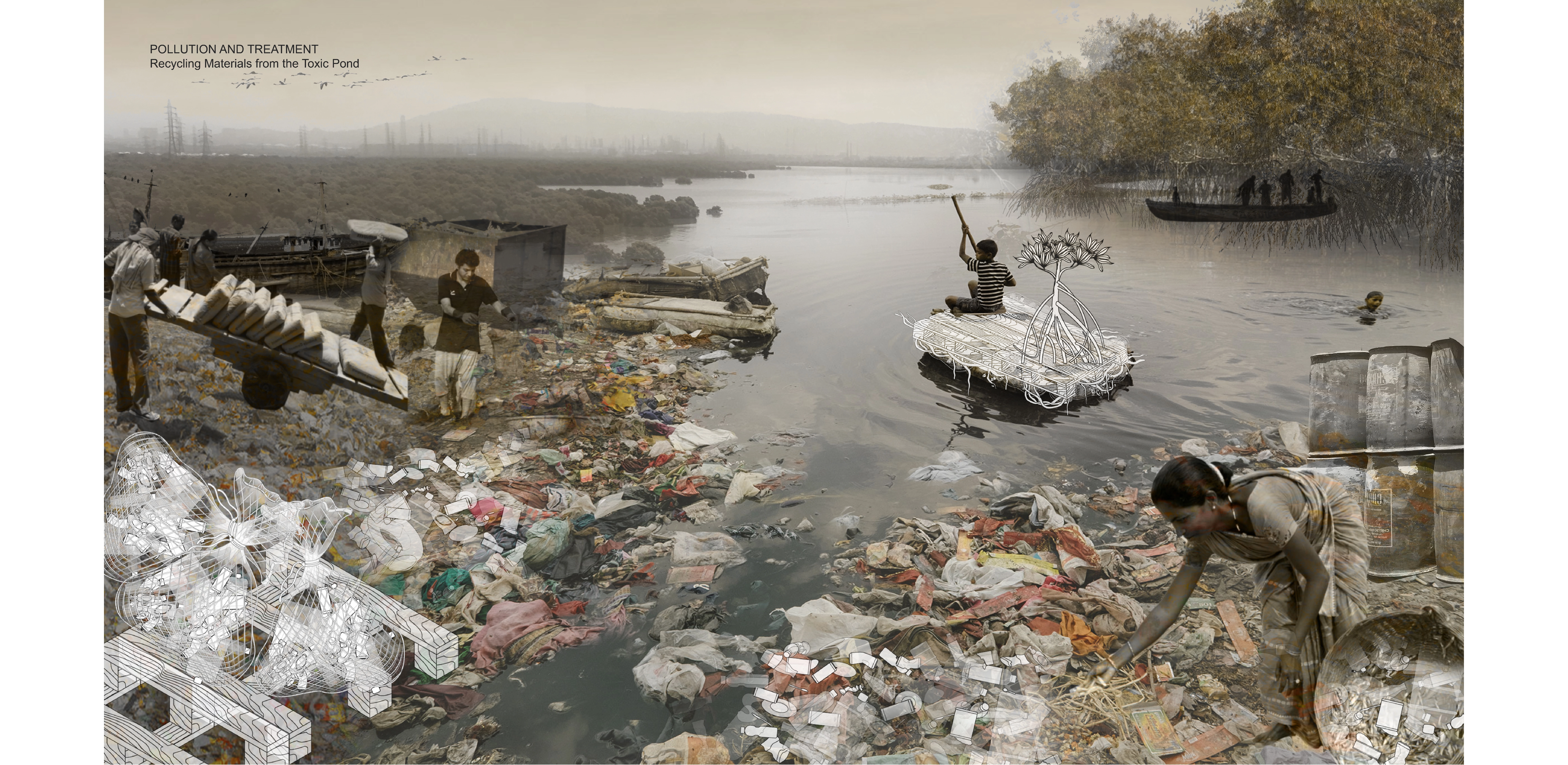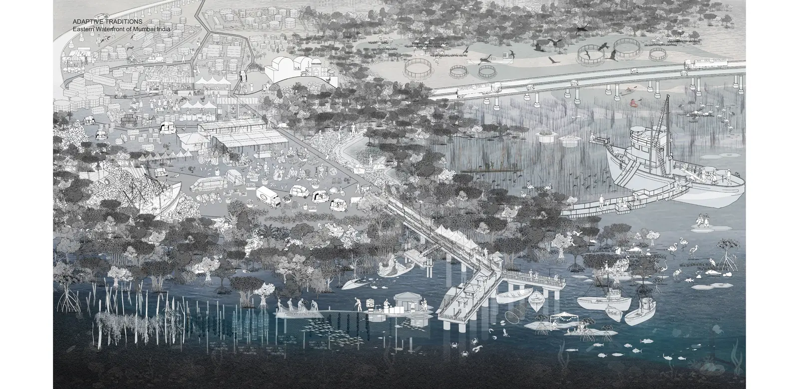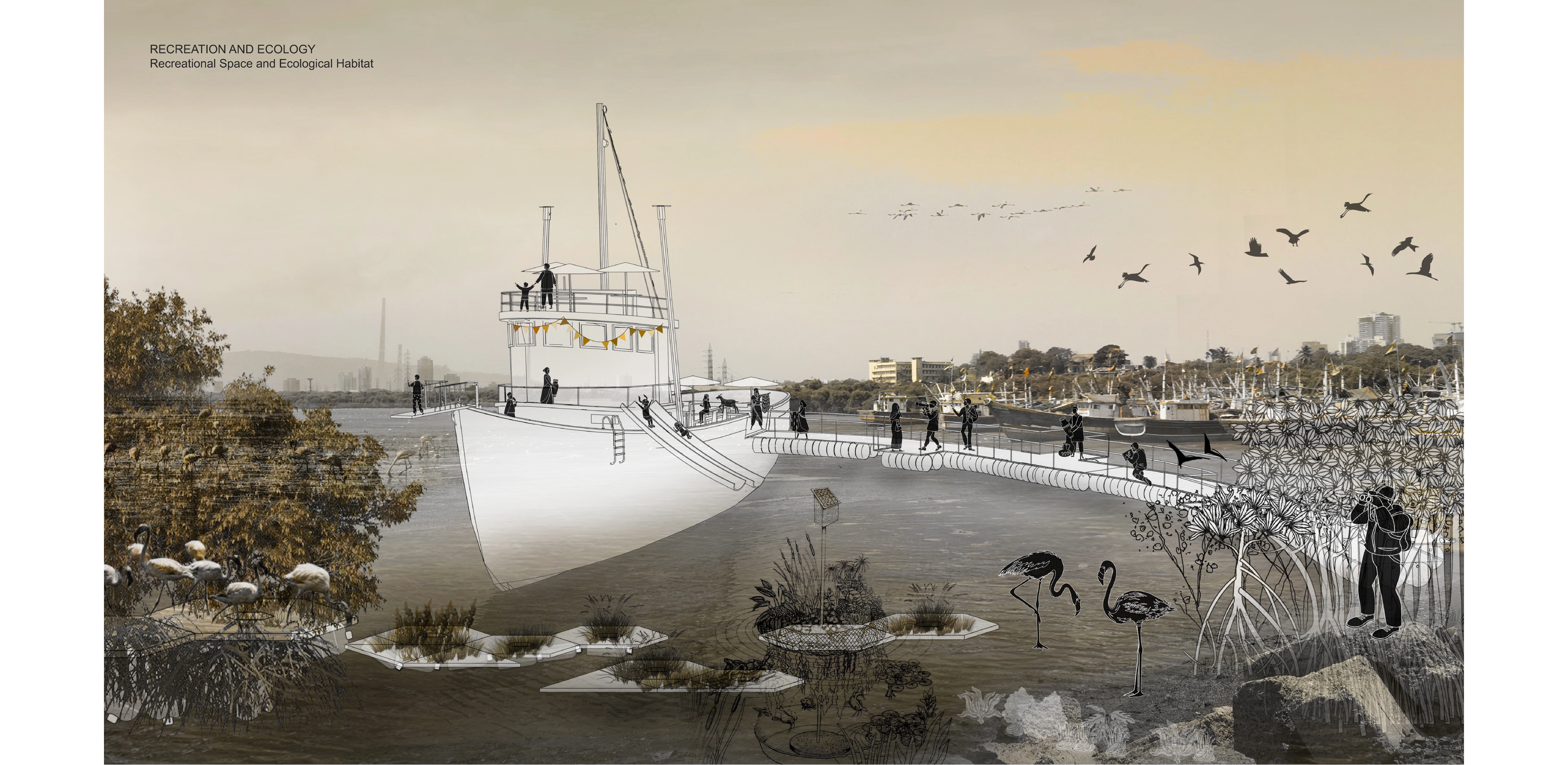 Mumbai’s eastern harbor is characterized by jarring juxtapositions of flamingo habitats and maritime wreckage, or historic fishing villages and petroleum plants. This proposal aims to harvest and repurpose buoyant waste materials into floating islands that would enable aquatic farming and become flamingo habitats, propelling newfound commitment to the waterfront. Industrial pollution causes blue algal blooms, upon which the flamingos feed, yet the pollution harms other marine growth. A design that recognizes the many local cultural conventions encourages new mangroves and pollution treatment ponds, which would serve multiple purposes, such as reducing toxins while promoting aquaculture that would continue to sustain nearby fisherfolk.