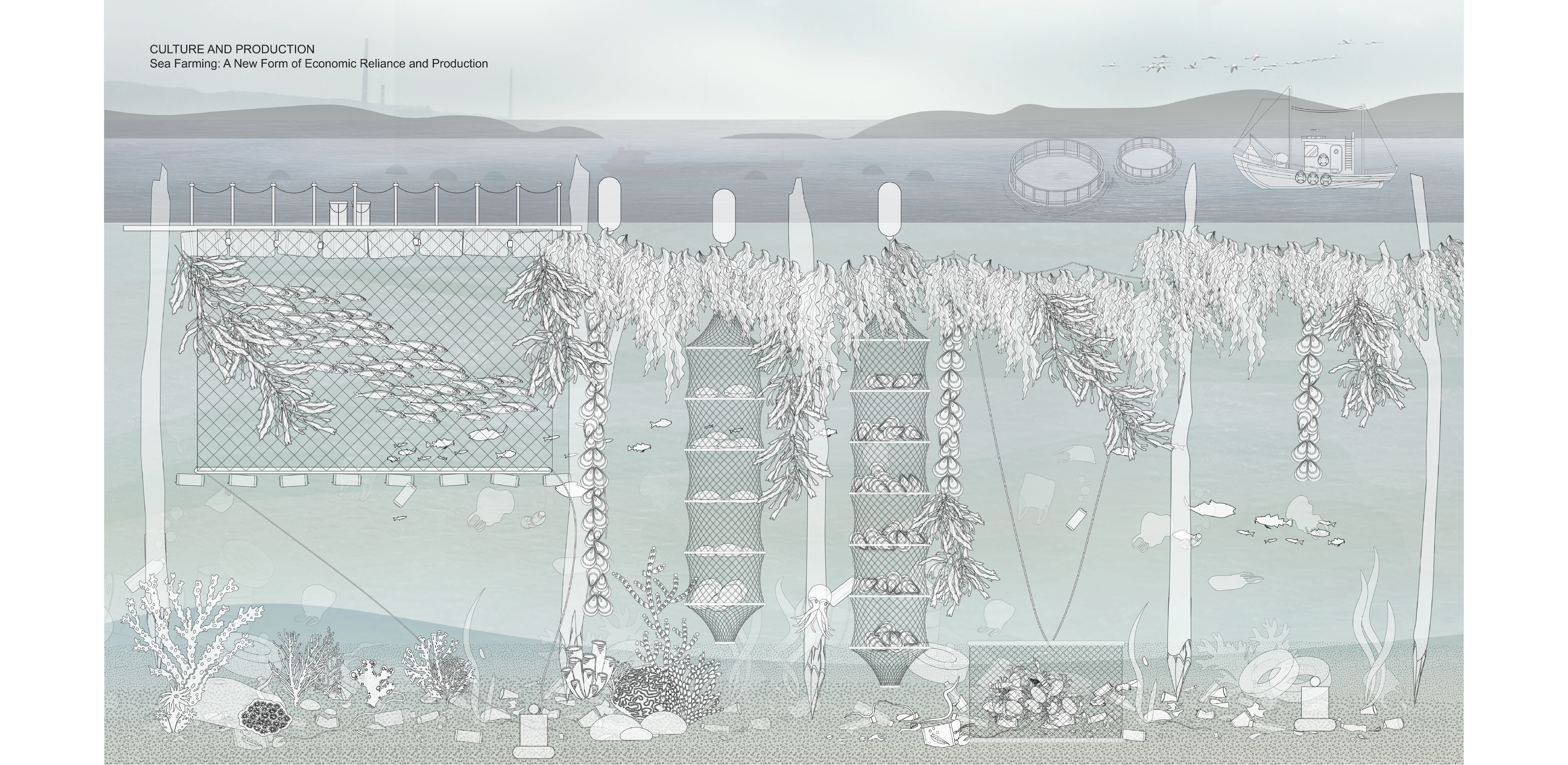 This process will allow sea farming materials to continue to filter nitrogen and carbon dioxide, restoring the old fishing culture, re-establishing the local community’s economic reliance, and extending the experience of the water further into the sea. This sea farming intervention can be simply constructed by using large planks of wood or metal beams to make the frame, and recycled plastic bottles will be used for the floating platform.