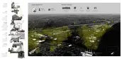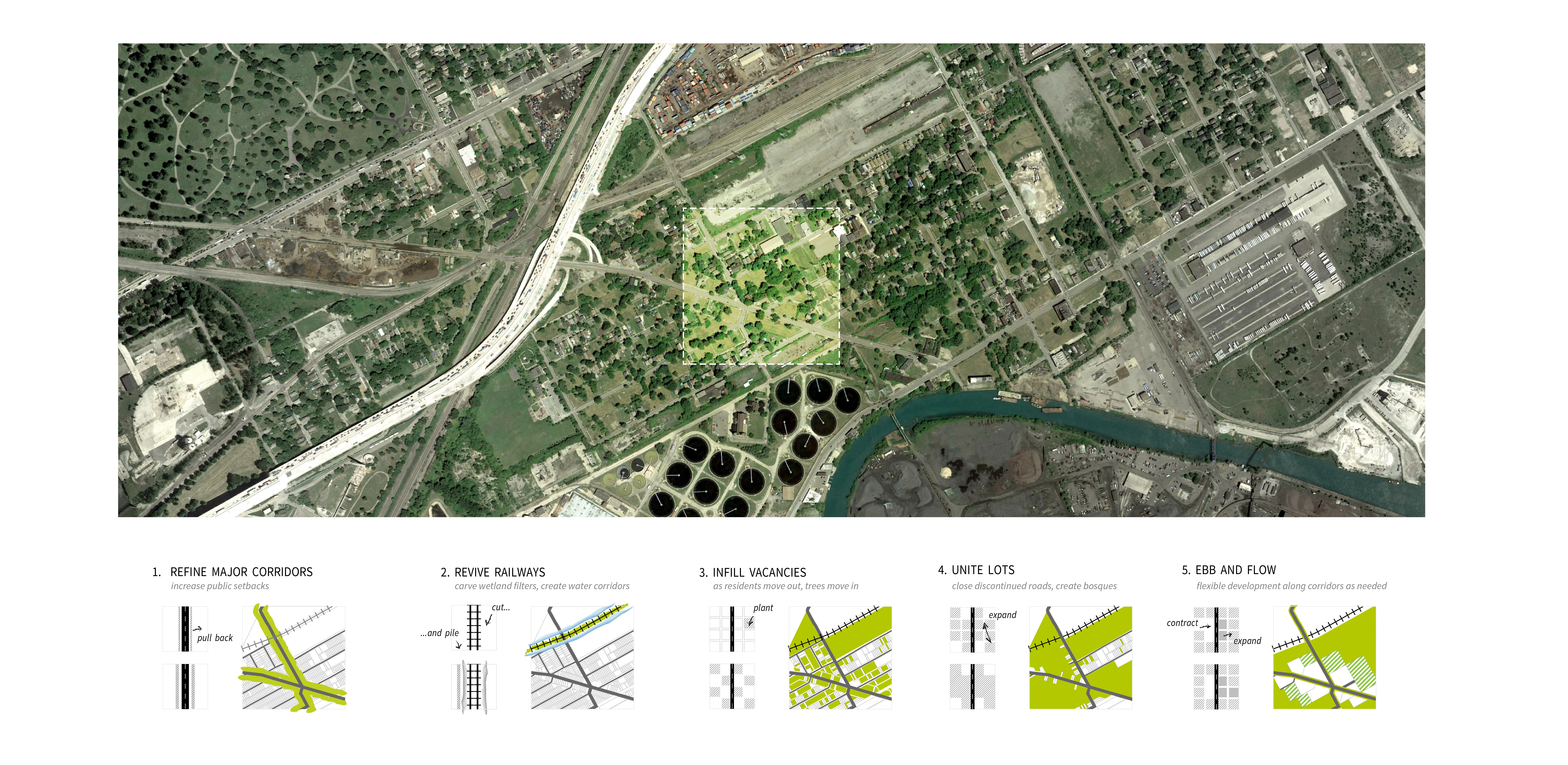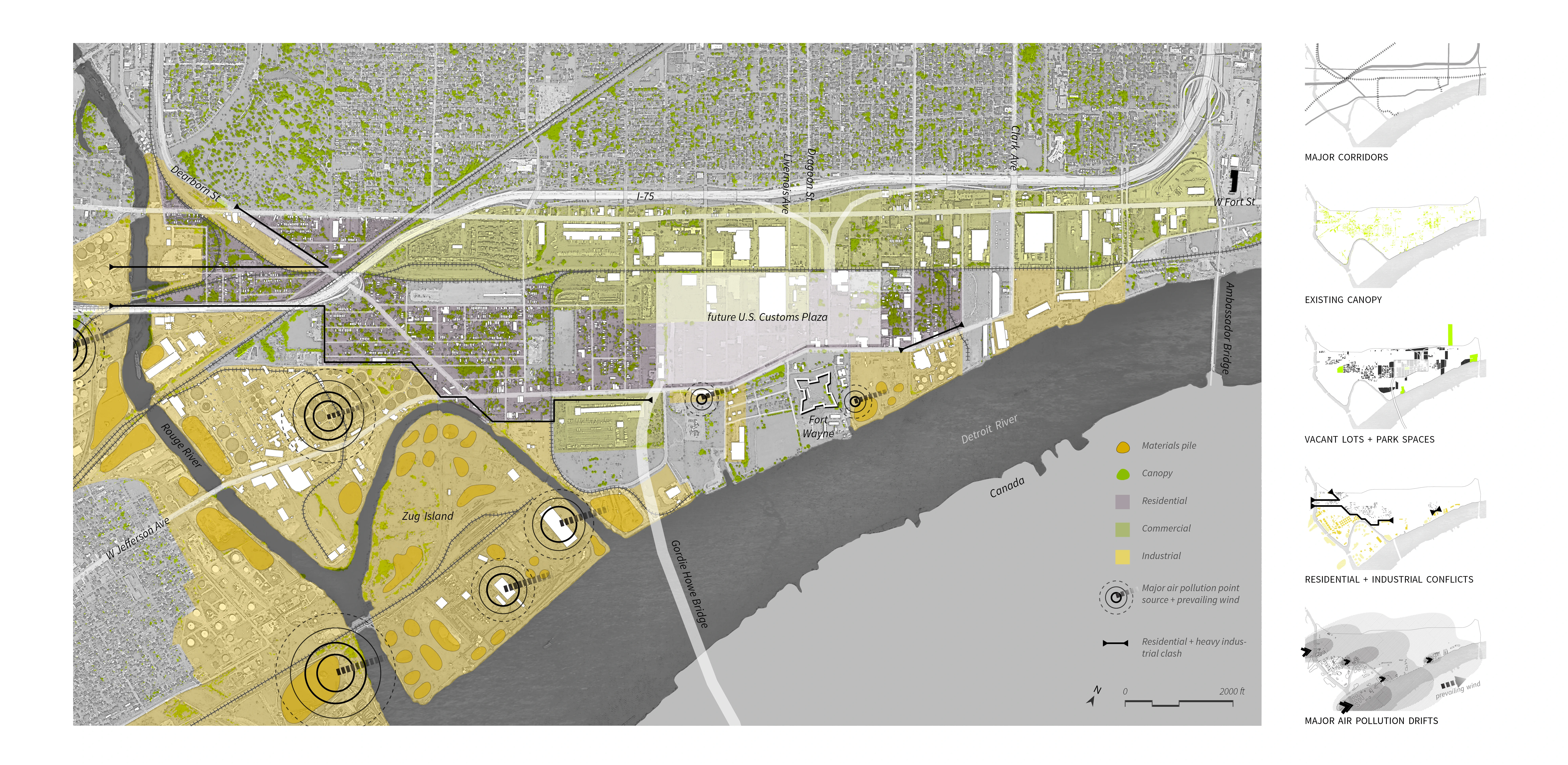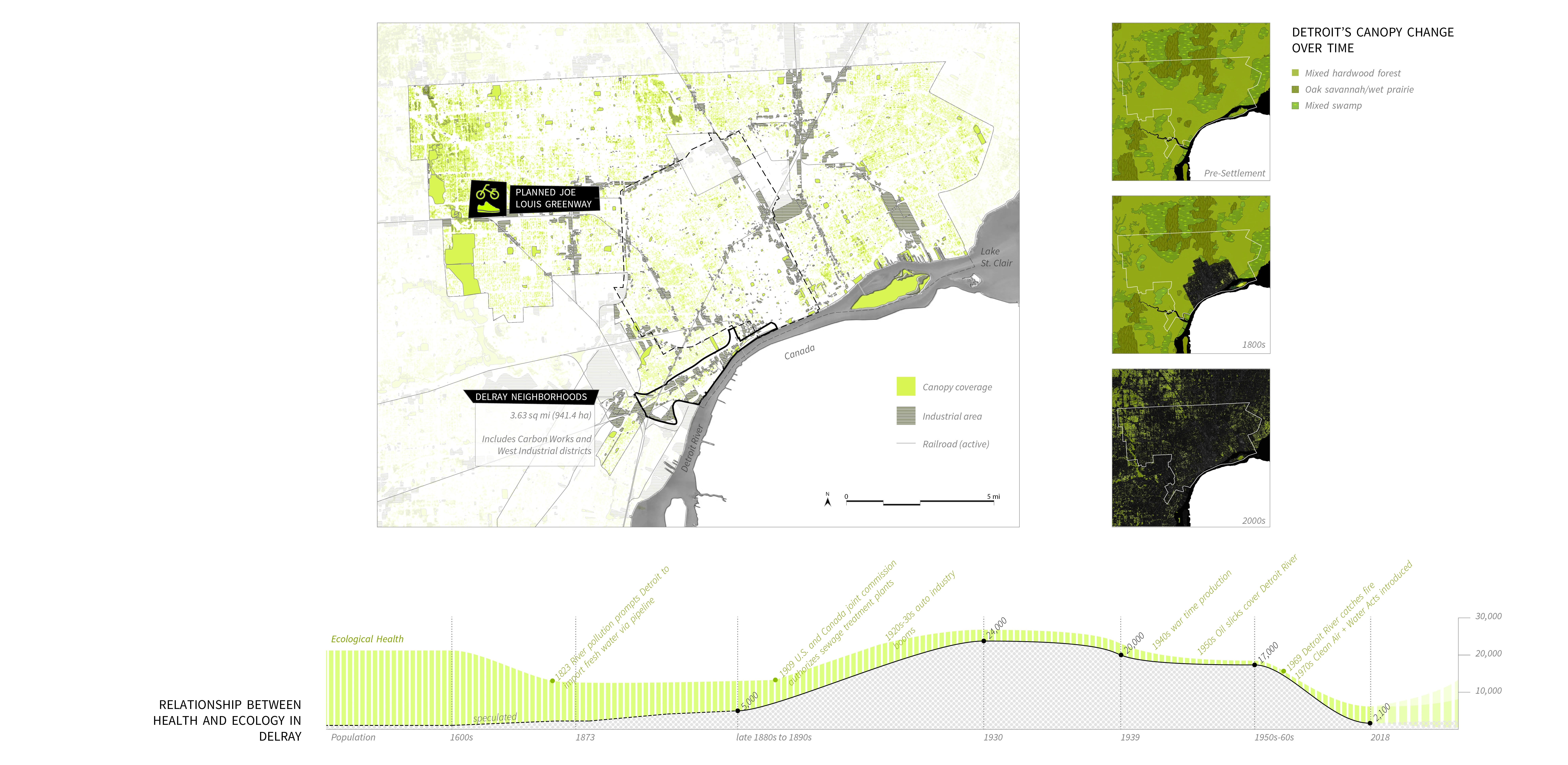 Detroit, a post-industrial city, is experiencing the aftershocks of intensive industrial development, industrial collapse, and sudden depopulation. After rapid decentralization of the auto industry, the one-time “motor city” powerhouse is now dealing with wide-scale blight and an under-funded, underused urban infrastructure originally built around cars and manufacturing. The Delray neighborhood represents the most extreme of these post-industrial challenges. Remaining inhabitants suffer from respiratory illnesses and cancer as neighborhood lots continue to be zoned for heavy industry. This project finds opportunity in these conflicts to develop an urban template for health, resiliency, and sustainable land use. The green infrastructure proposed here symbiotically knits incompatible land uses together, providing spaces to inhabit that simultaneously fortify its inhabitants, cleaning the air they breathe. A series of windbreak hedgerow typologies target specific “ailments” in Delray’s infrastructure, providing an economically self-sustaining foundation that judiciously connects to the city’s existing healthy assets. In giving back to its underserved inhabitants, the Delray Carbon Forest reveals a new type of productivity that is possible for the post-industrial city.