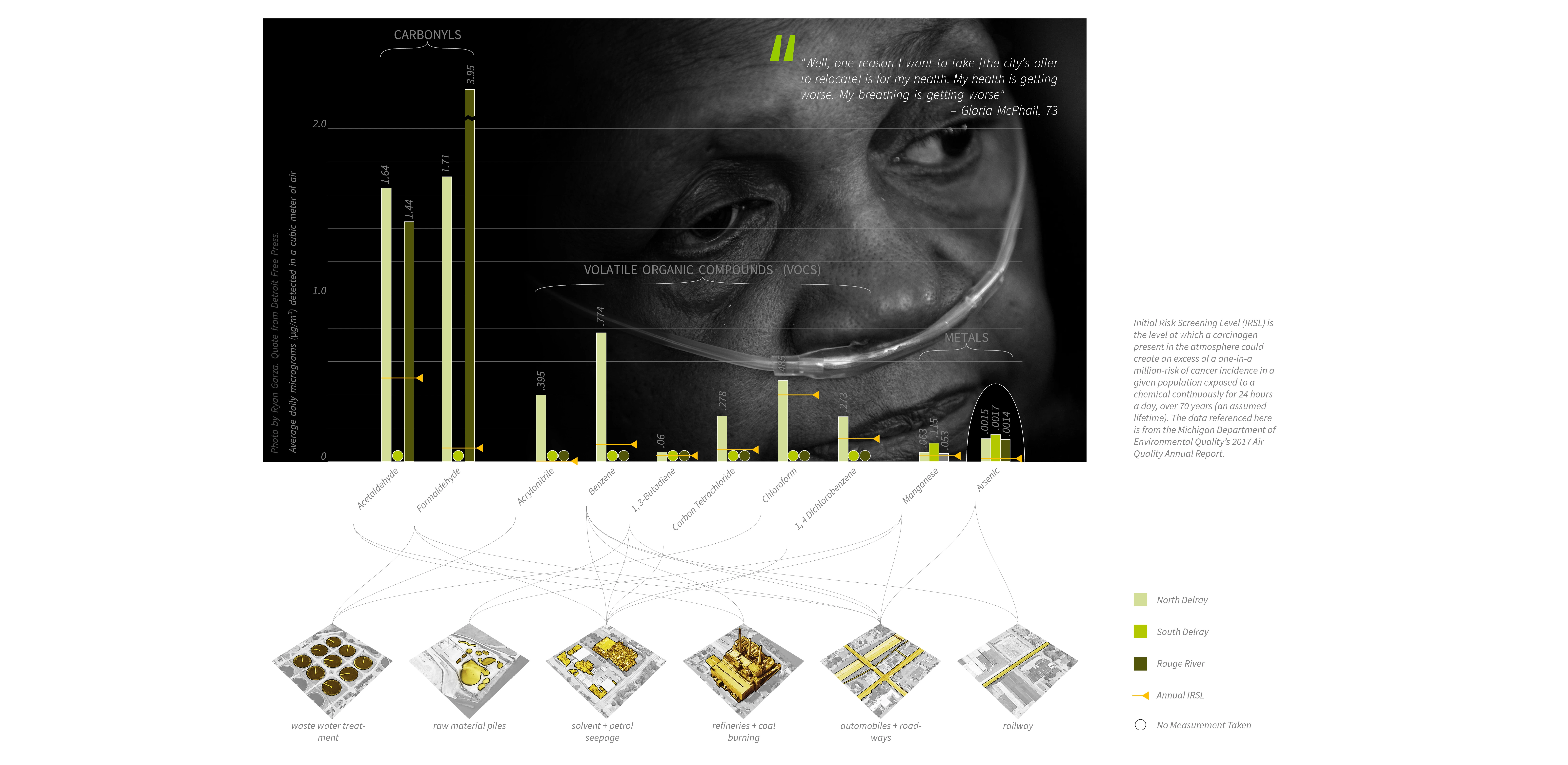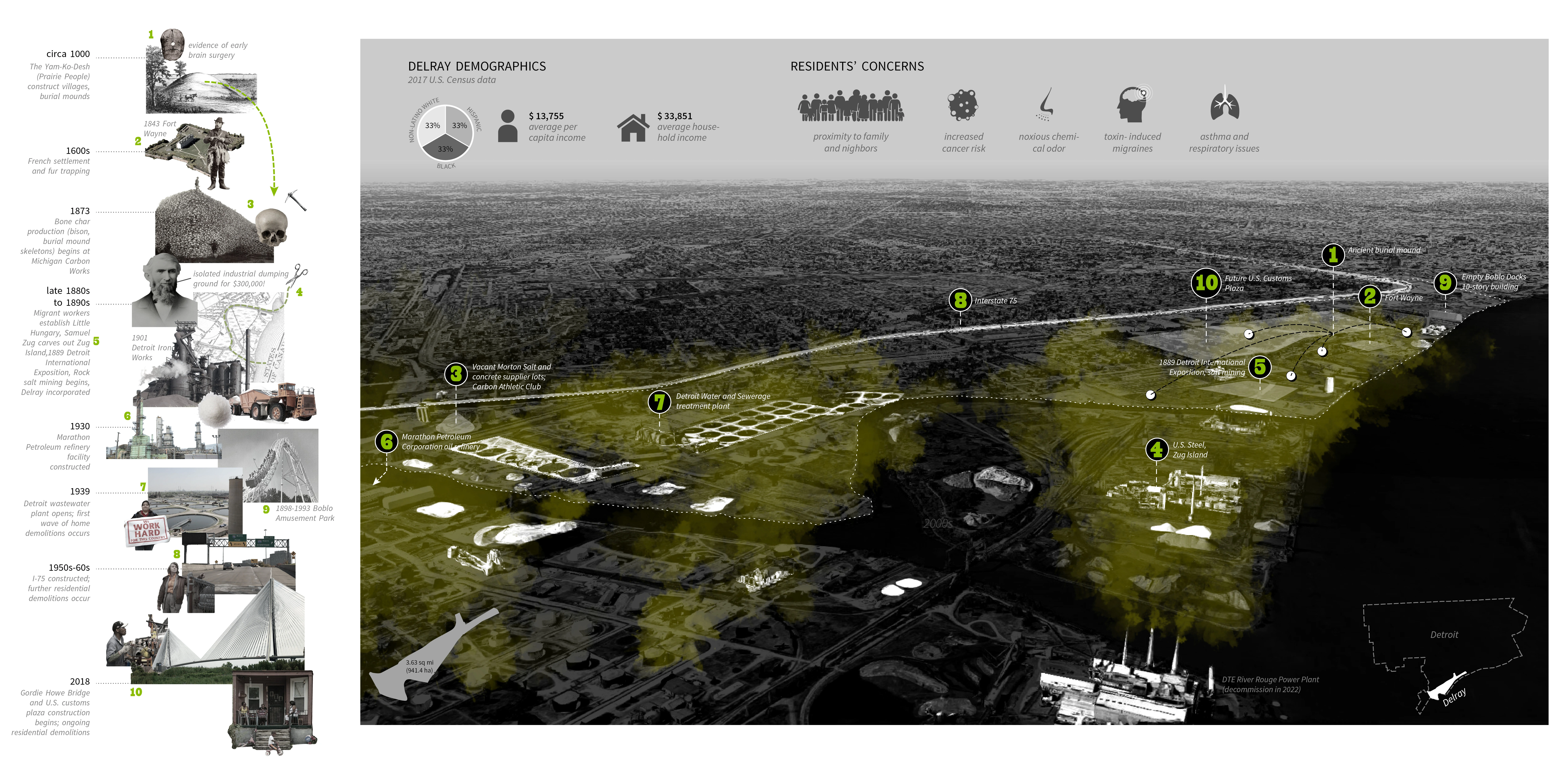 The legacy of social, economic, and ecologic inequality continues today. Delray is increasingly zoned for industry, even after the collapse of Detroit’s auto industry. A new U.S. customs plaza underway, and its corresponding Gordie Howe Bridge linking to Canada, have displaced over 700 residents. Remaining residents contend with rising rates of cancer and respiratory illness due to smoke stacks, chemical seepage from manufacturing, and noxious, headache-inducing odors from the local Detroit Water and Sewerage Treatment plant. The reduction in population has meant a reduction in funding for infrastructure, a fact witnessed in the broken concrete and asphalt rubble of abandoned lots and underfunded roads.