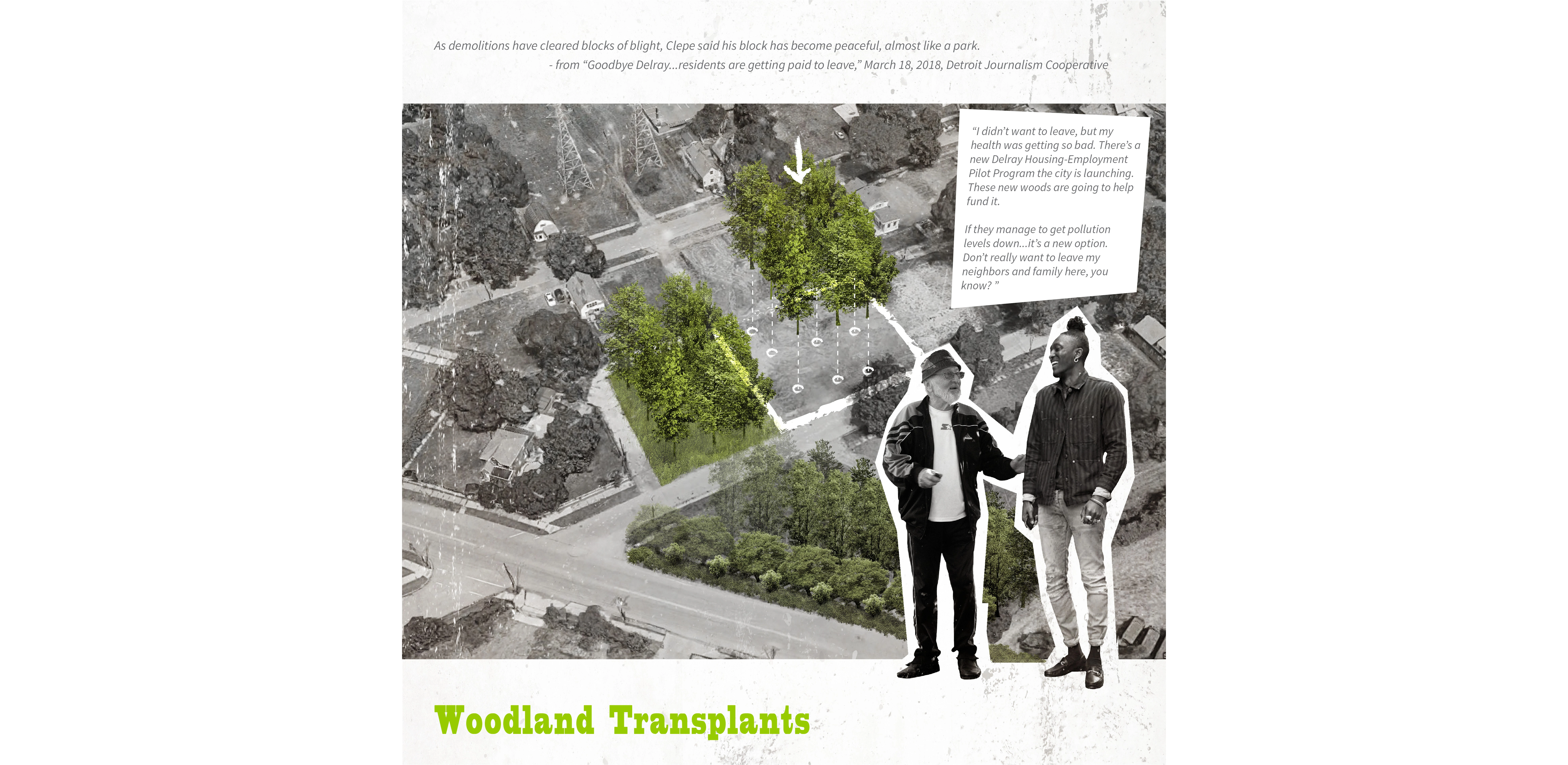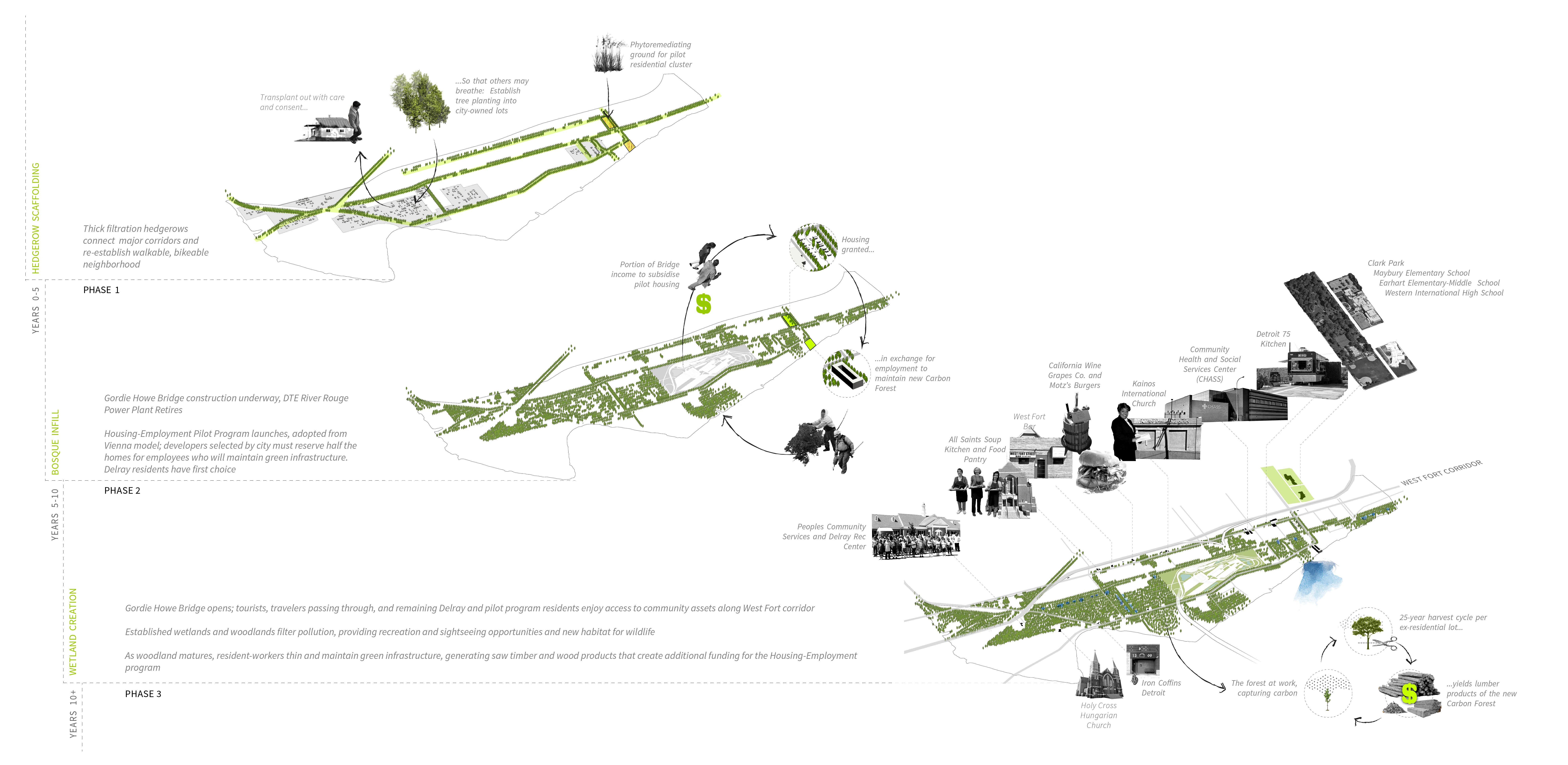 The Delray neighborhood of Detroit has faced a number of setbacks since its economic height, including depopulation, crumbling infrastructure, and respiratory ailments caused by the industry that once made the neighborhood thrive. Re-planting Delray would go a long way toward lessening the air quality effects that residents have borne in recent decades, starting with hedgerows along major corridors that buffer residents from transit noise, particulates, and fumes. A second phase would expand this approach outward in secondary corridors, infilling vacant properties with bosques to be maintained and harvested by locals, thus becoming a refreshing and revitalizing economy to replace greenhouse gasses with greenery.