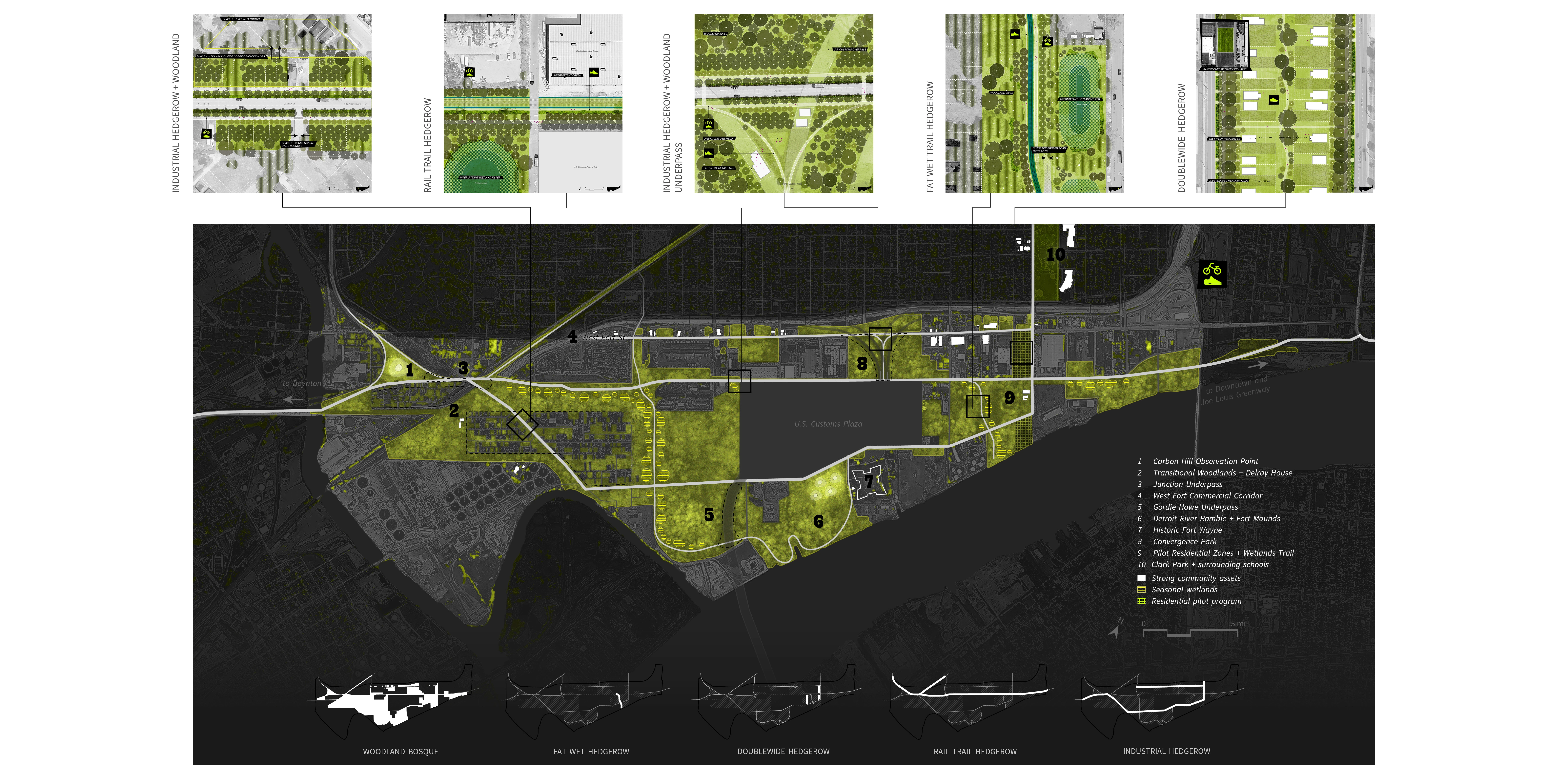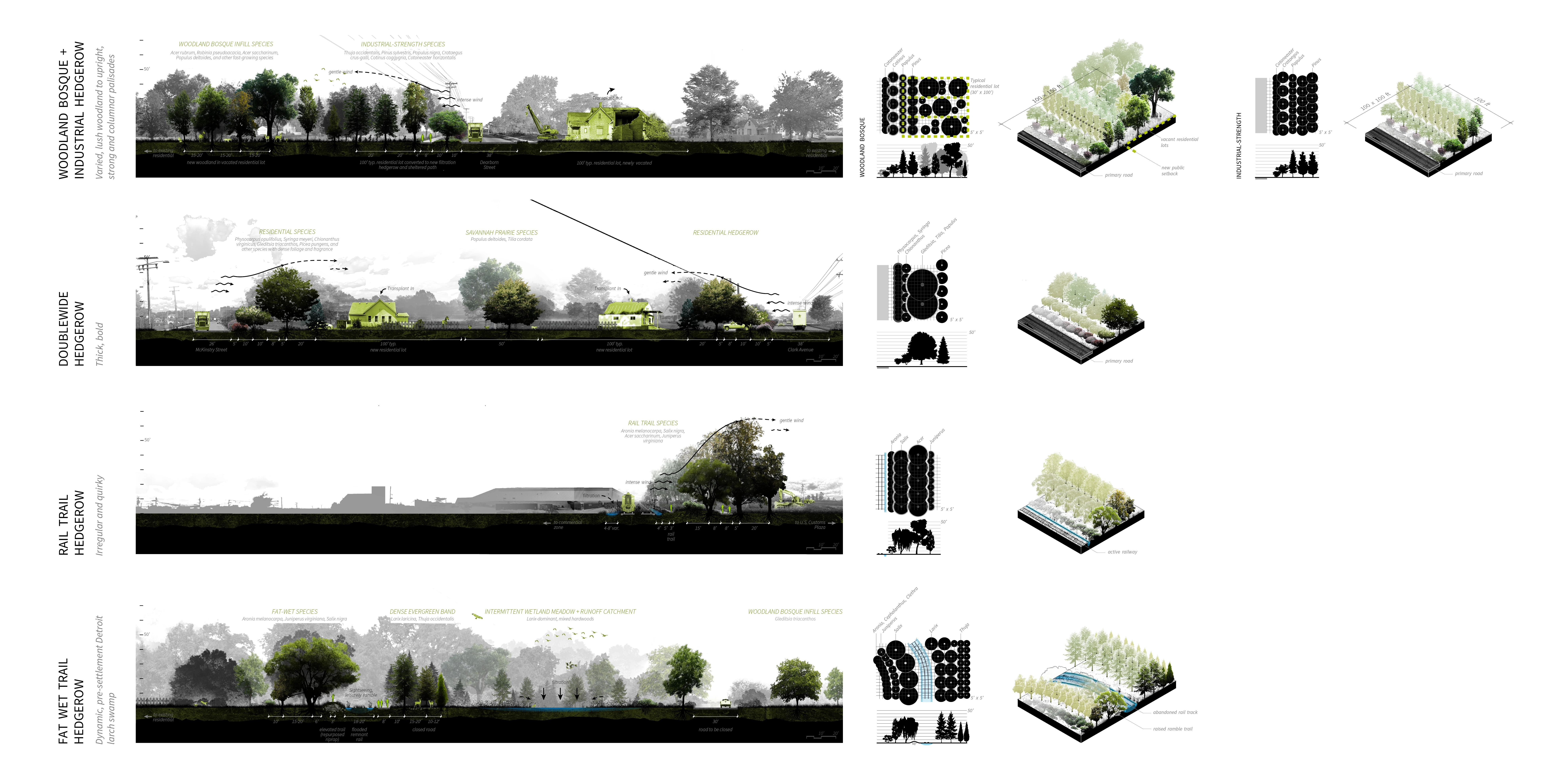 Air pollution drift is the biggest and most immediate health hazard in Delray. To address this problem, the green infrastructure uses a multi-scalar strategy. On the macro-scale, the urban form with the most promise is the windbreak hedgerow, which consists of shrub, understory, and tall canopy layers. The plan’s hedgerows act as thick filtration and enrichment corridors that stitch together the disparate land uses in Delray. The neighborhood’s tight parcels and corridor-dominant spaces lend themselves to 5 landscape prototypes: