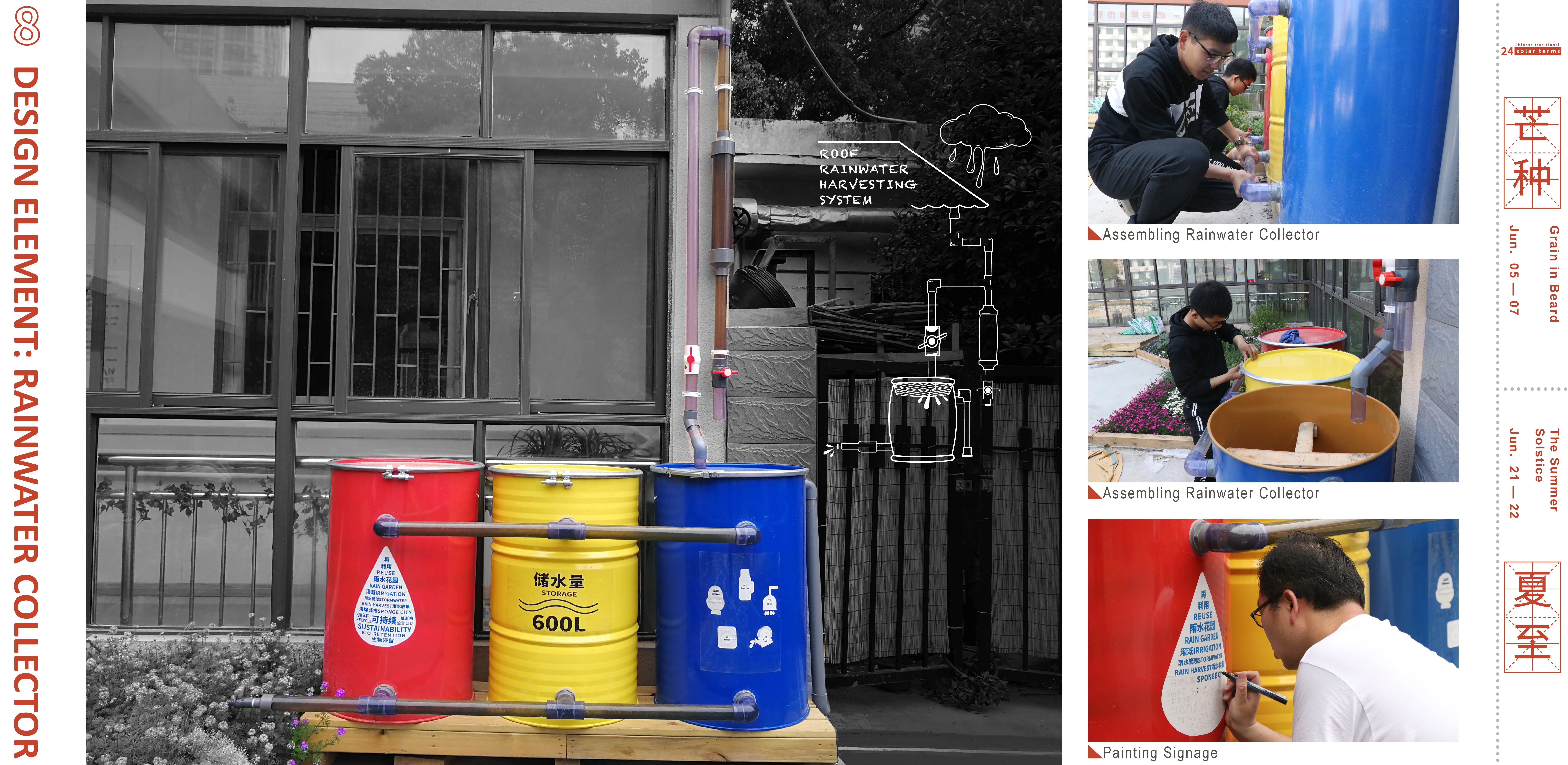 Rainwater Collector: The rainwater collection system directs rain from the roof to three 200-liter containers. Since the system used clear pipes, it can visually demonstrate the whole process of rainwater collection. Moreover, all the containers were painted with letters to further promote the concept and value of low impact development.